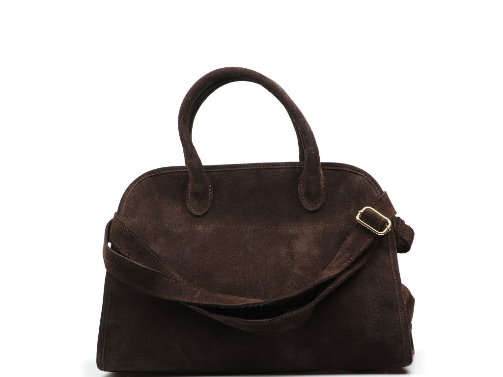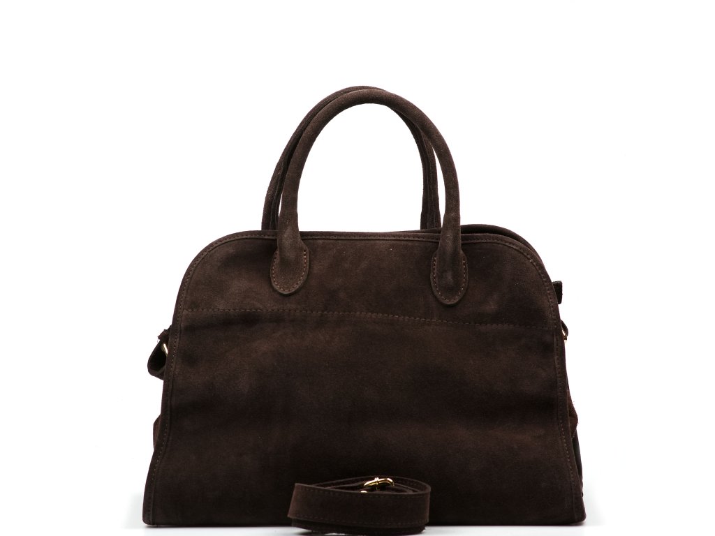 Velká kožená kabelka do ruky v tmavě hnědé barvě. Povrch kabelky má matnou semišovou úpravu, která podtrhuje její elegantní vzhled. Tvar je zaoblený, což zaručuje dostatek prostoru. Kabelka má k dispozici přídavný popruh pro nošení přes rameno. Interiér disponuje jednou velkou úložnou kapsou a malými po vnitřních bocích. Kabelka se uzavírá zipem.