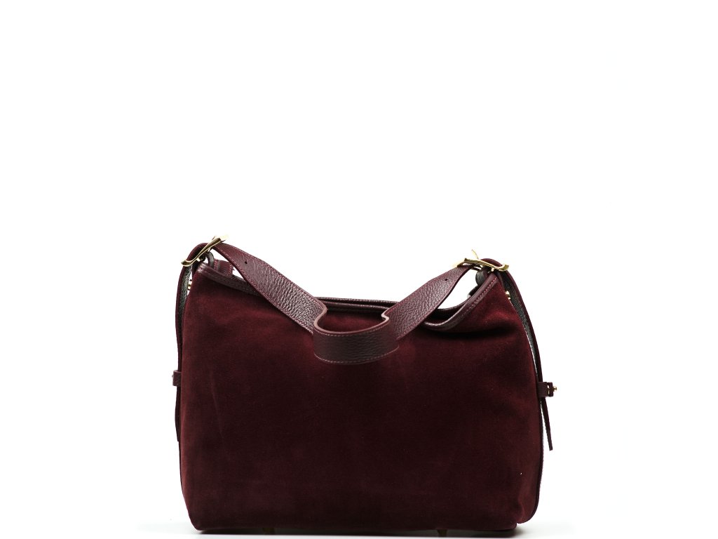 Semišová kožená kabelka přes rameno v bordó barvě. Interiér kabelky má k dispozici jednu úložnou kapsu a jednu malou boční na drobné věci, která se uzavírá zipem. Kabelka se uzavírá zipem.