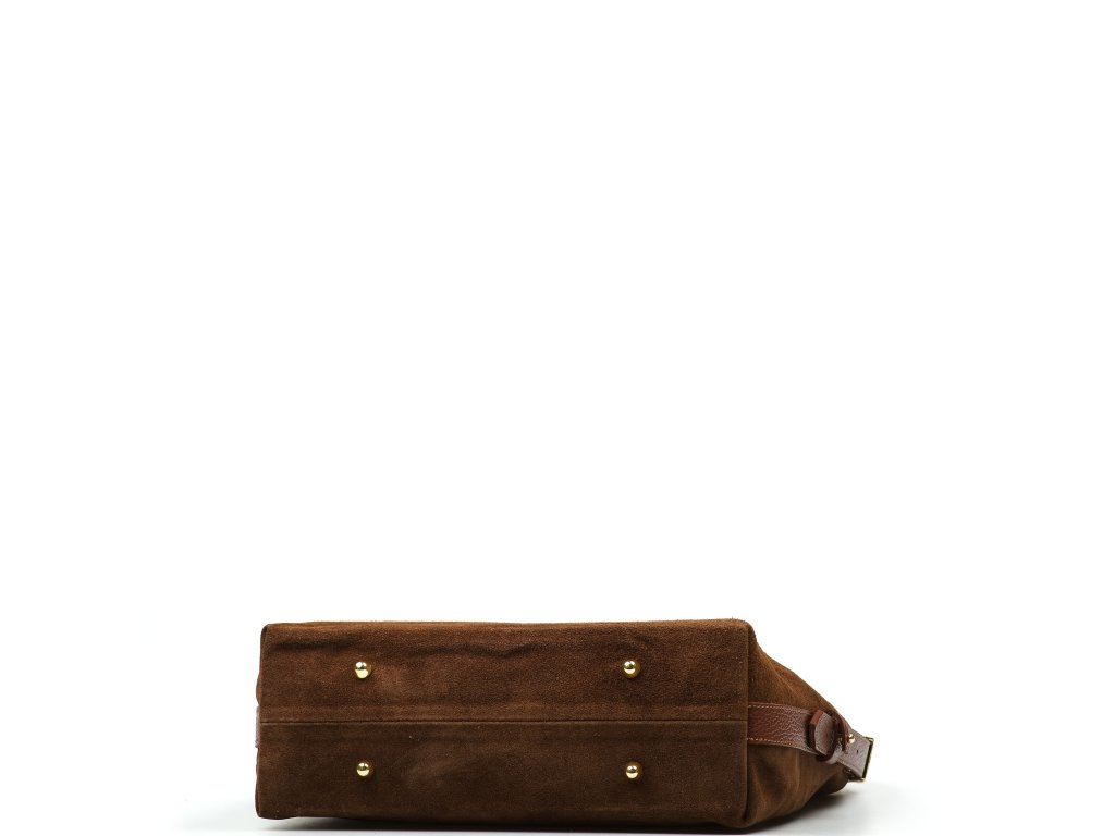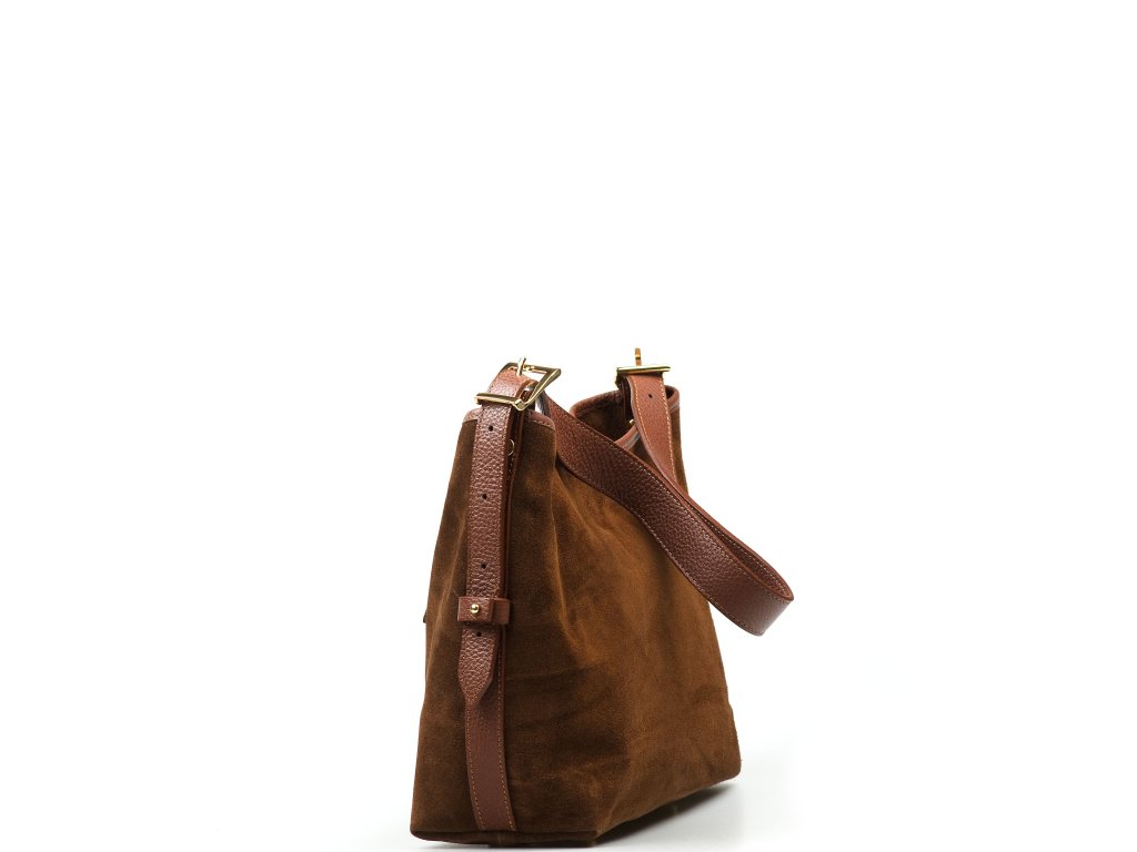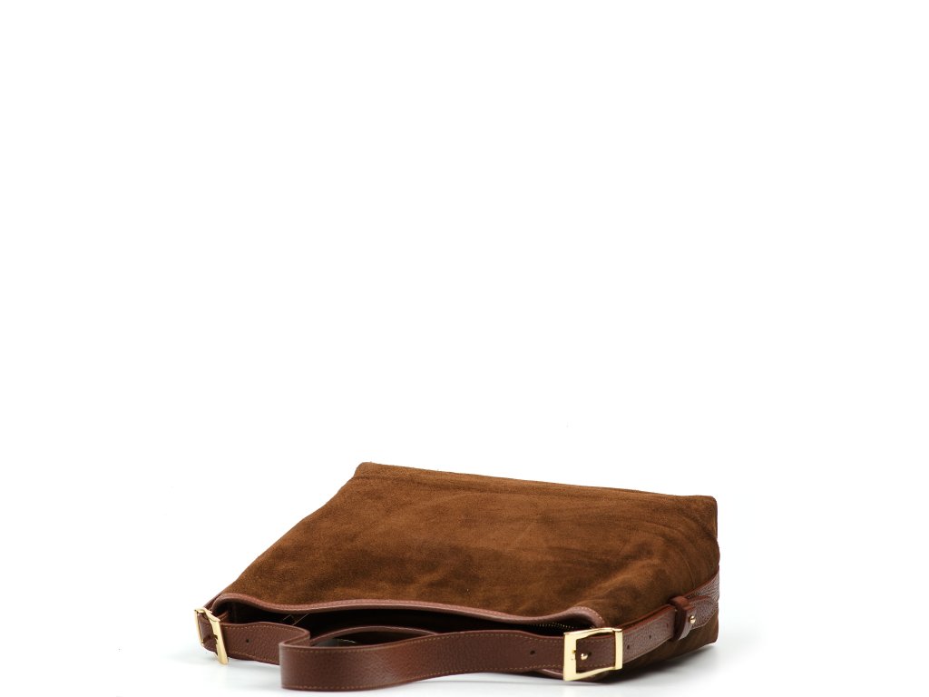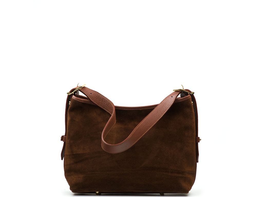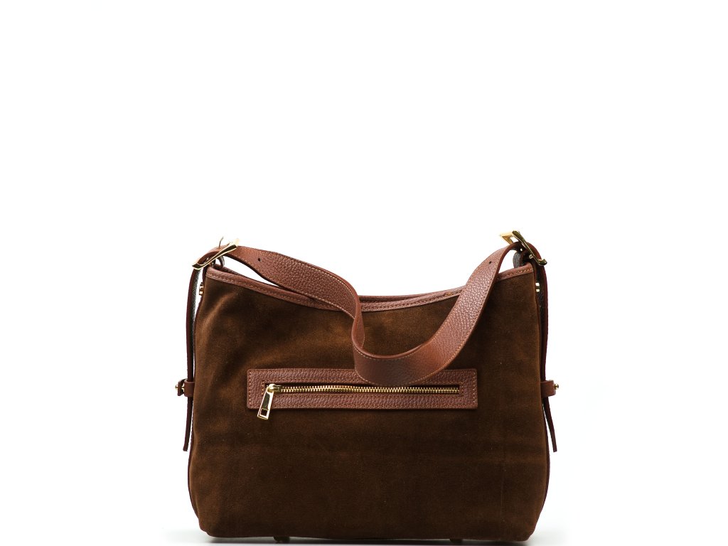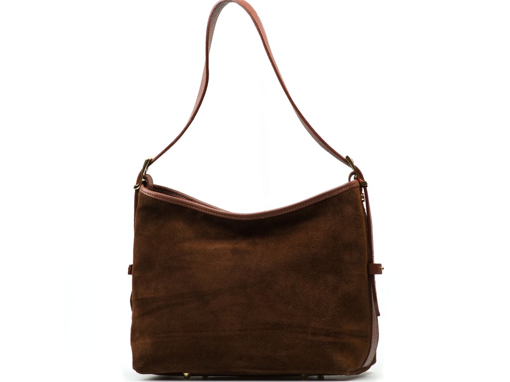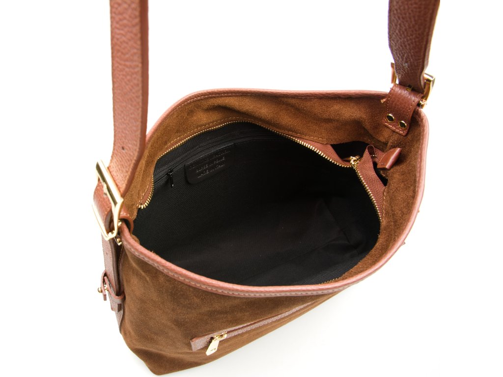 Semišová kožená kabelka přes rameno v hnědé barvě. Interiér kabelky má k dispozici jednu úložnou kapsu a jednu malou boční na drobné věci, která se uzavírá zipem. Kabelka se uzavírá zipem.