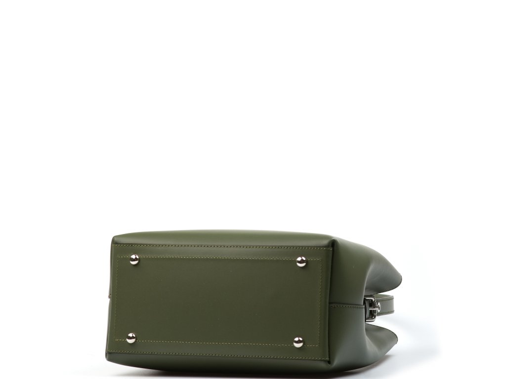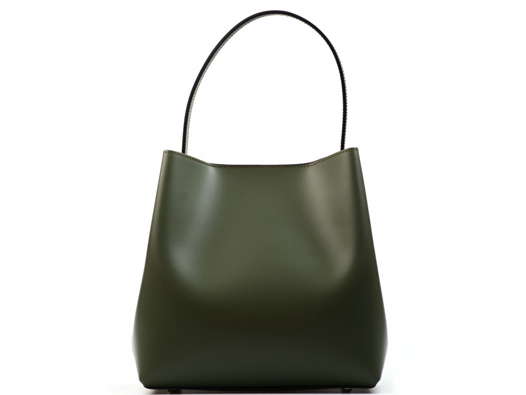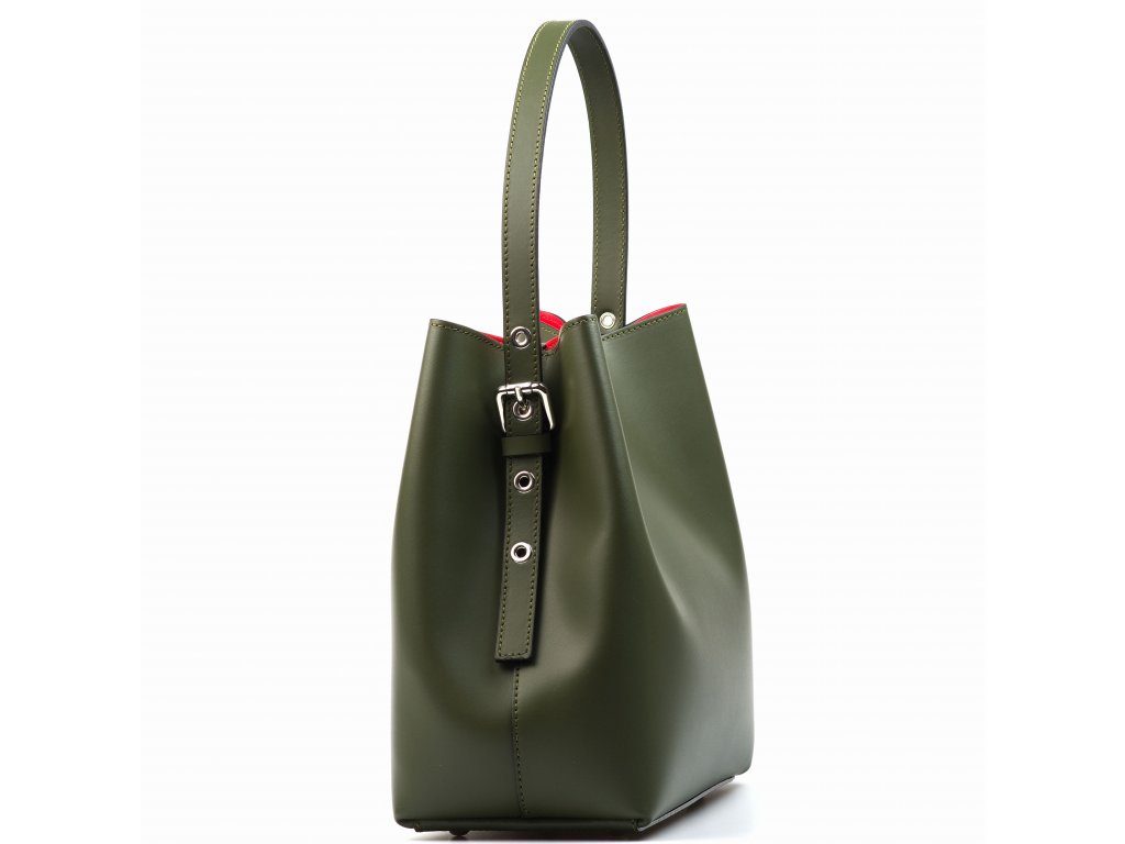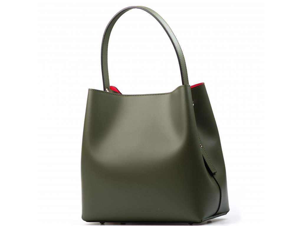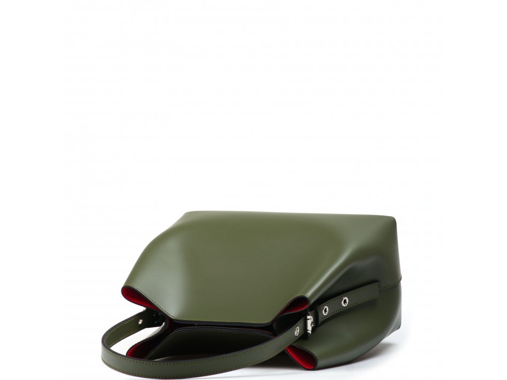 Dámská kožená minimalistická kabelka do ruky i přes rameno v olivově zelené barvě s červeným interiérem. Kabelka ve tvaru pytlíku má nastavitelnou délku držadla. Vnitřní část kabelky je bez podšívky s malou kapsičkou na zip. Nepřehlédnutelný je krásný detail červeného interiéru. Kabelka se zavírá cvočkem.