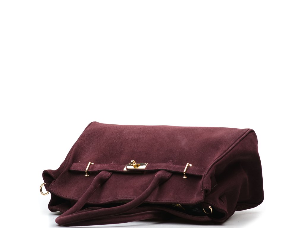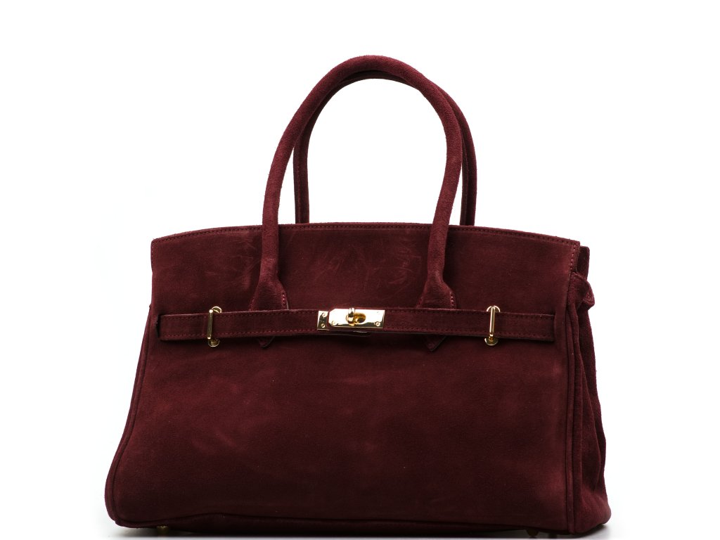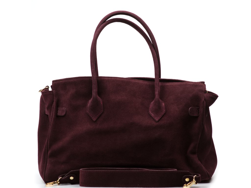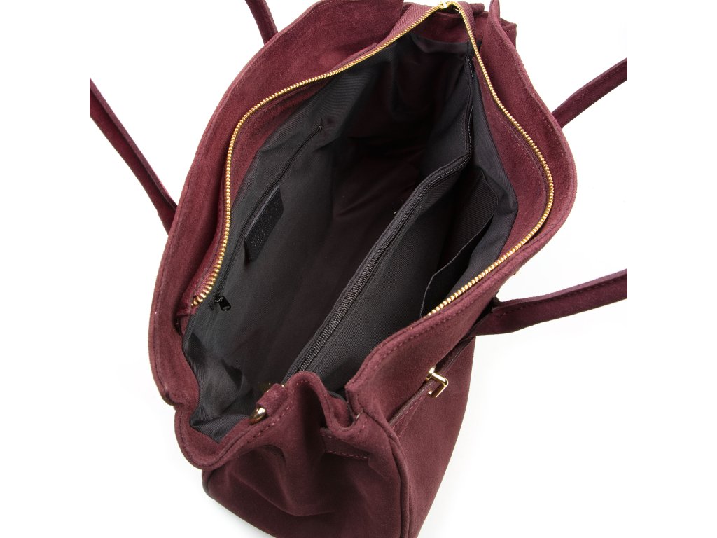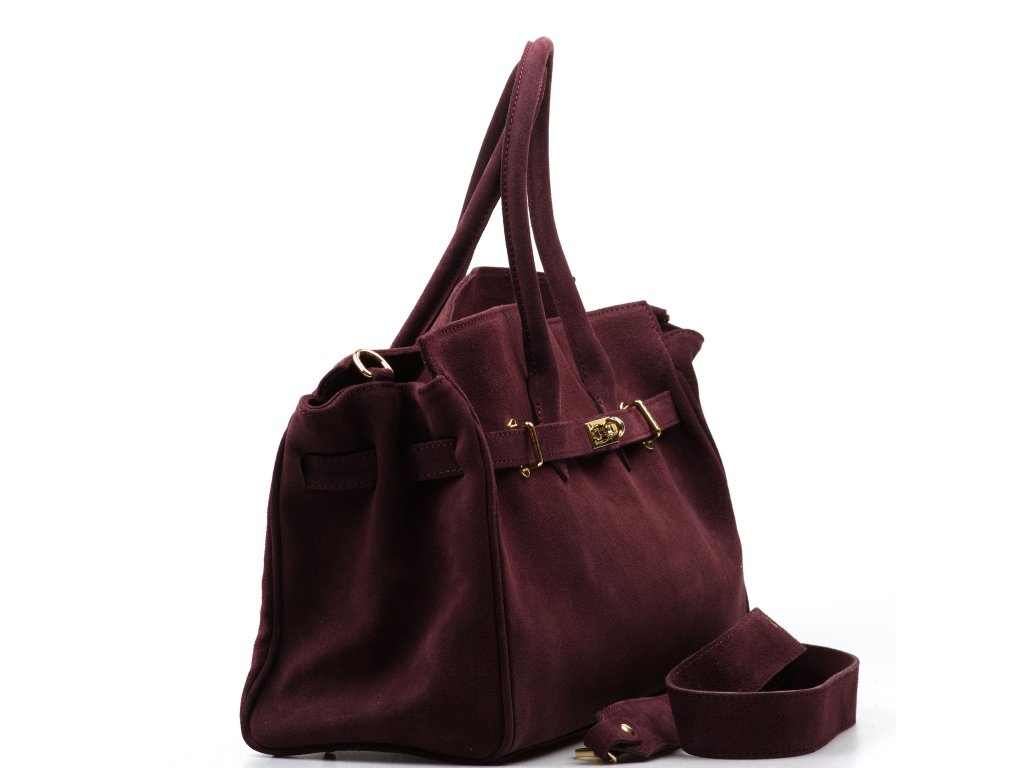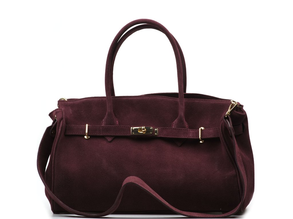 Kožená kabelka do ruky i přes rameno v bordó barvě. Interiér kabelky disponuje třemi kapsami, přičemž jedna je uzavíratelná zipem. Kabelka má i malé boční kapsy. Součástí kabelky je přídavný popruh s karabinami. Horní část kabelky zdobí kožený popruh se zlatými sponami.