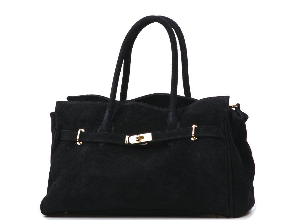 Kožená kabelka do ruky i přes rameno v černé barvě. Interiér kabelky disponuje třemi kapsami, přičemž jedna je uzavíratelná zipem. Kabelka má i malé boční kapsy. Součástí kabelky je přídavný popruh s karabinami. Horní část kabelky zdobí kožený popruh se zlatými sponami.