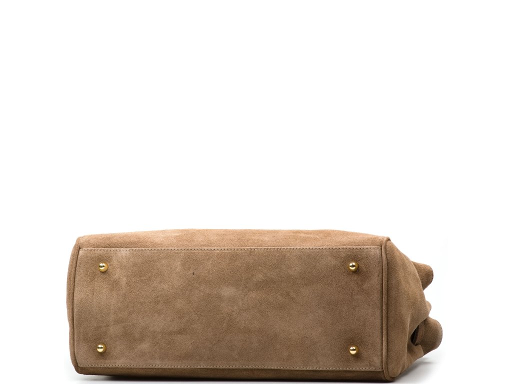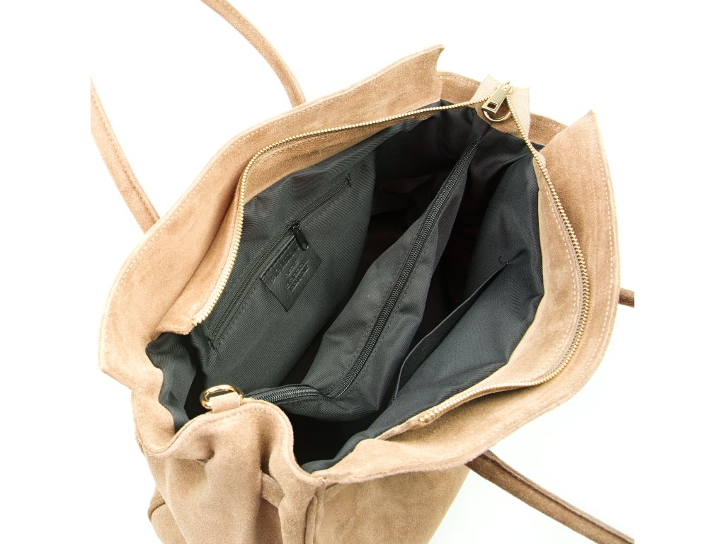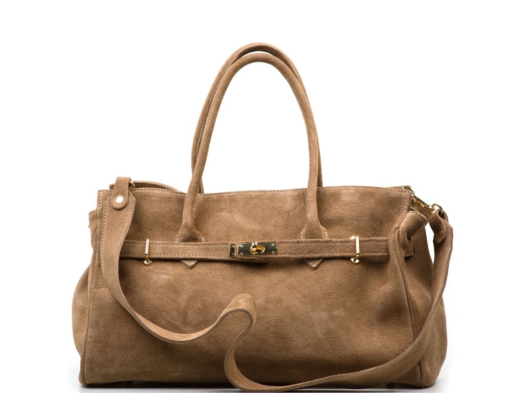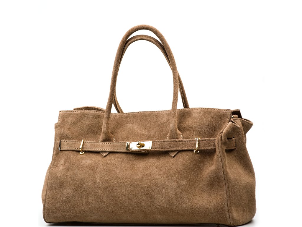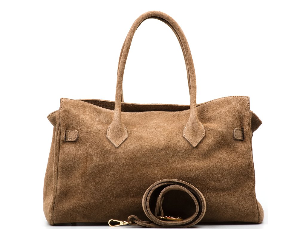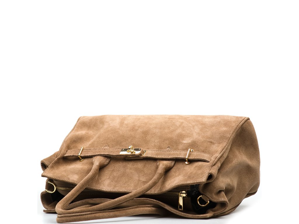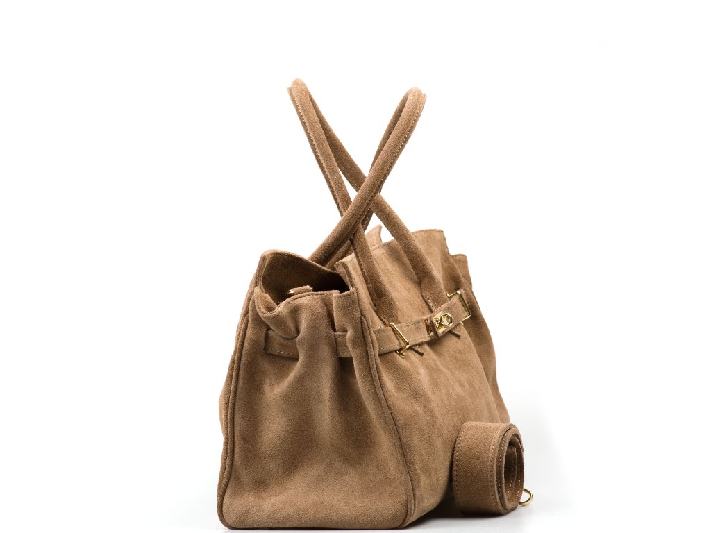 Kožená kabelka do ruky i přes rameno ve fango barvě. Interiér kabelky disponuje třemi kapsami, přičemž jedna je uzavíratelná zipem. Kabelka má i malé boční kapsy. Součástí kabelky je přídavný popruh s karabinami. Horní část kabelky zdobí kožený popruh se zlatými sponami.