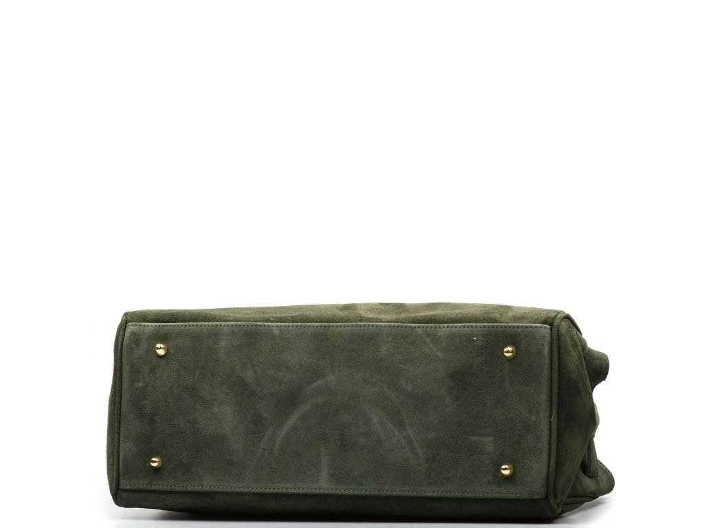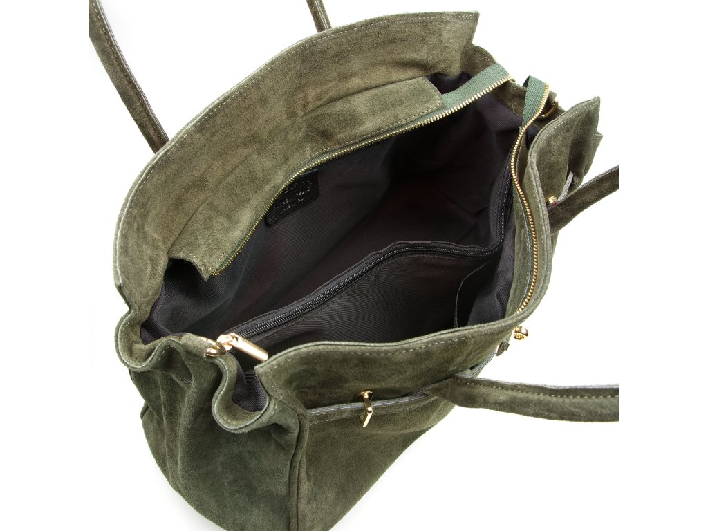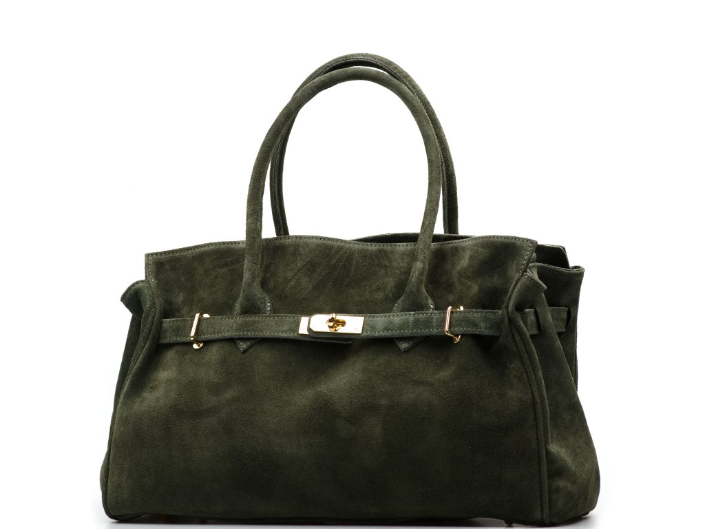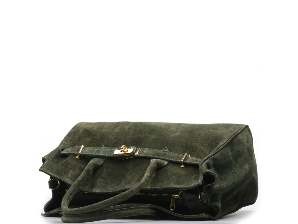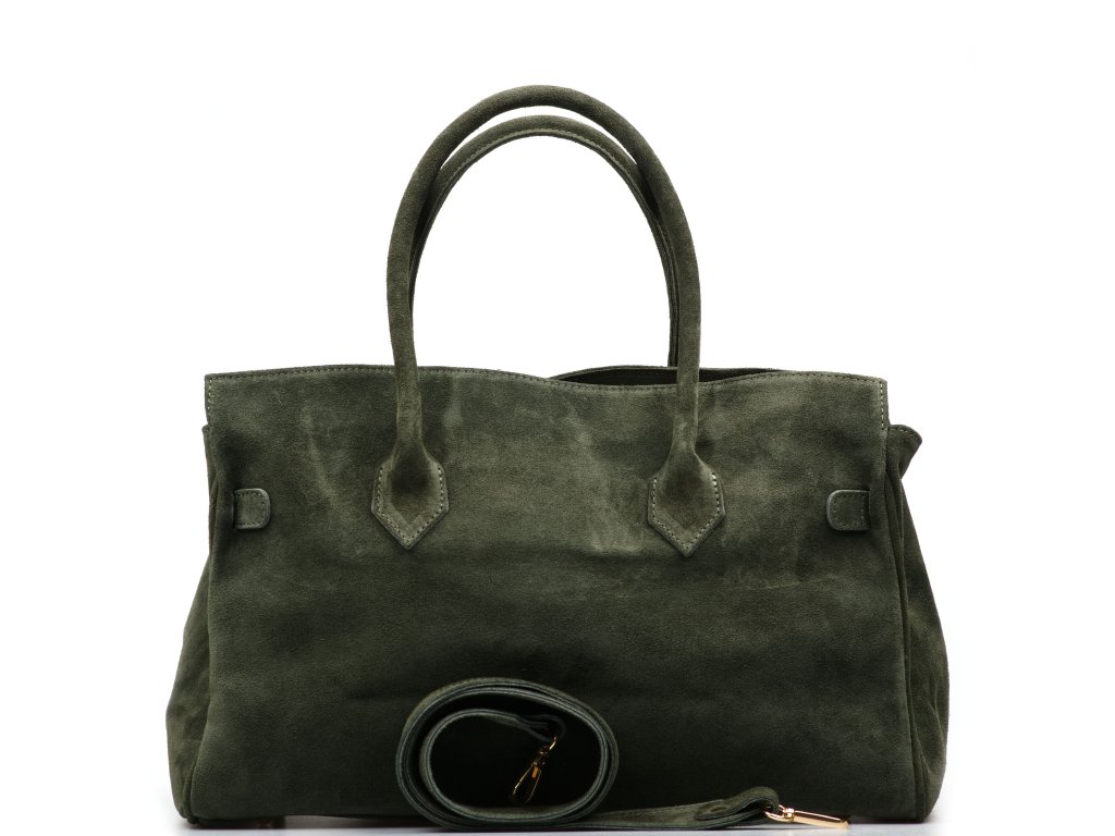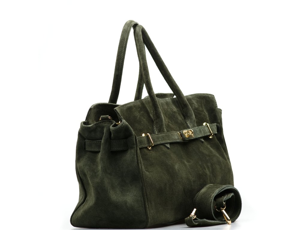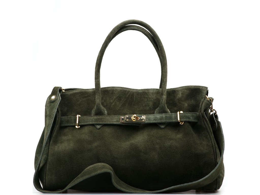 Kožená kabelka do ruky i přes rameno v olivově zelné barvě. Interiér kabelky disponuje třemi kapsami, přičemž jedna je uzavíratelná zipem. Kabelka má i malé boční kapsy. Součástí kabelky je přídavný popruh s karabinami. Horní část kabelky zdobí kožený popruh se zlatými sponami.