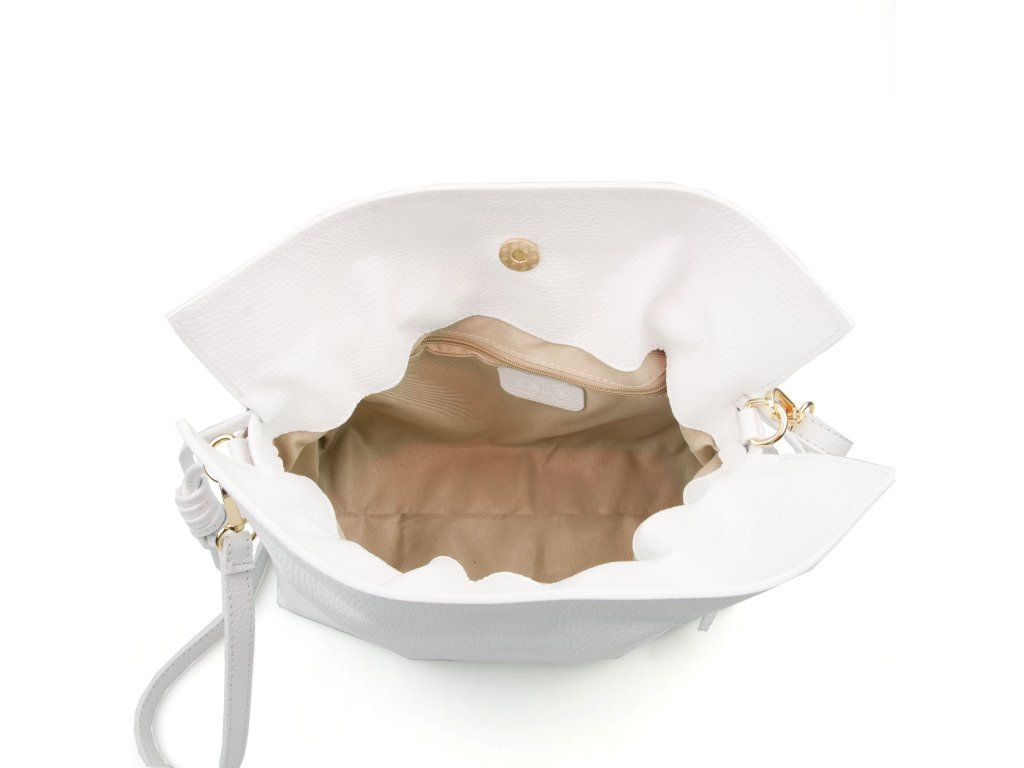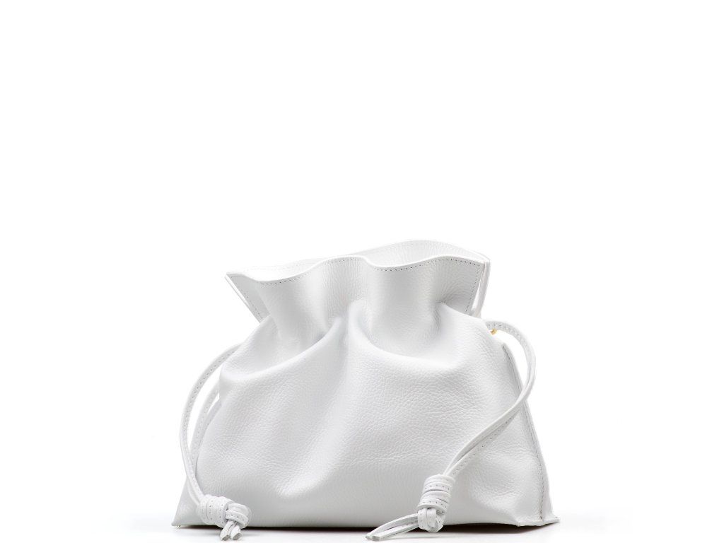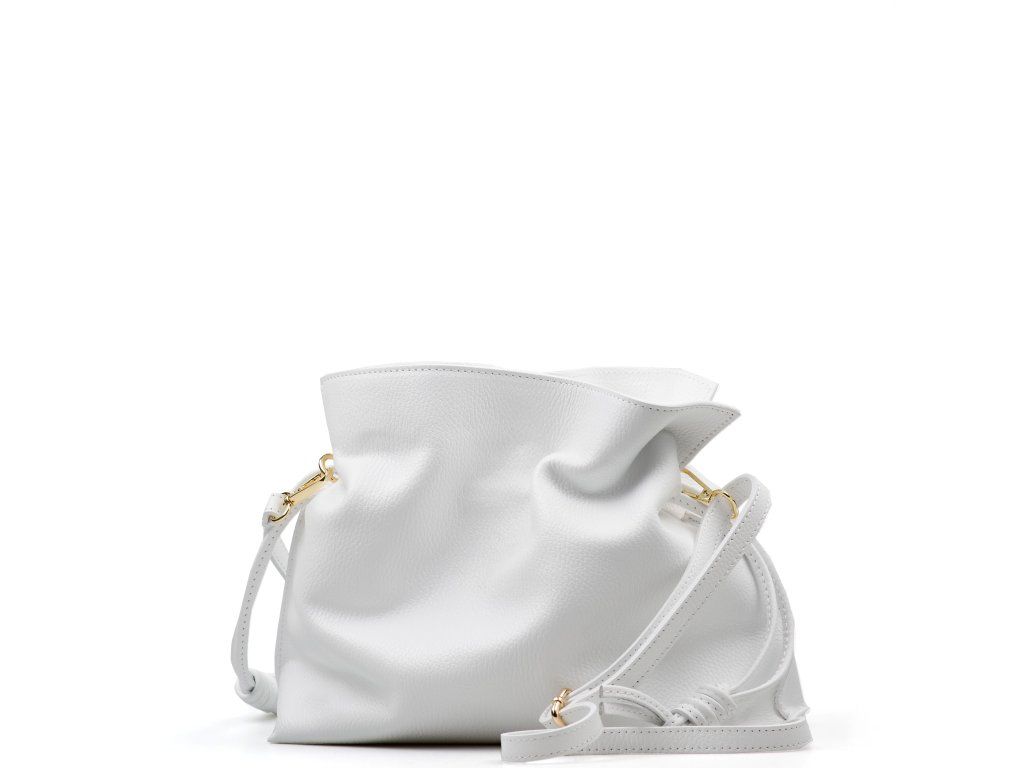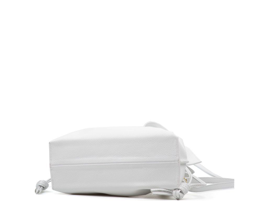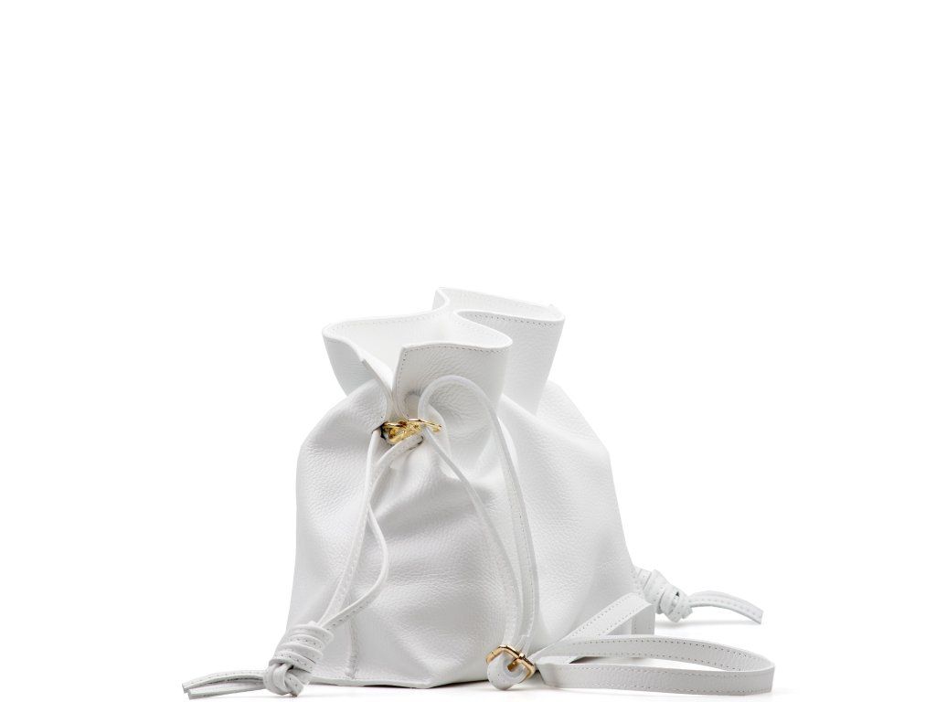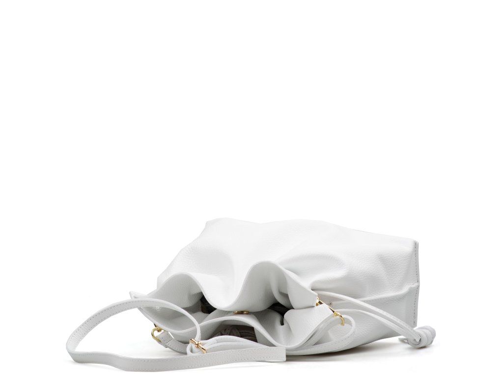 Kožená kabelka ve tvaru pytlíku v bílé barvě zaujme svým originálním designem a jemným zpracováním. V horní části se stahuje koženou šňůrkou, která vytváří efektní nařasení kůže a dodává kabelce šarm. Součástí je odnímatelný přídavný popruh s karabinami, díky kterému ji lze nosit nejen v ruce, ale i přes rameno či jako crossbody. Interiér nabízí jednu prostornou hlavní kapsu pro všechny nezbytnosti. Kabelka se uzavírá cvočkem a je ideálním doplňkem pro každodenní nošení i speciální příležitosti.
