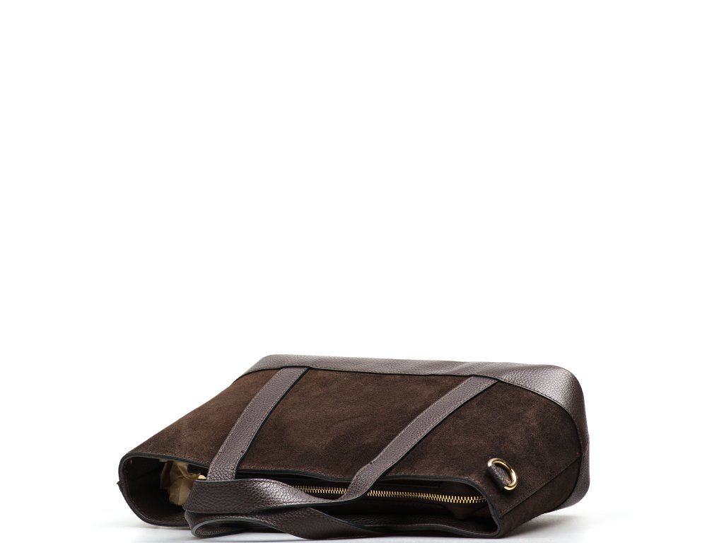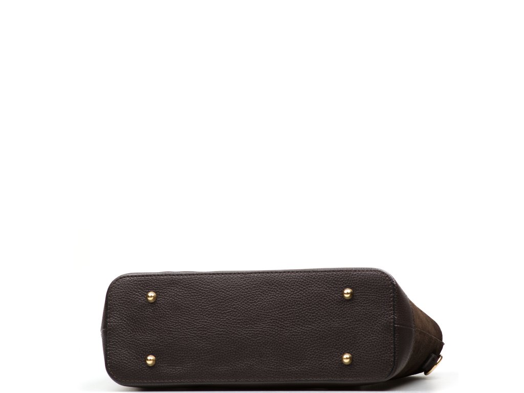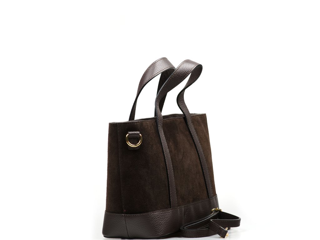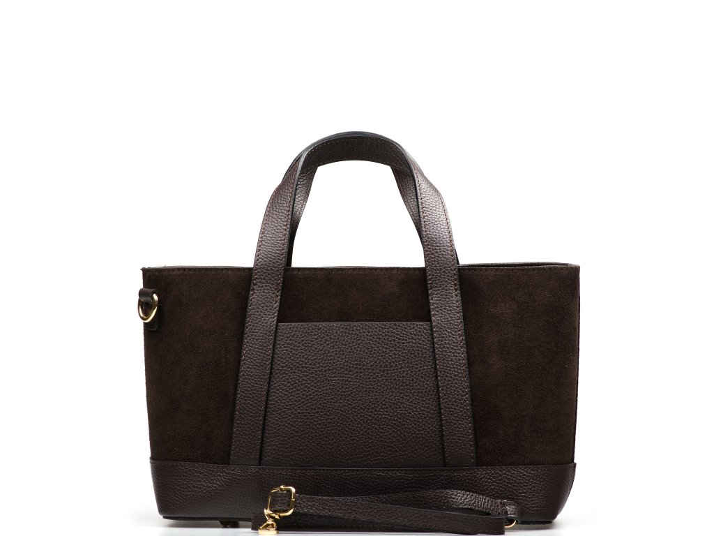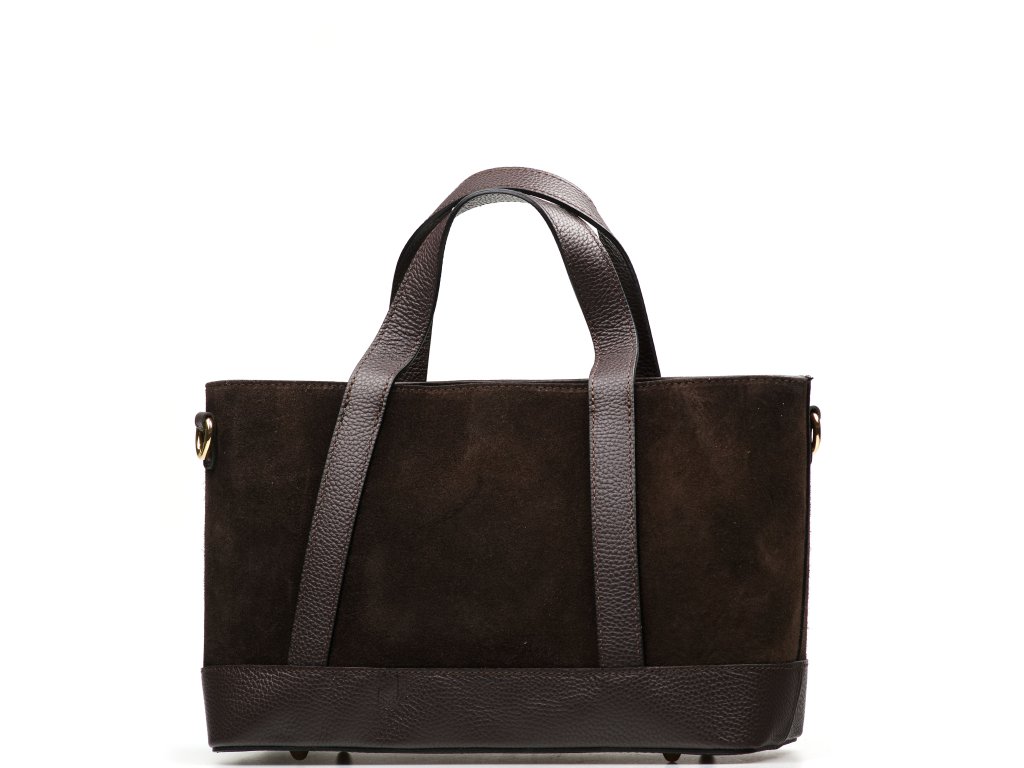 Semišová kožená kabelka do ruky či přes rameno v tmavě hnědé barvě působí stylově a nadčasově. Její matná semišová úprava podtrhuje sofistikovaný vzhled a dodává celku jemnou eleganci. Interiér nabízí jednu prostornou hlavní kapsu a malé boční kapsy. Kabelku zdobí kombinace hladké a semišové kůže, která jí dodává jedinečný charakter. Kabelka se uzavírá zipem, což zajišťuje bezpečné uložení všech nezbytností.