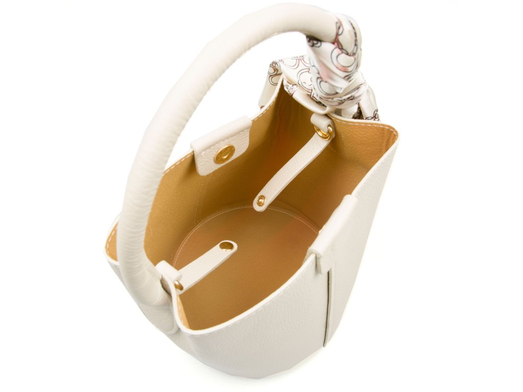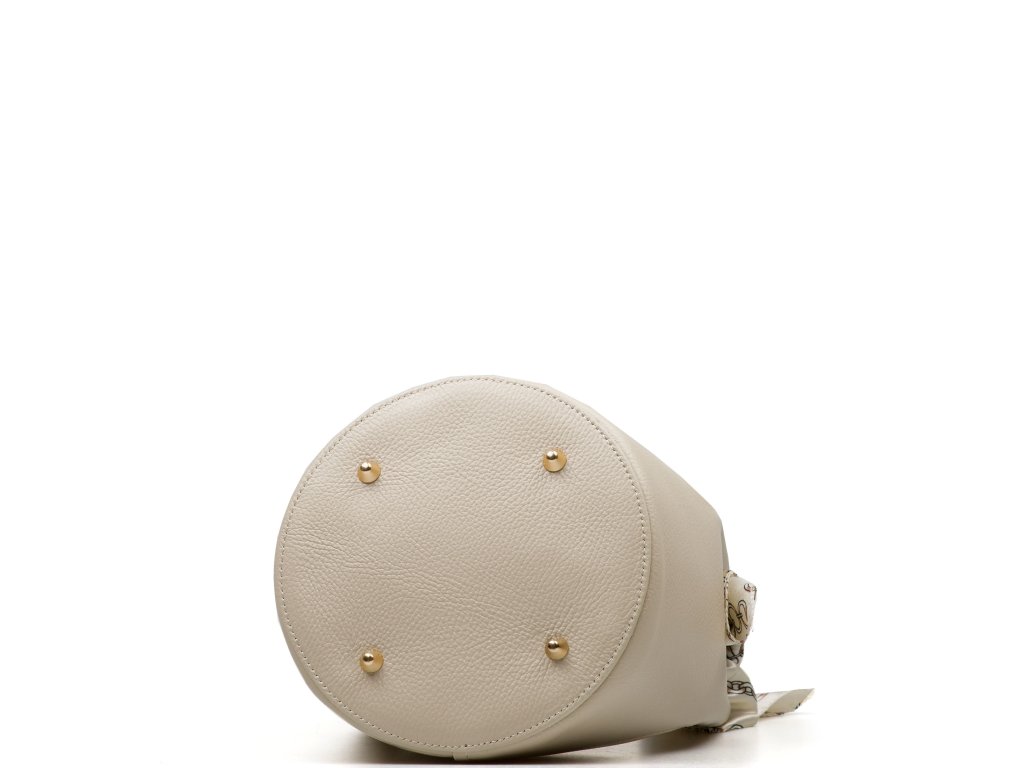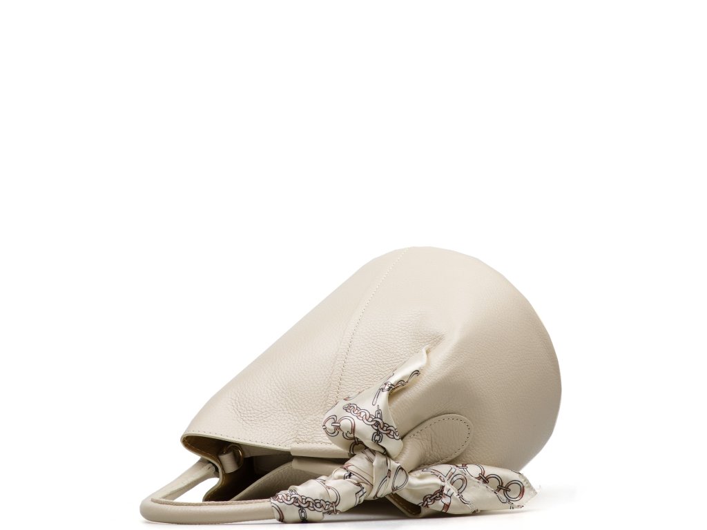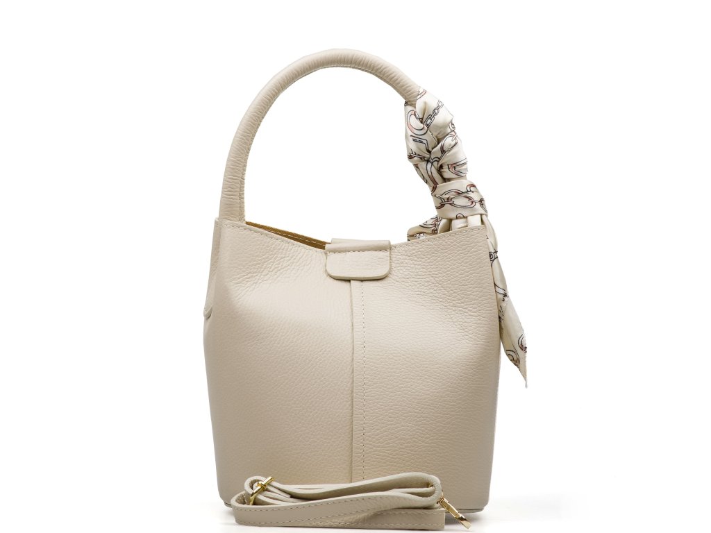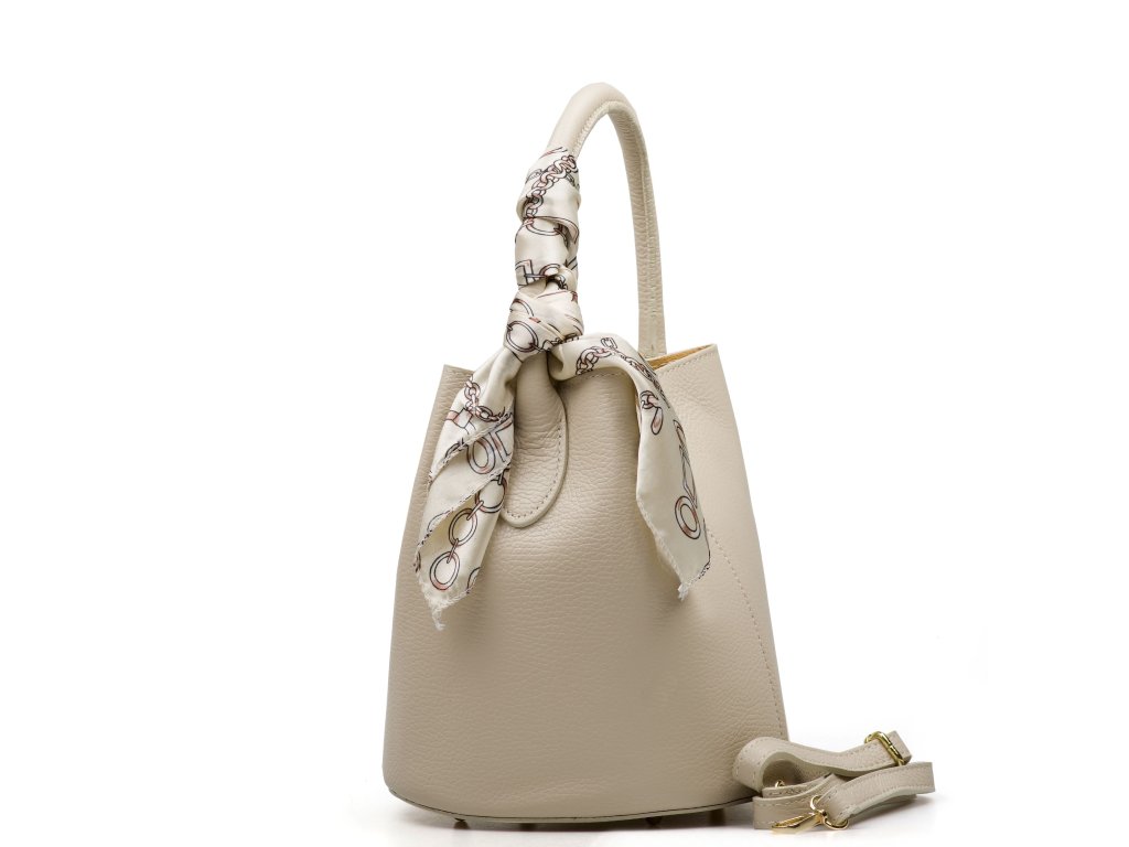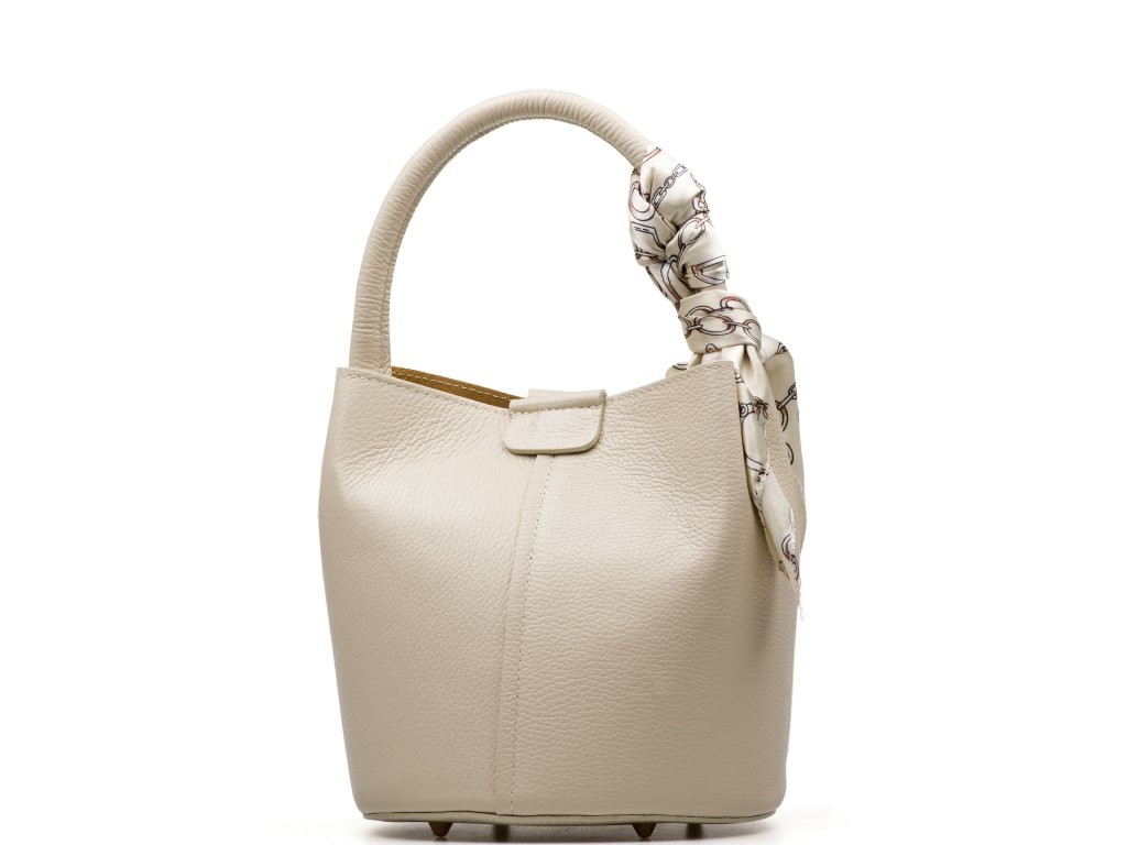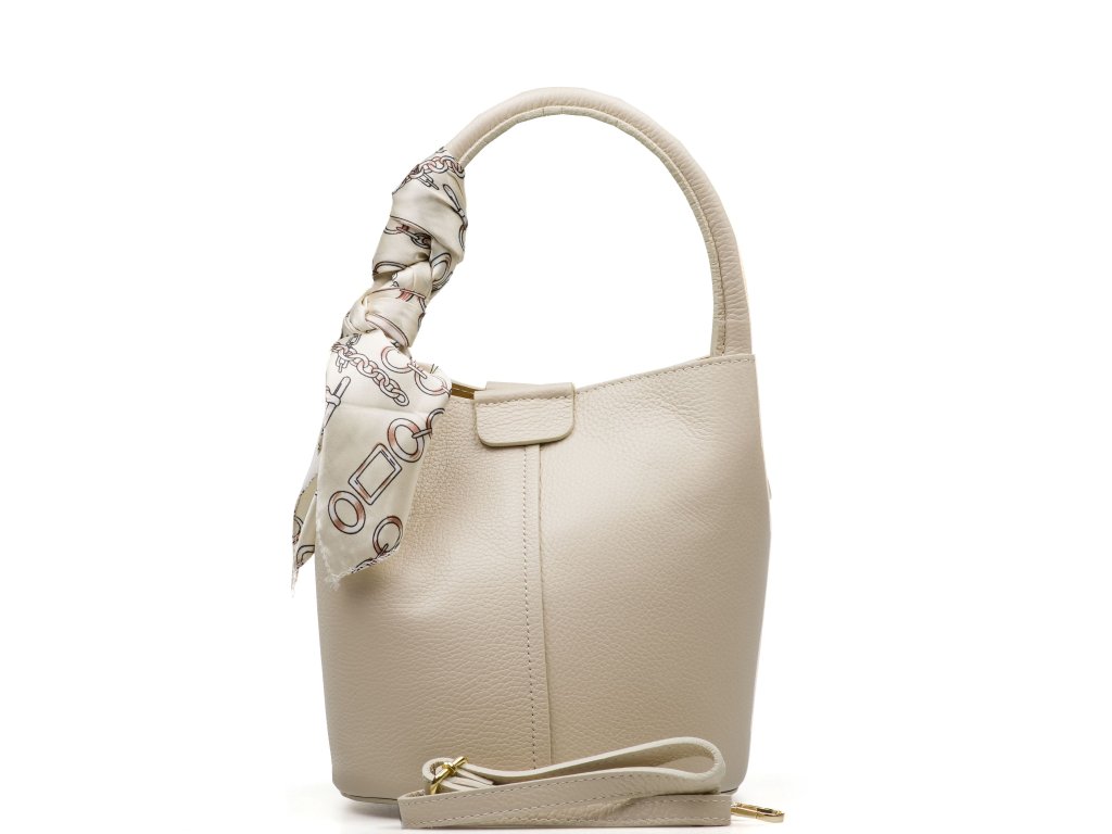 Kožená kabelka ve tvaru pytlíku v béžové barvě. Součástí kabelky je kožená odnímatelná kapsa a přídavný popruh pro nošení přes tělo. Kabelku zdobí šátek na uchu. Kabelka se uzavírá cvočkem.