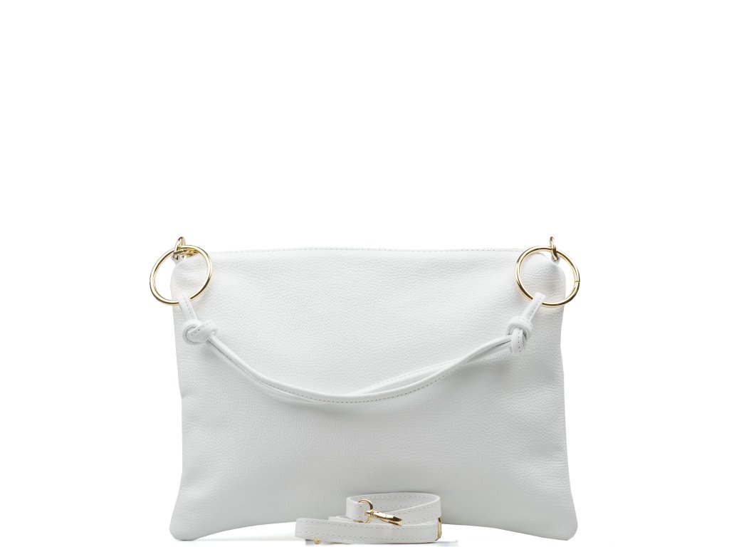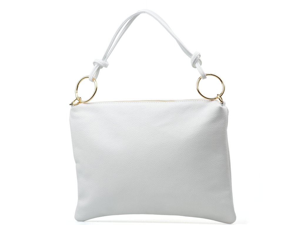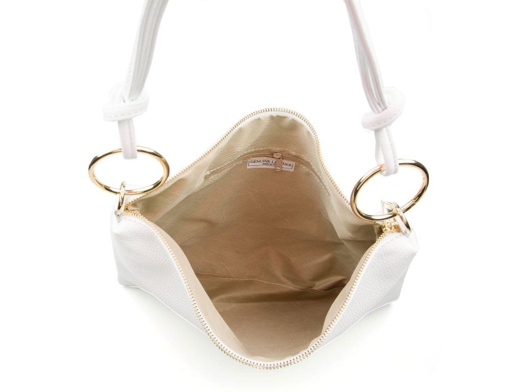 Praktická kožená kabelka přes rameno pro volný čas v bílé barvě. Součástí kabelky je přídavný popruh pro nošení přes tělo. Interiér kabelky disponuje jednou úložnou kapsou a malou boční na zip. Kabelka se uzavírá zipem.