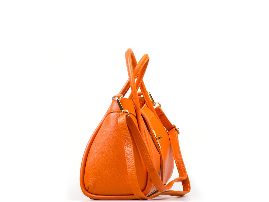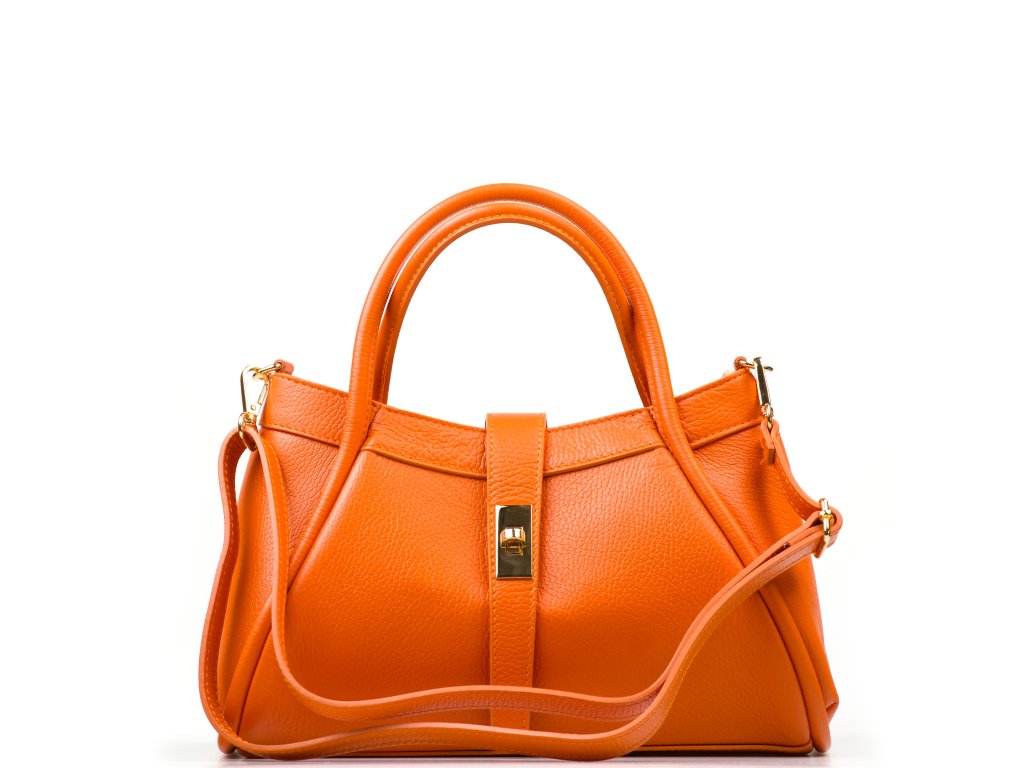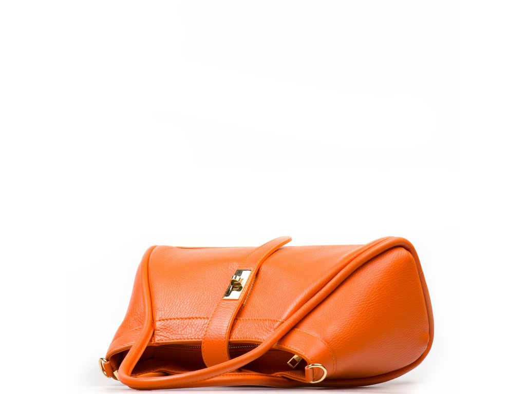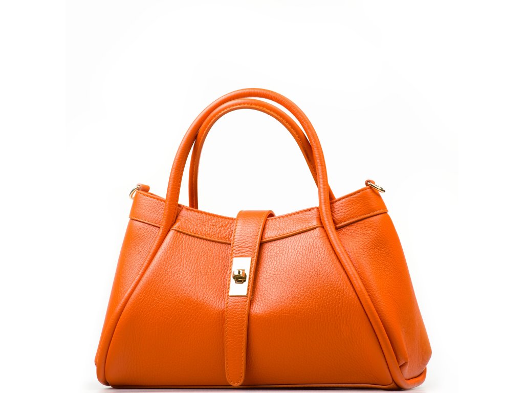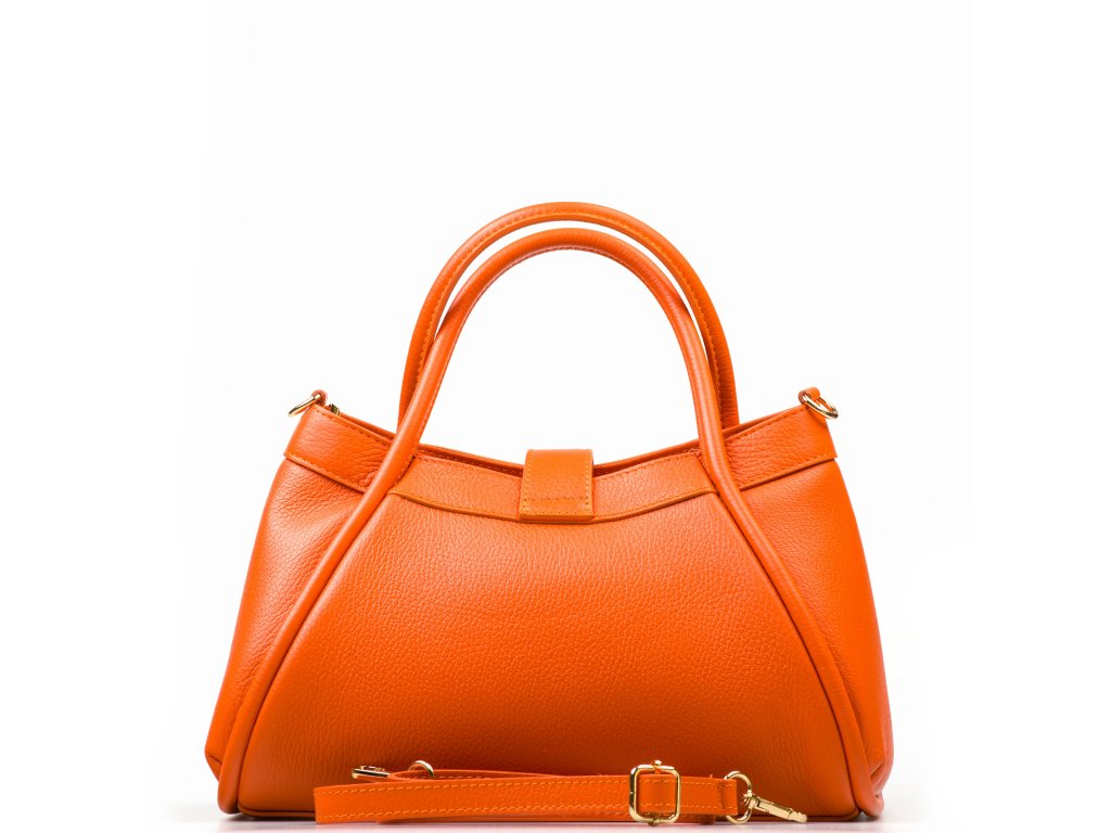 Elegantní kožená kabelka do ruky či přes rameno v oranžové barvě. Kabelku lze nosit i jako crossbody díky přídavnému popruhu. Interiér disponuje jednou velkou úložnou kapsou a jednou malou na drobné věci. Kabelka se uzavírá zipem a ozdobnou klopou.