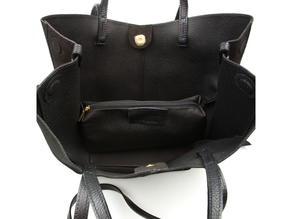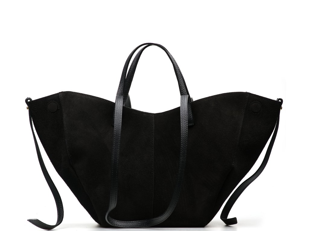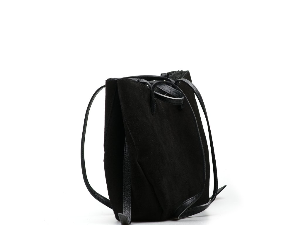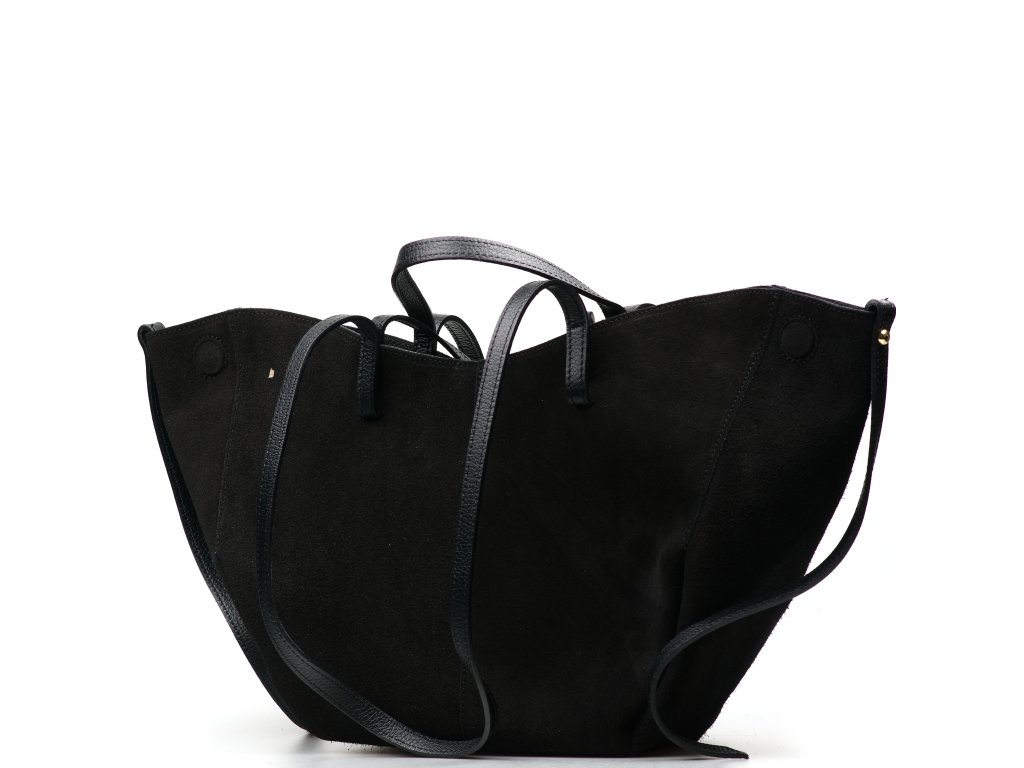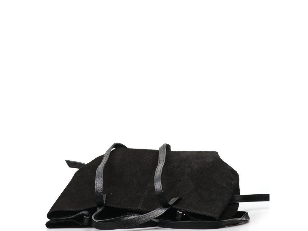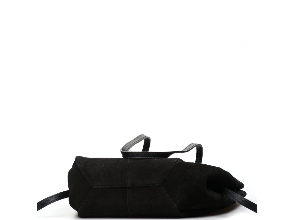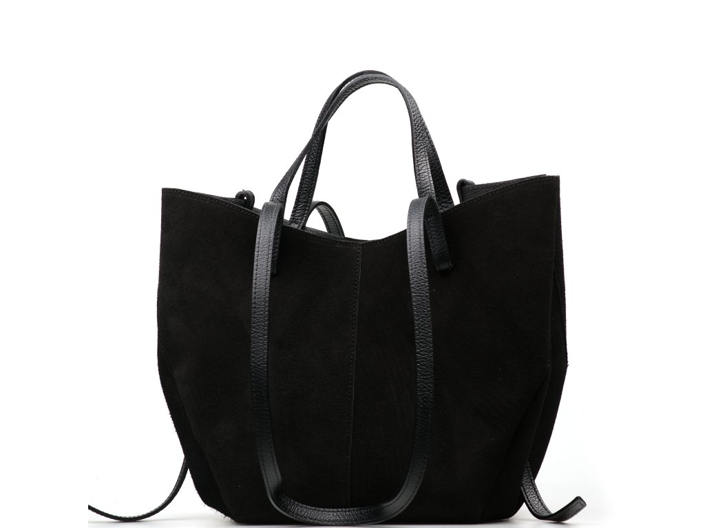 Elegantní kožená kabelka do ruky či přes rameno v černé barvě. Povrch kabelky má matnou semišovou úpravu, která podtrhuje její sofistikovaný vzhled. Kabelku lze nosit ve dvou tvarových variantách. Interiér disponuje jednou velkou úložnou kapsou a přídavnou volnou kapsou. Kabelka se uzavírá cvokem.