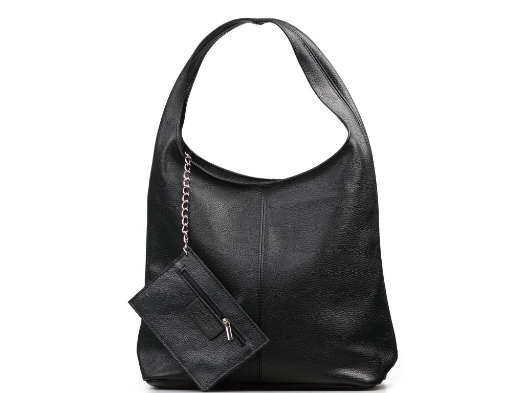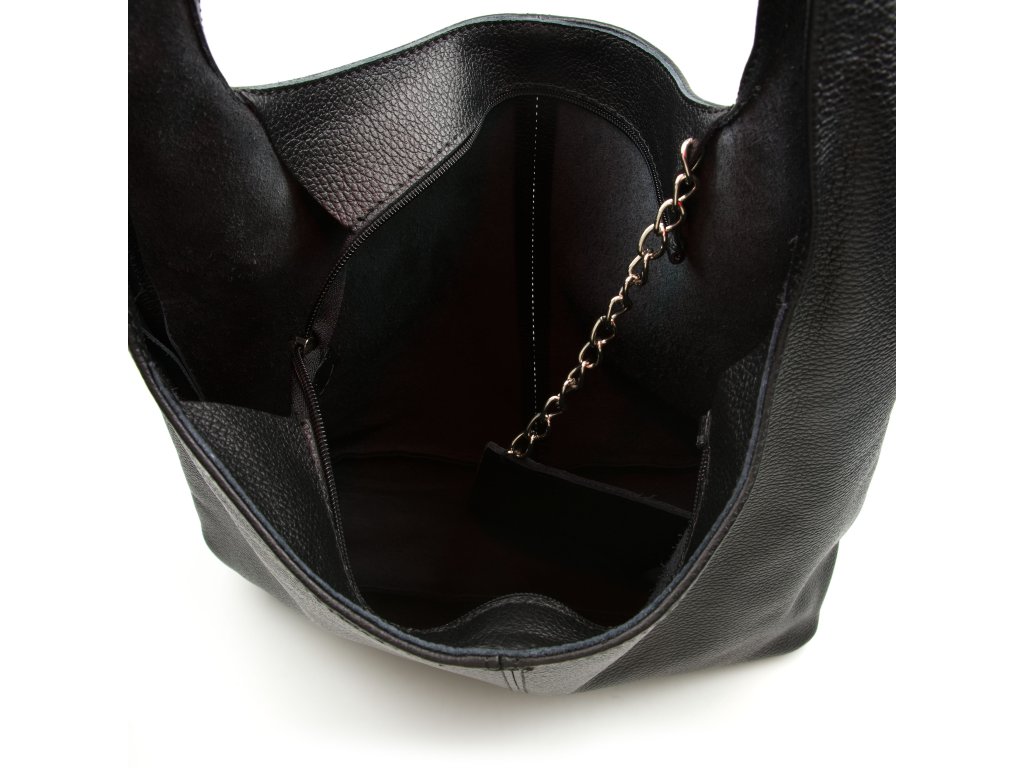 Minimalistická kožená kabelka přes rameno v černé barvě je elegantním a nadčasovým doplňkem, který se hodí ke každému outfitu. Interiér nabízí jednu prostornou hlavní kapsu a malou kapsu na řetízku, ideální pro uložení drobných cenností. Kabelka se uzavírá zipem, což zajistí bezpečné uložení všech vašich věcí. Jednoduchý, ale stylový design z ní činí ideální kabelku pro každodenní nošení i speciální příležitosti.