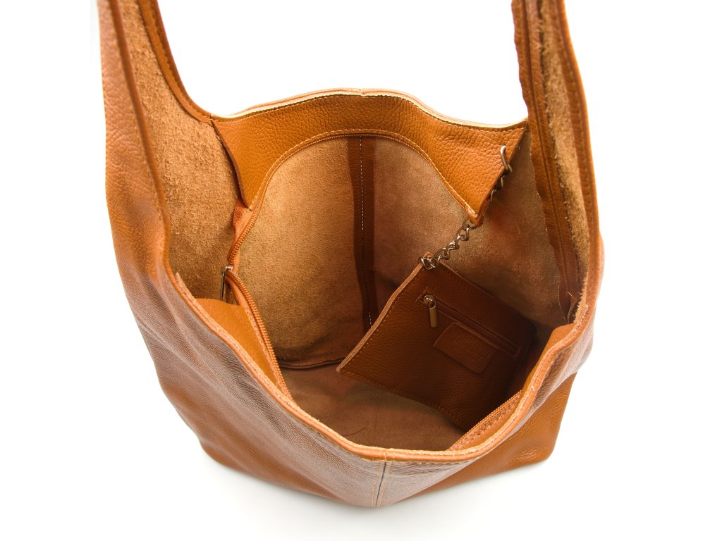 Minimalistická kožená kabelka přes rameno v koňakově hnědé barvě je elegantním a nadčasovým doplňkem, který se hodí ke každému outfitu. Interiér nabízí jednu prostornou hlavní kapsu a malou kapsu na řetízku, ideální pro uložení drobných cenností. Kabelka se uzavírá zipem, což zajistí bezpečné uložení všech vašich věcí. Jednoduchý, ale stylový design z ní činí ideální kabelku pro každodenní nošení i speciální příležitosti.