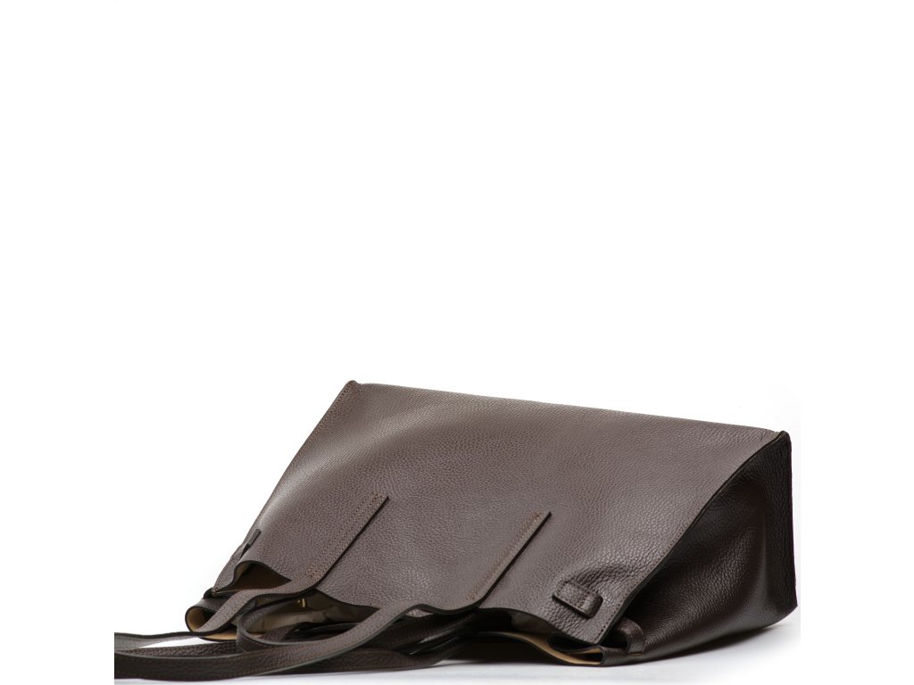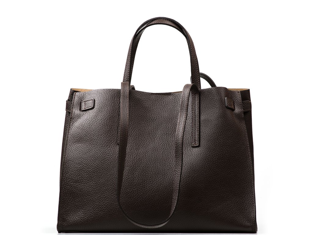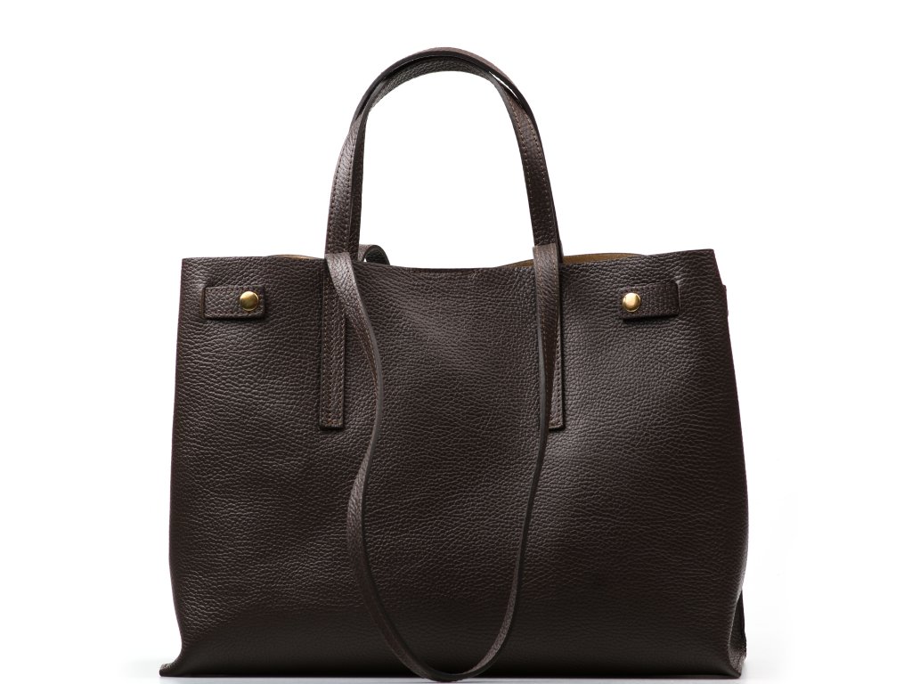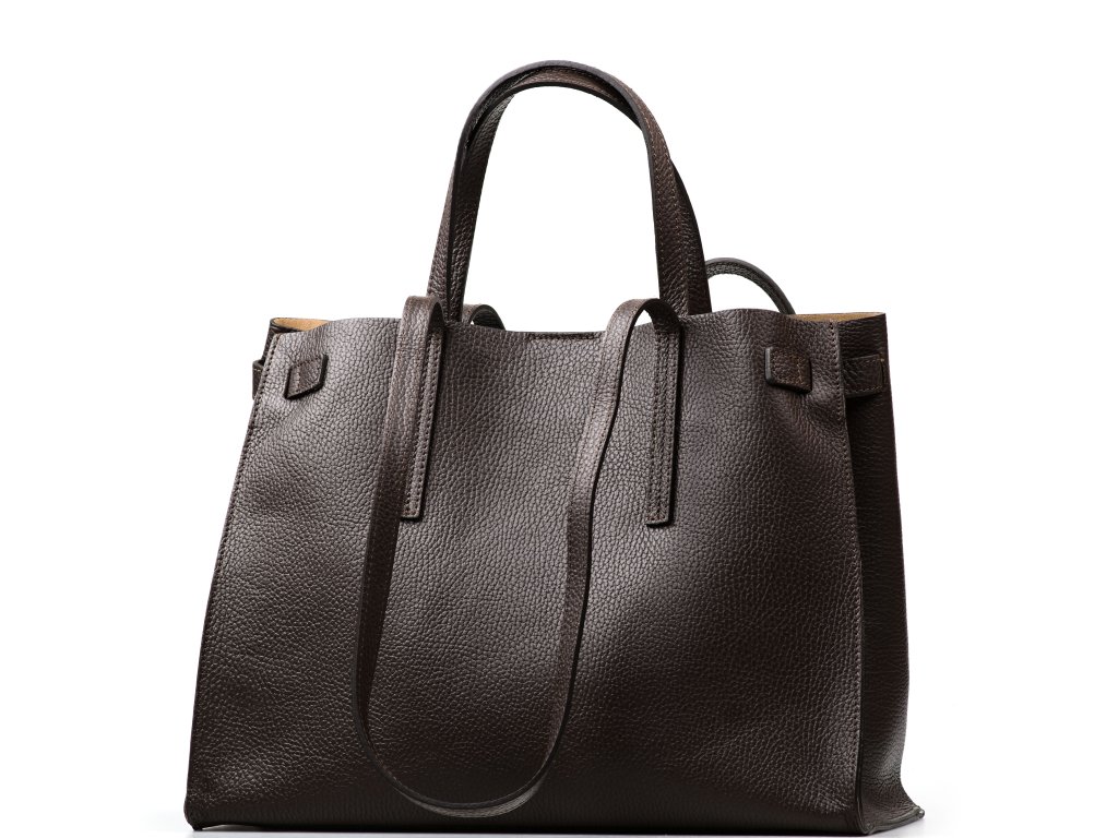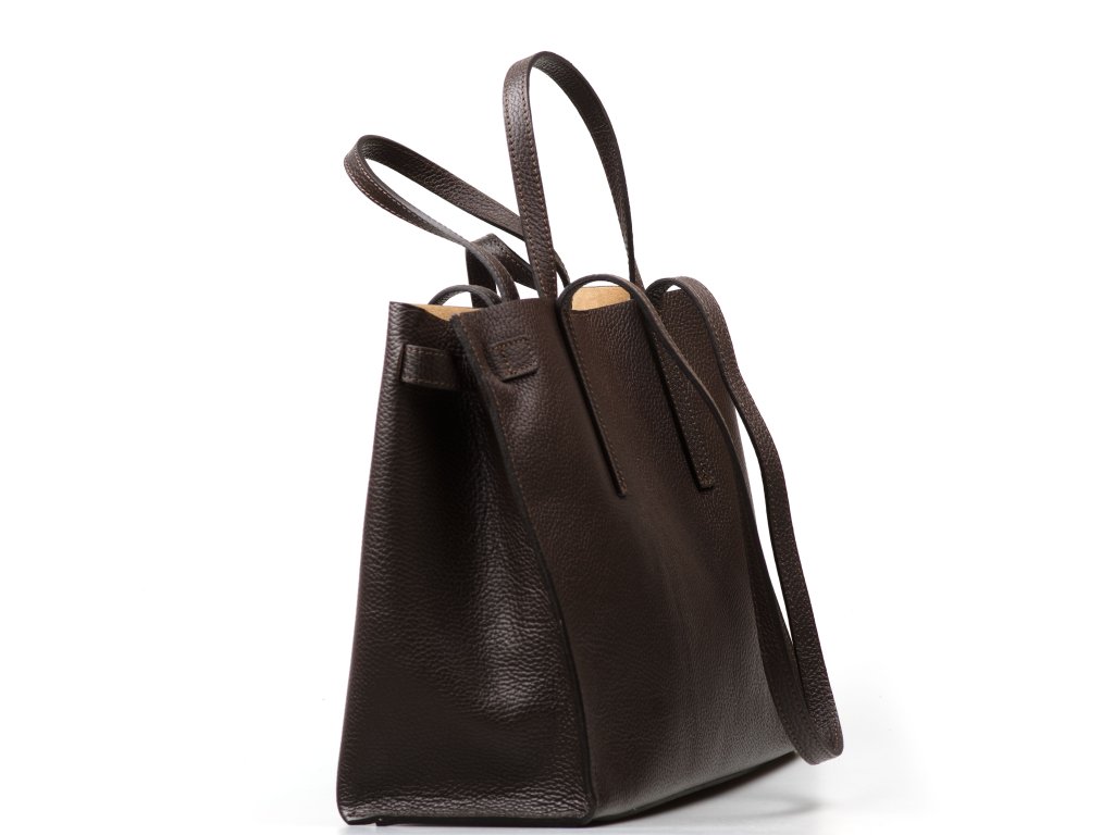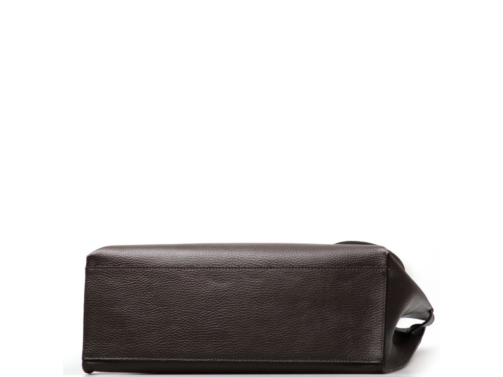 Minimalistická kožená kabelka v tmavě hnědé barvě, kterou můžete nosit elegantně v ruce i pohodlně přes rameno. Interiér nabízí jednu velkou hlavní kapsu na každodenní nezbytnosti a navíc pevnou přídavnou kapsu na zip – ideální na drobnosti, které chcete mít zvlášť a v bezpečí (např. klíče, karty nebo rtěnku). Kabelka se uzavírá cvokem, takže ji rychle otevřete i zavřete během chvilky.