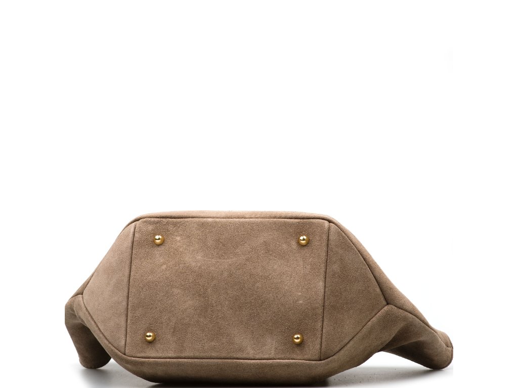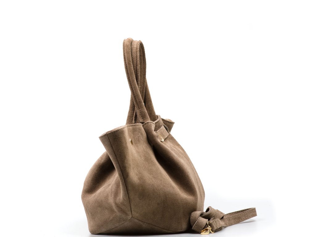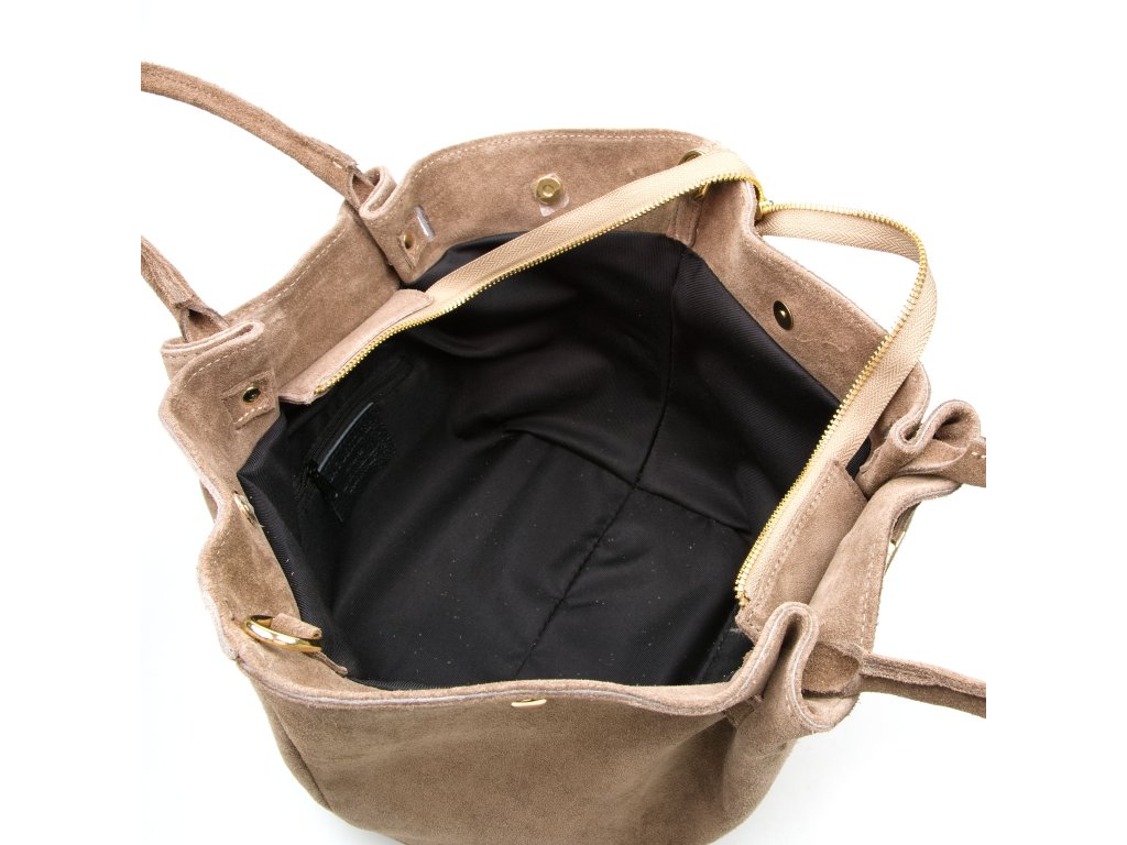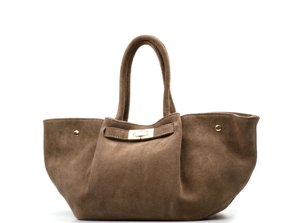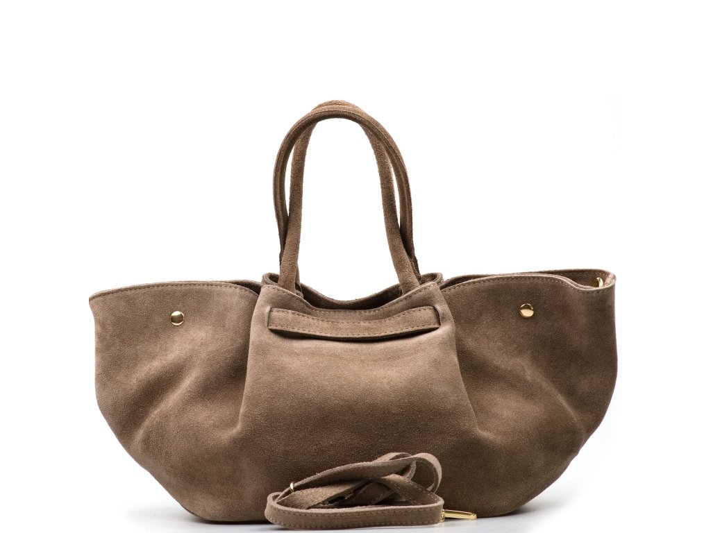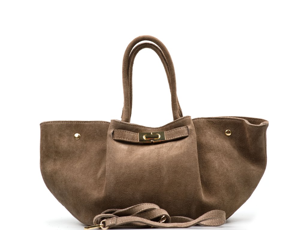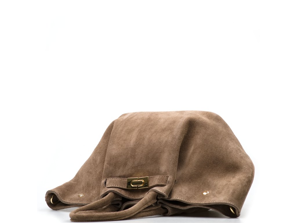 Kožená kabelka z broušené kůže do ruky i přes rameno v béžové barvě. Interiér kabelky disponuje jednou hlavní kapsou a jednou malou boční, jež je uzavíratelná zipem. Součástí kabelky je přídavný popruh s karabinami. Horní část kabelky zdobí kožený popruh se zlatými sponami.