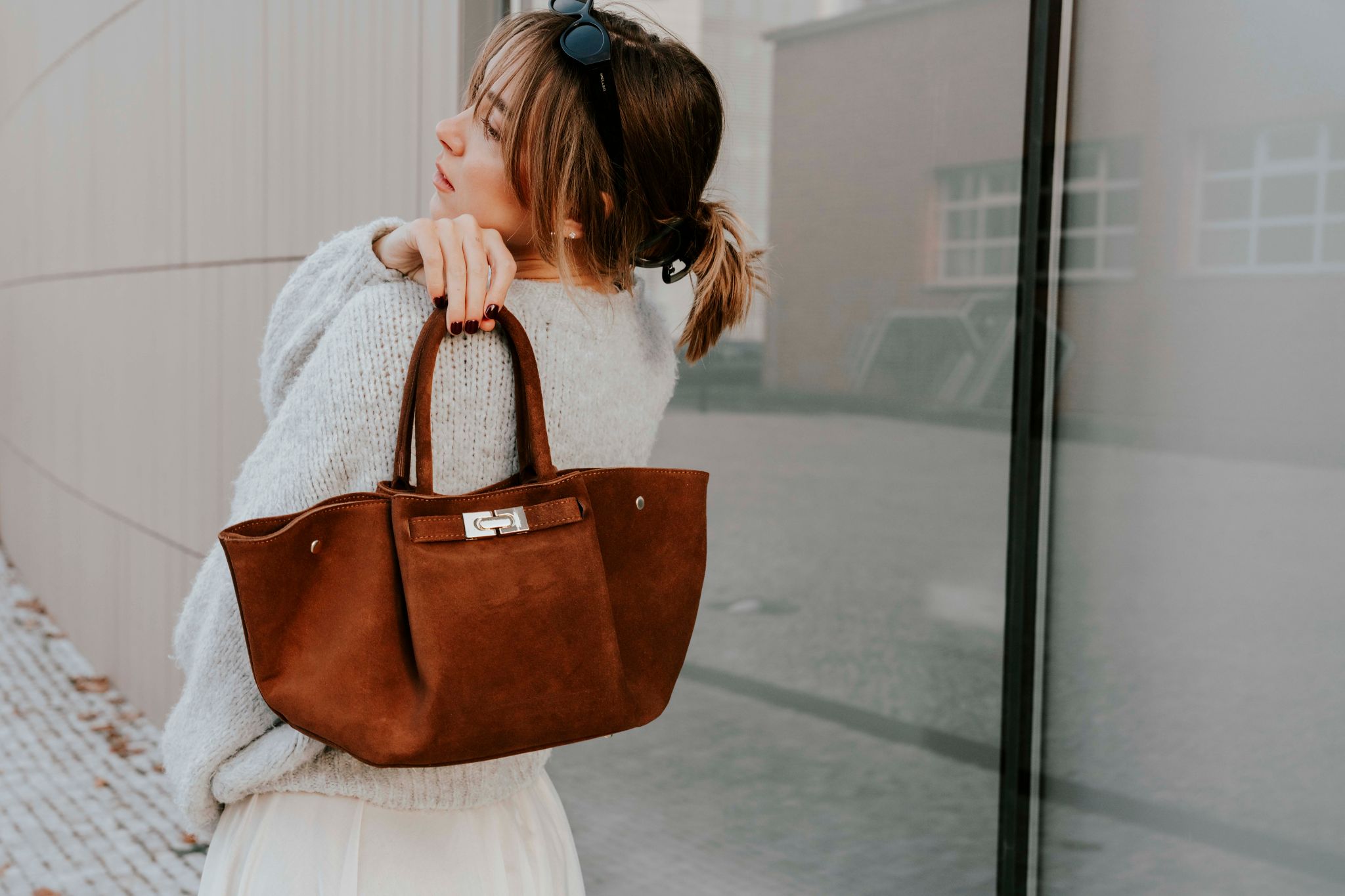 Kožená kabelka z broušené kůže do ruky i přes rameno ve světle hnědé barvě. Interiér kabelky disponuje jednou hlavní kapsou a jednou malou boční, jež je uzavíratelná zipem. Součástí kabelky je přídavný popruh s karabinami. Horní část kabelky zdobí kožený popruh se zlatými sponami.
