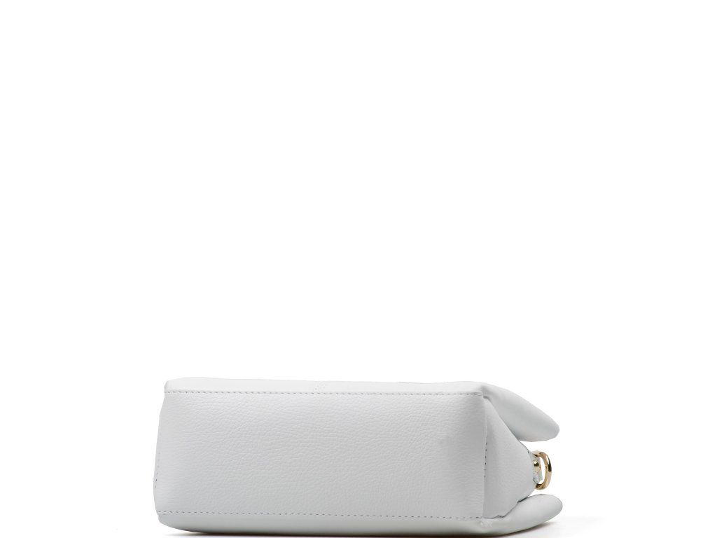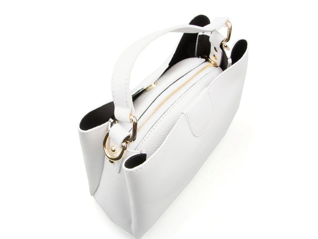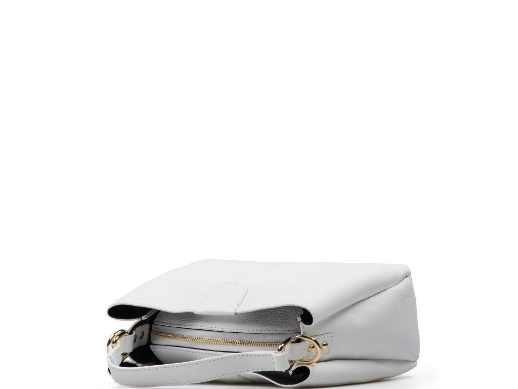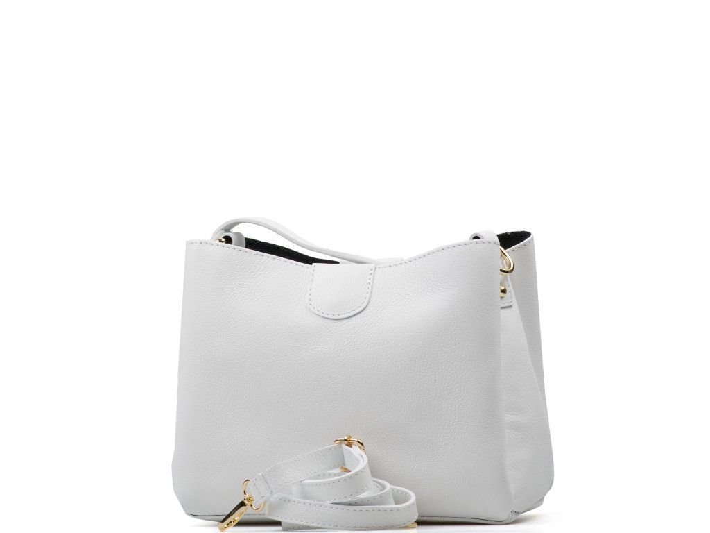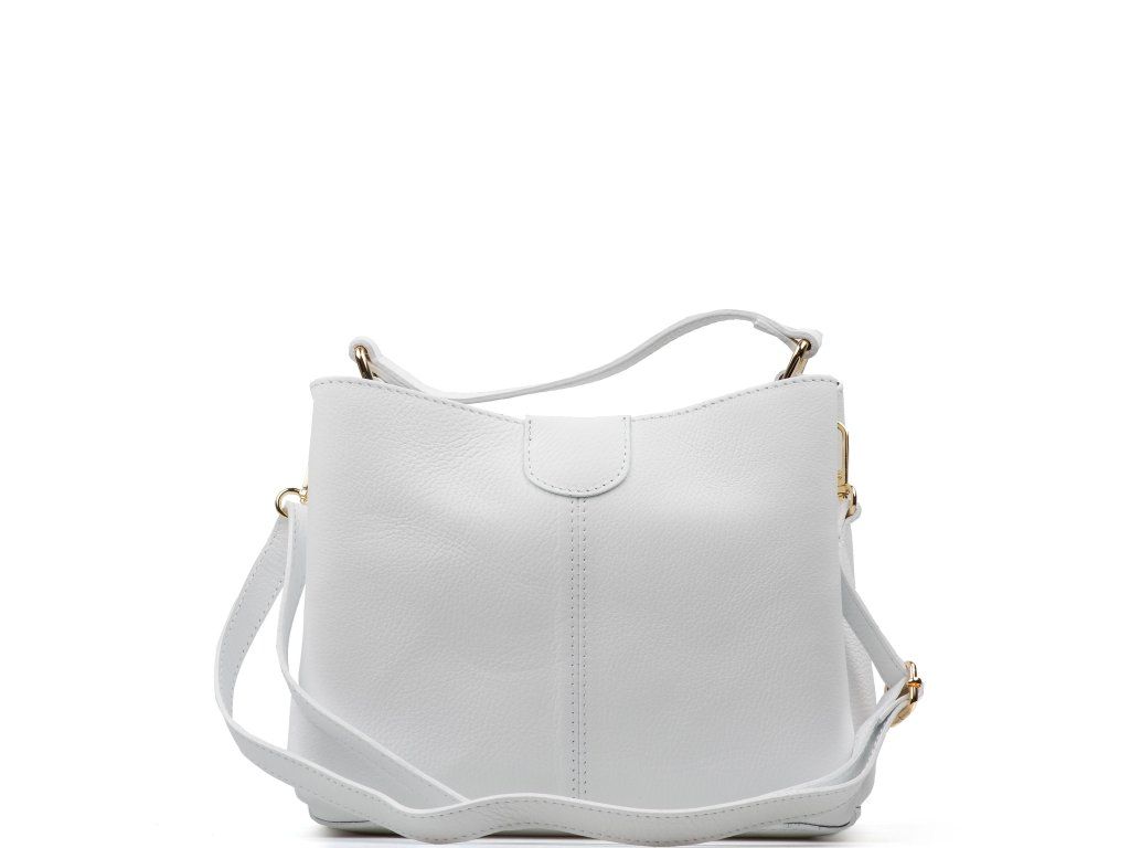 Bílá kožená kabelka se zlatým kováním pro elegantní každodenní nošení. Uvnitř nabízí tři hlavní přihrádky, přičemž prostřední je na zip – ideální na cennosti. Nosit ji můžete v ruce i přes rameno díky nastavitelnému přídavnému popruhu. Kabelka se uzavírá klopou se zapínáním na kování.