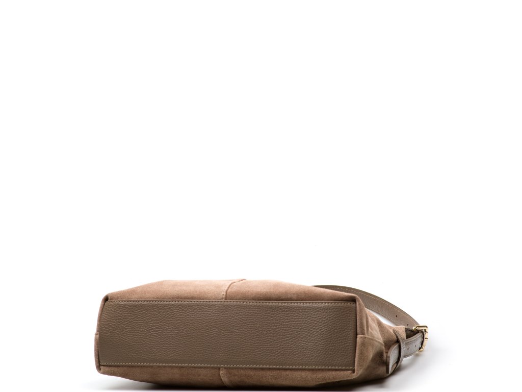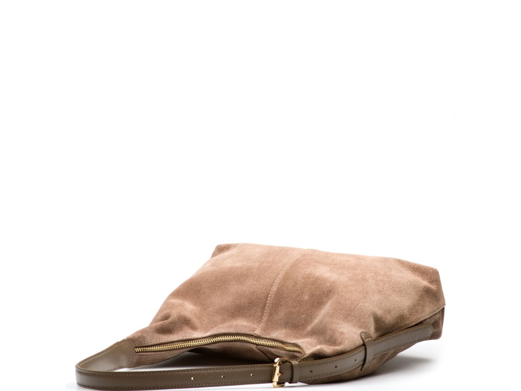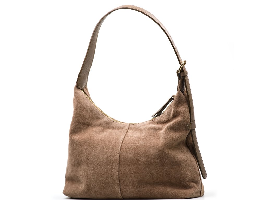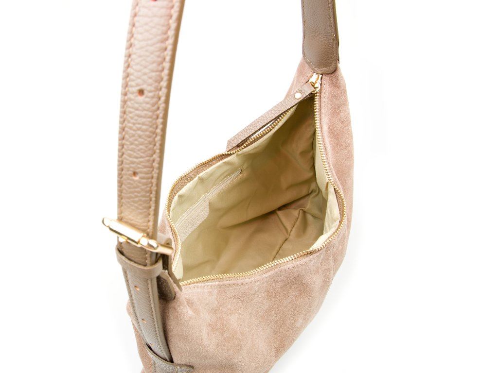 Minimalistická semišová kabelka přes rameno ve fango barvě. Interiér kabelky má k dispozici jednu úložnou kapsu a jednu malou boční na drobné věci, která se uzavírá zipem. Kabelka se uzavírá zipem.