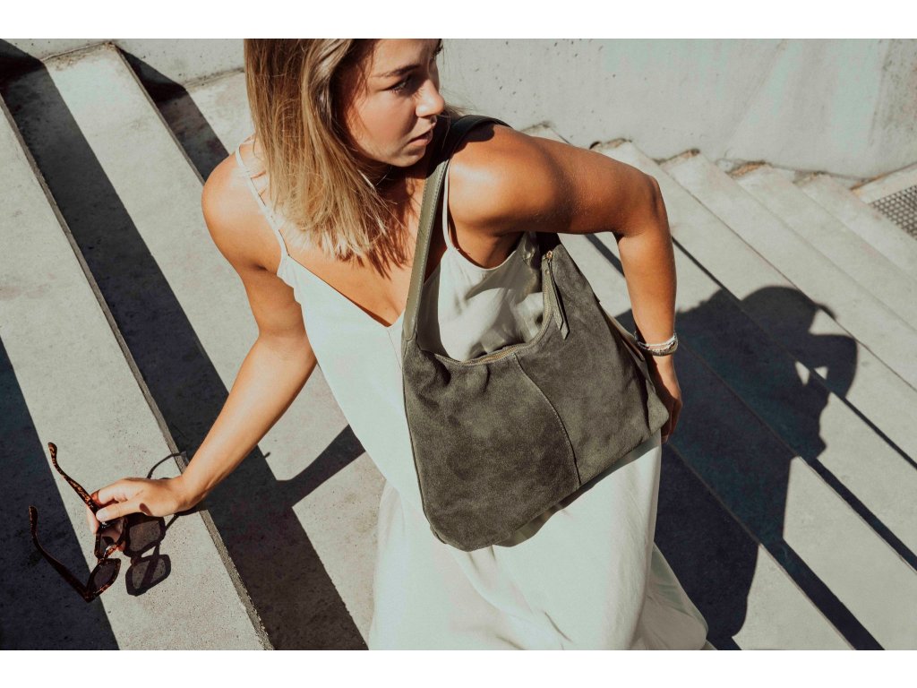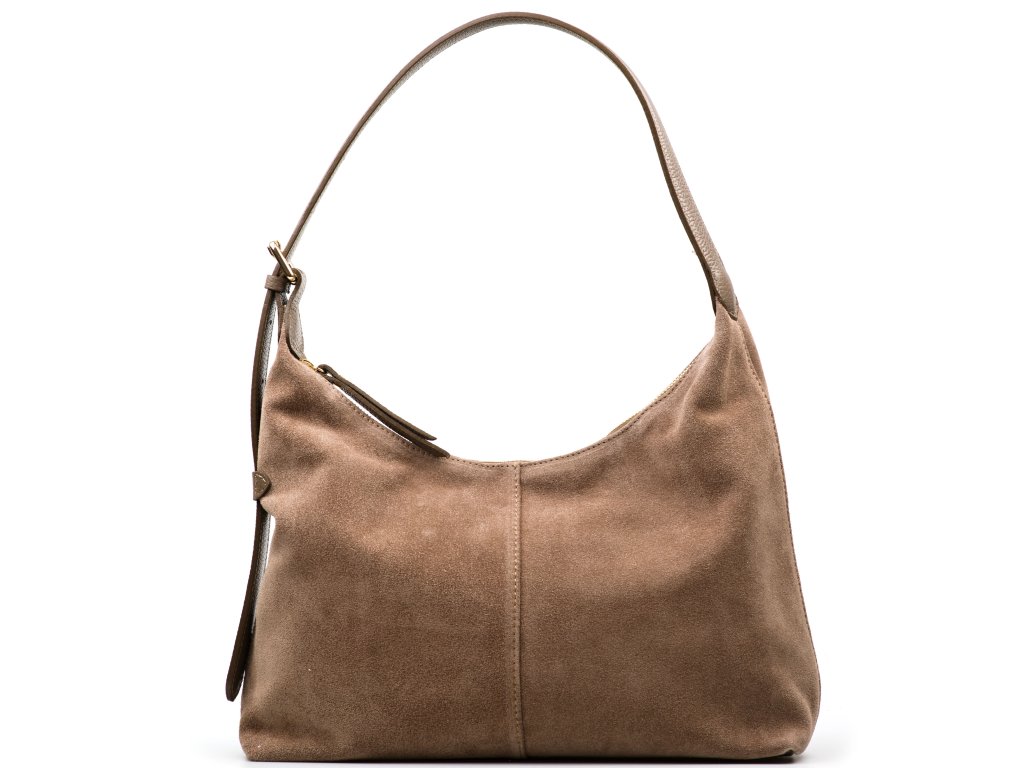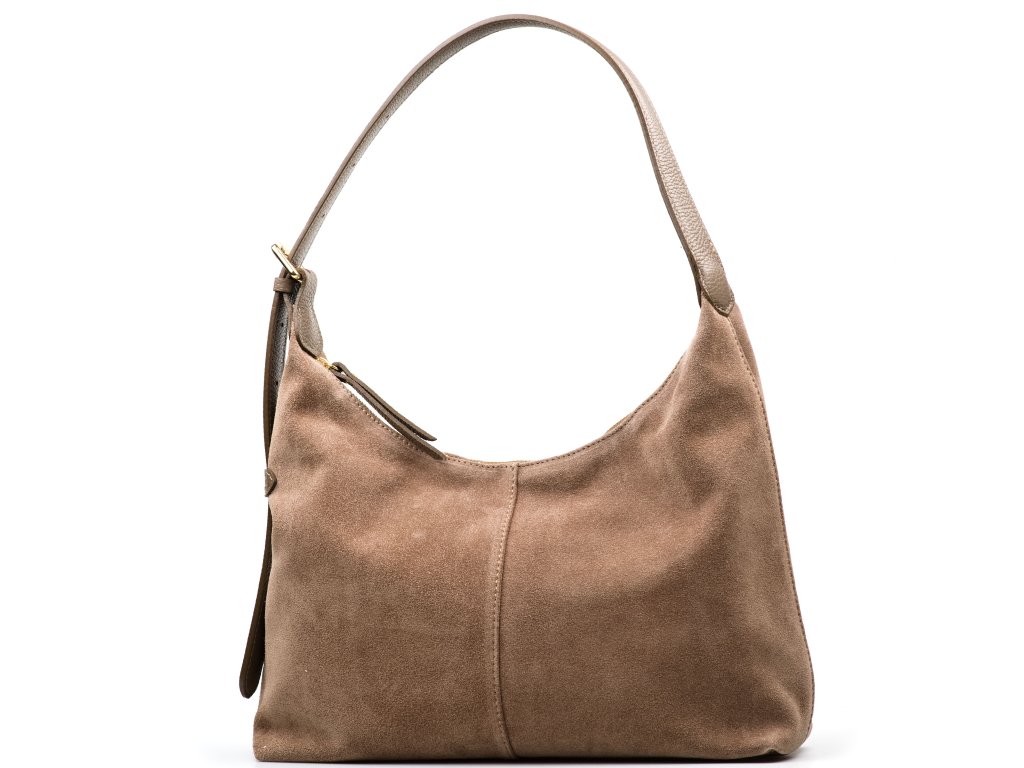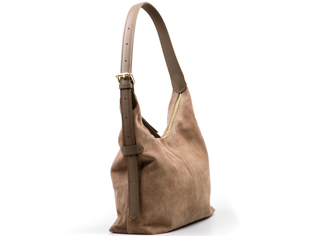 Minimalistická semišová kabelka přes rameno ve fango barvě. Interiér kabelky má k dispozici jednu úložnou kapsu a jednu malou boční na drobné věci, která se uzavírá zipem. Kabelka se uzavírá zipem.