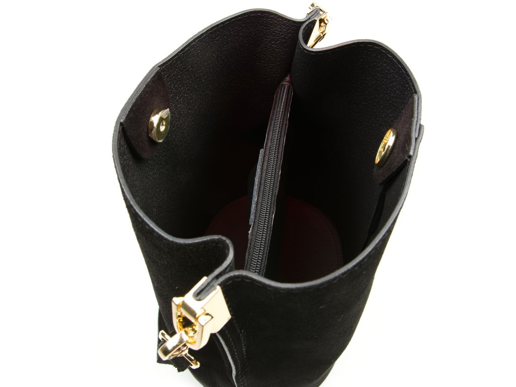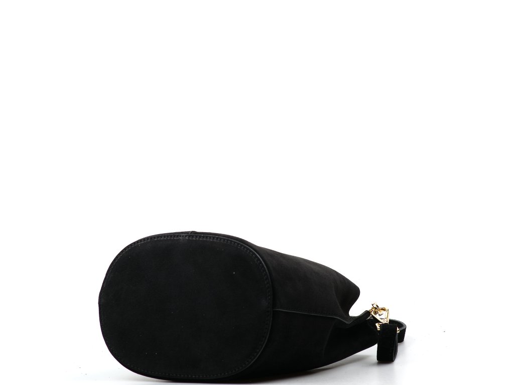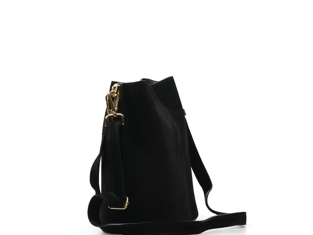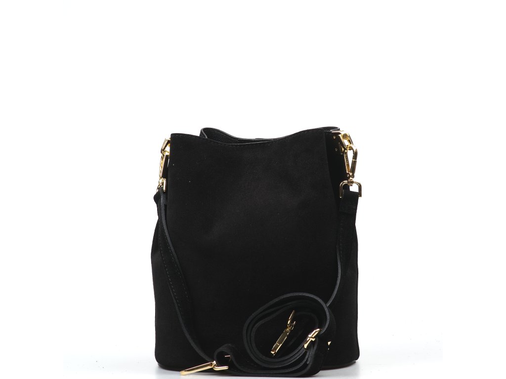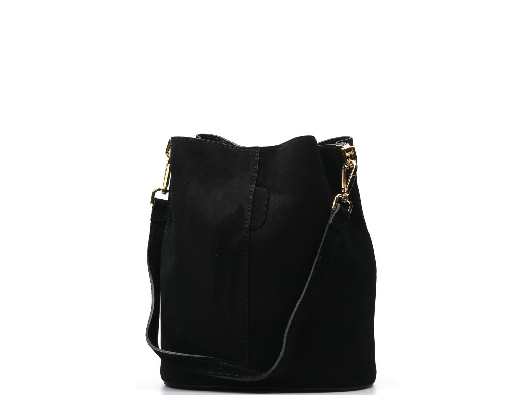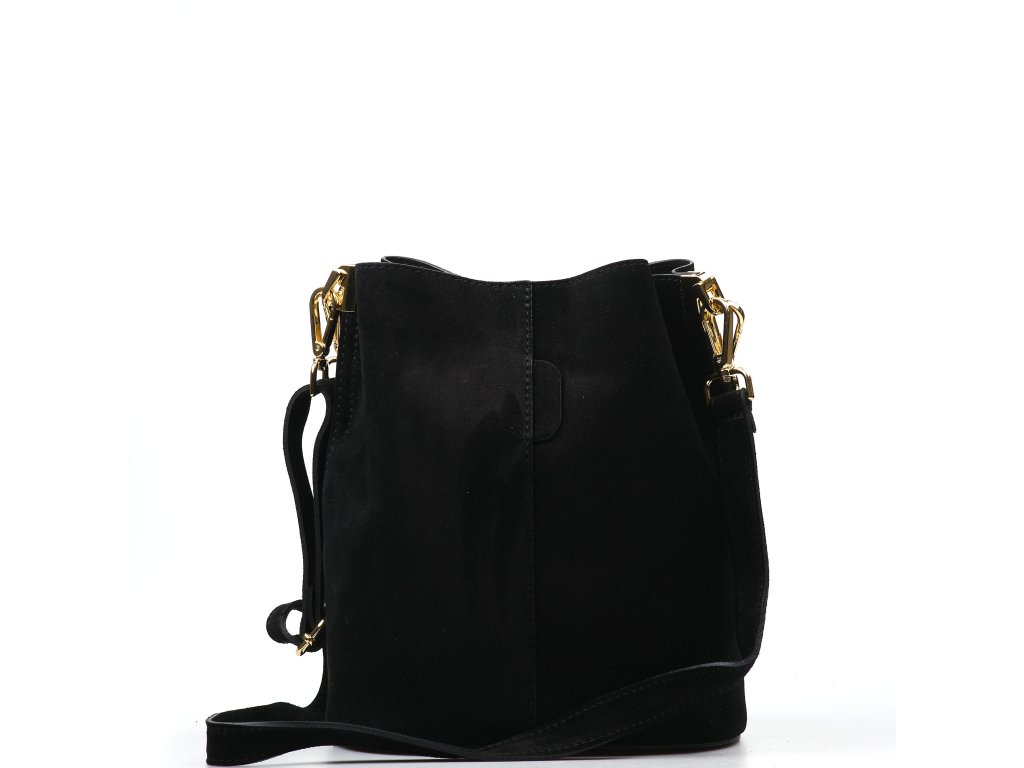 Módní semišová kabelka přes rameno ve tvaru pytlíku v černé barvě. Součástí kabelky jsou dva odnímatelné popruhy s karabinami. Interiér kabelky má k dispozici tři úložné kapsy, uprostřed na zip. Kabelka se uzavírá cvočkem.