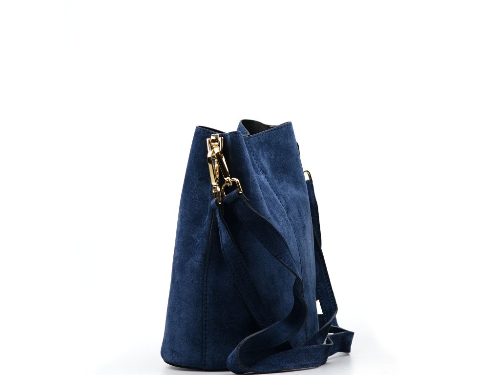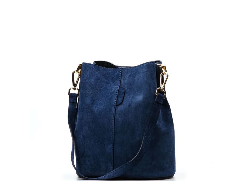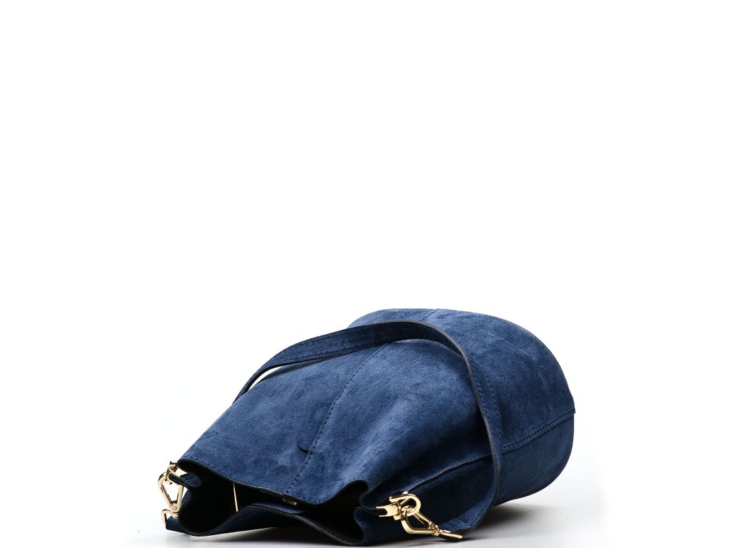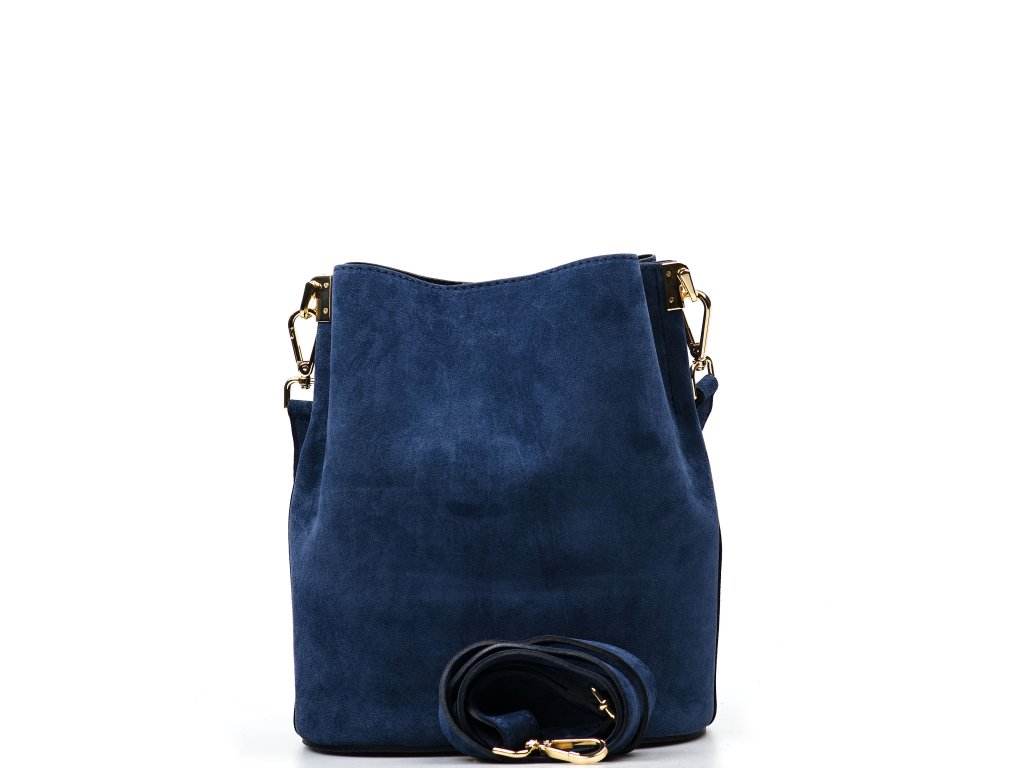 Módní semišová kabelka přes rameno ve tvaru pytlíku v modré barvě. Součástí kabelky jsou dva odnímatelné popruhy s karabinami. Interiér kabelky má k dispozici tři úložné kapsy, uprostřed na zip. Kabelka se uzavírá cvočkem.