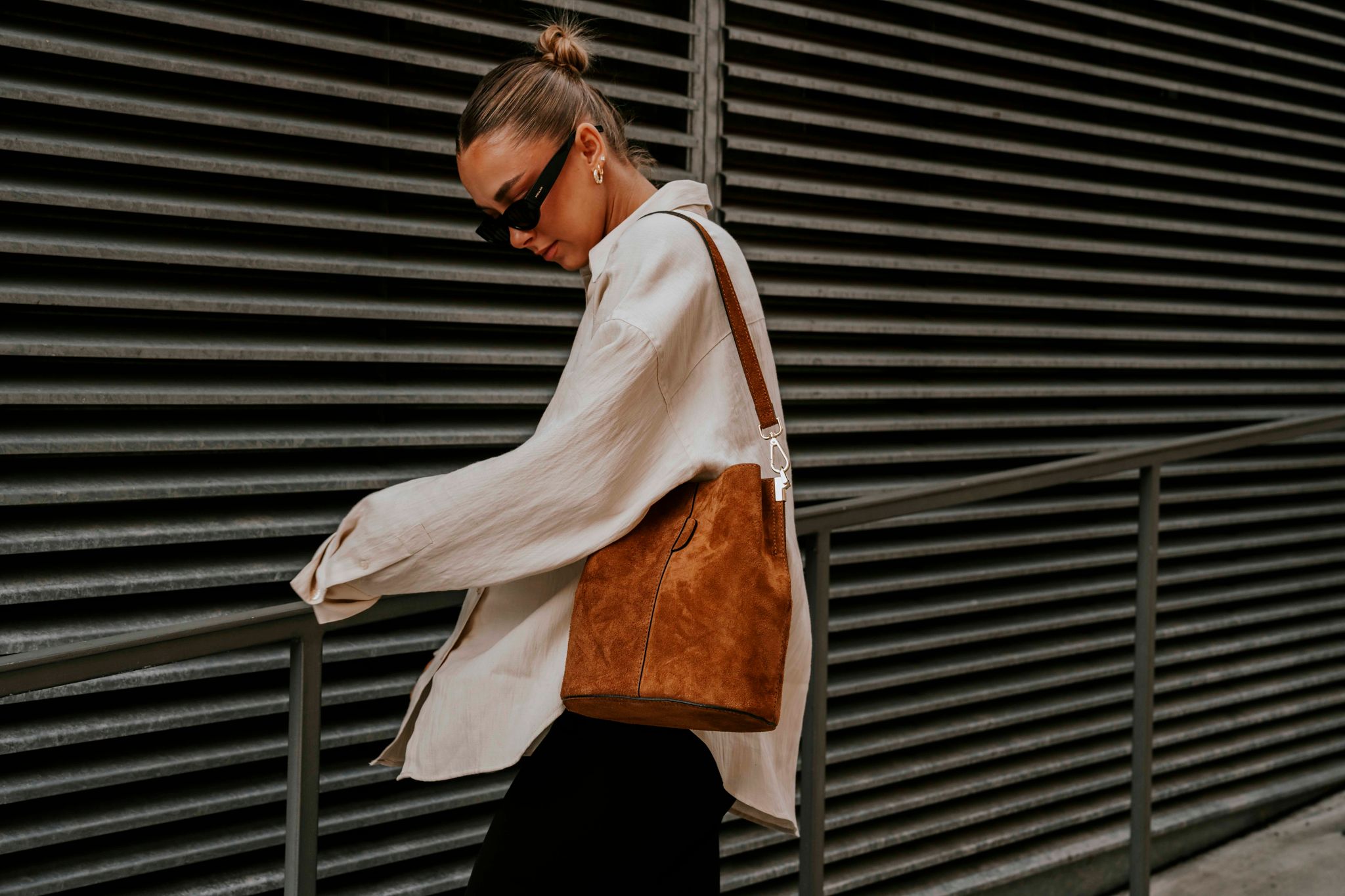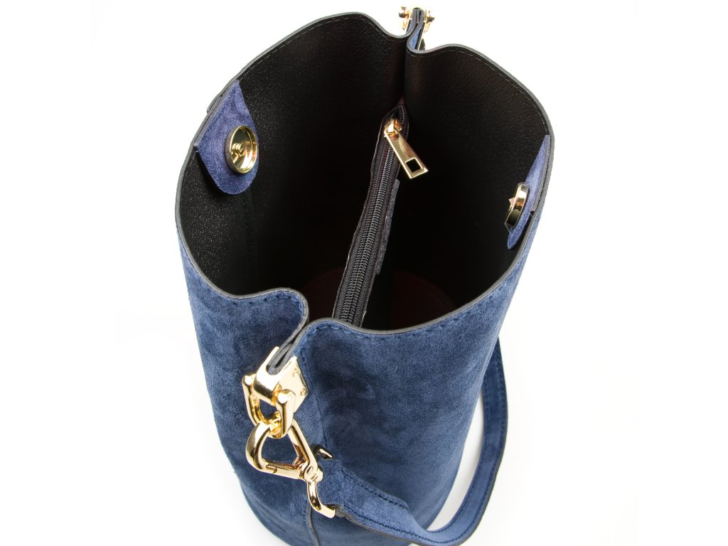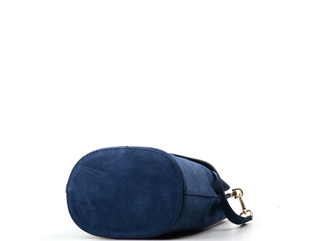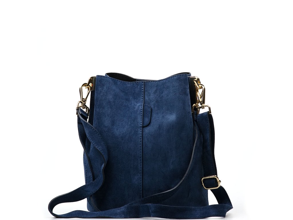 Módní semišová kabelka přes rameno ve tvaru pytlíku v modré barvě. Součástí kabelky jsou dva odnímatelné popruhy s karabinami. Interiér kabelky má k dispozici tři úložné kapsy, uprostřed na zip. Kabelka se uzavírá cvočkem.