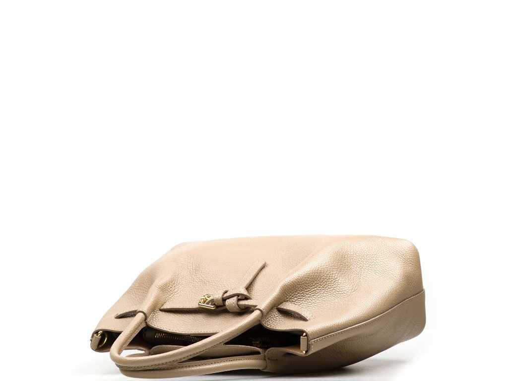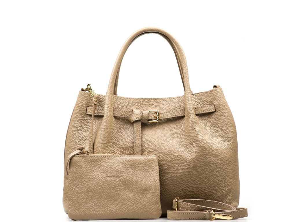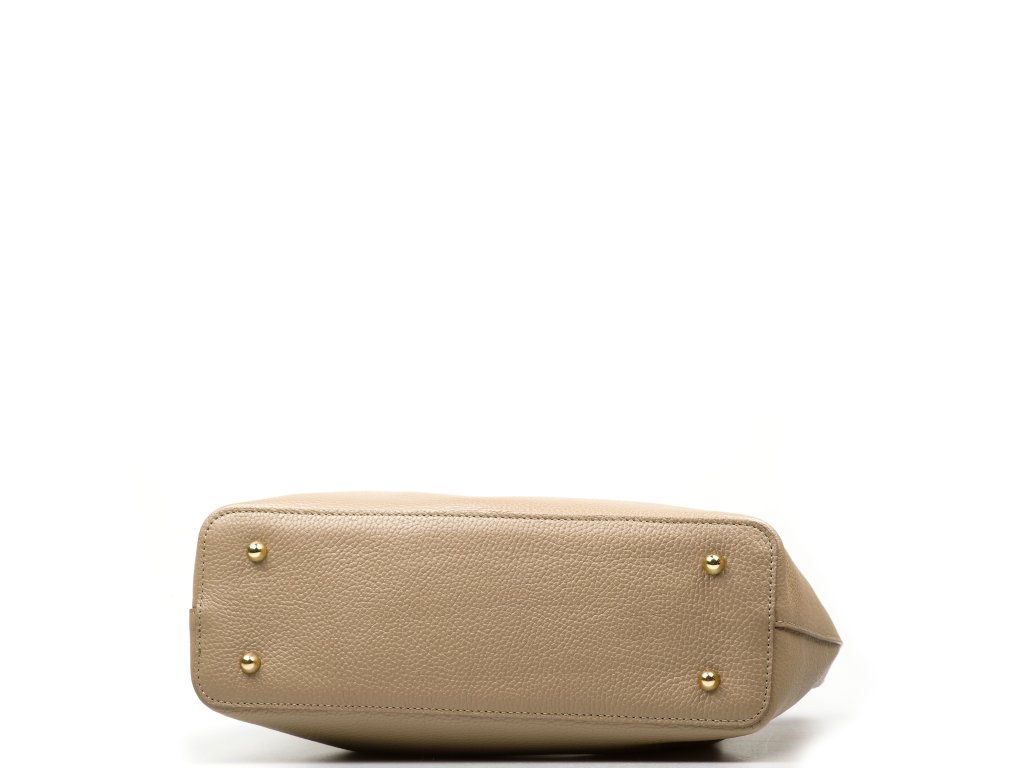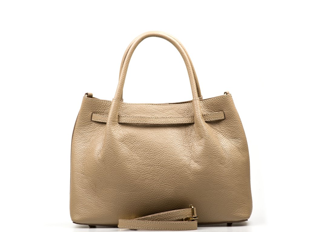 Kožená kabelka do ruky v taupe barvě je ztělesněním nadčasového stylu a sofistikovanosti. Luxusní vzhled podtrhuje kožené zdobení a zlaté kování. Kabelku lze nosit v ruce nebo přes rameno díky přídavnému popruhu. Interiér nabízí jednu prostornou hlavní kapsu. Uzavírání na cvok zajišťuje snadný přístup i bezpečné uložení obsahu.