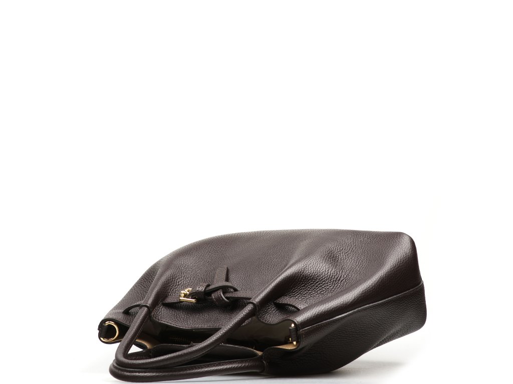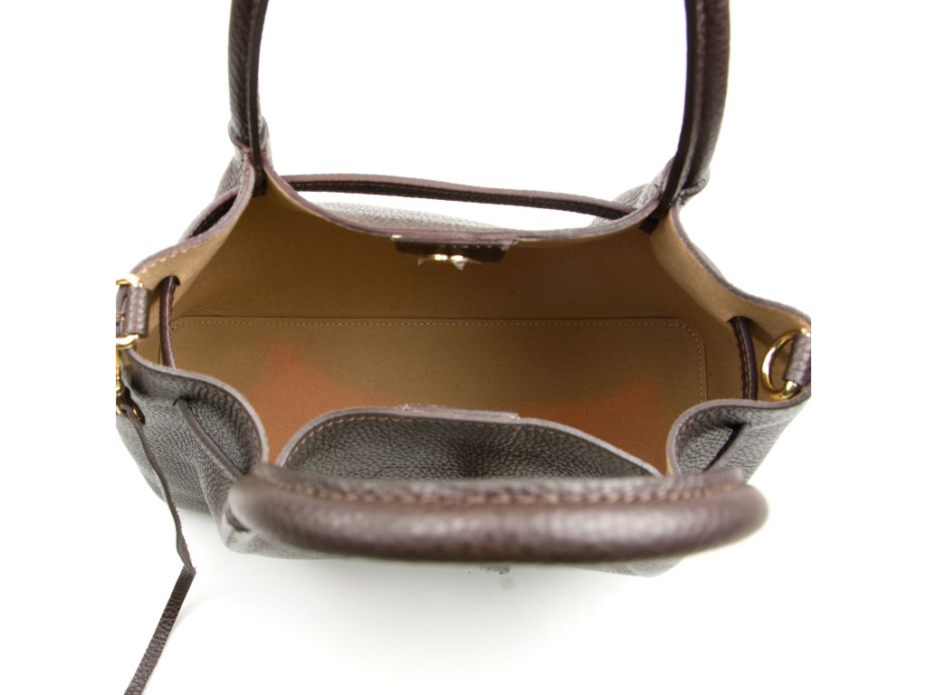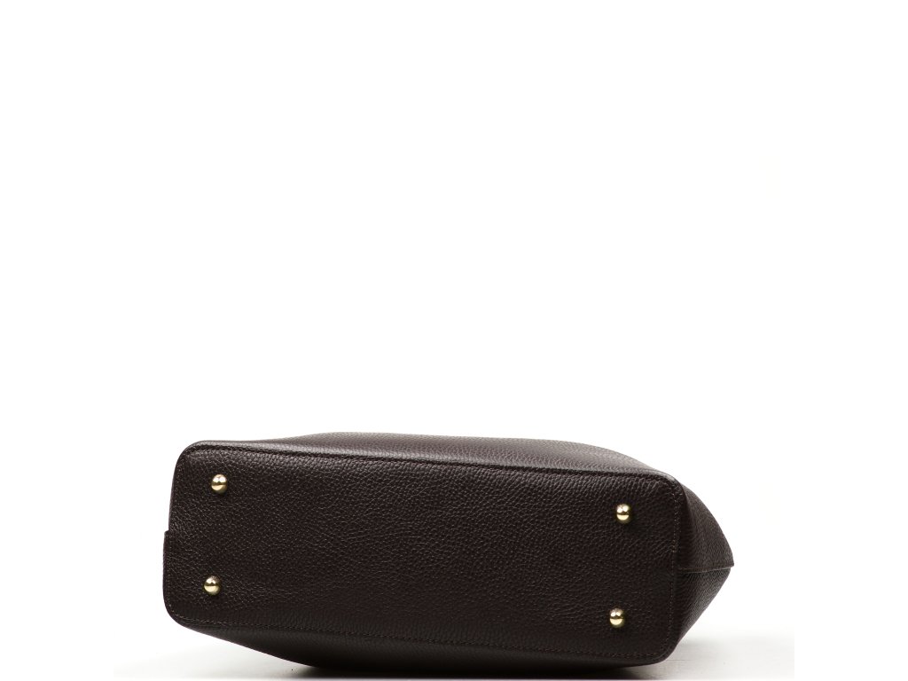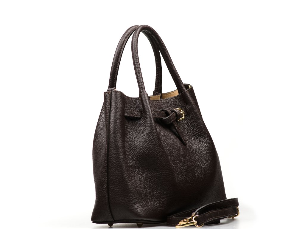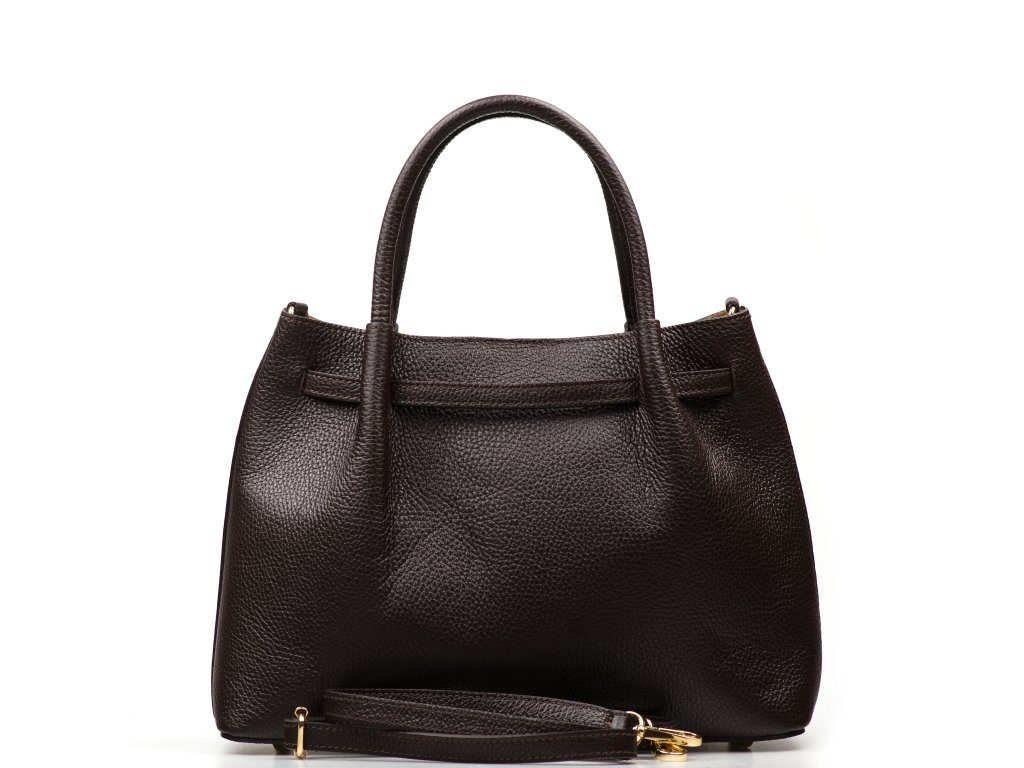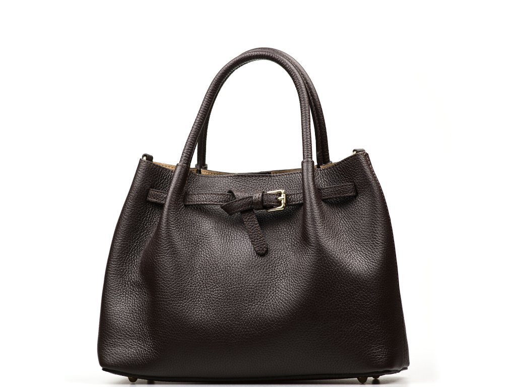 Kožená kabelka v tmavě hnědé barvě je ztělesněním nadčasového stylu a sofistikovanosti. Luxusní vzhled podtrhuje kožené zdobení a zlaté kování. Kabelku lze nosit v ruce nebo přes rameno díky přídavnému popruhu. Interiér nabízí jednu prostornou hlavní kapsu. Uzavírání na cvok zajišťuje snadný přístup i bezpečné uložení obsahu.