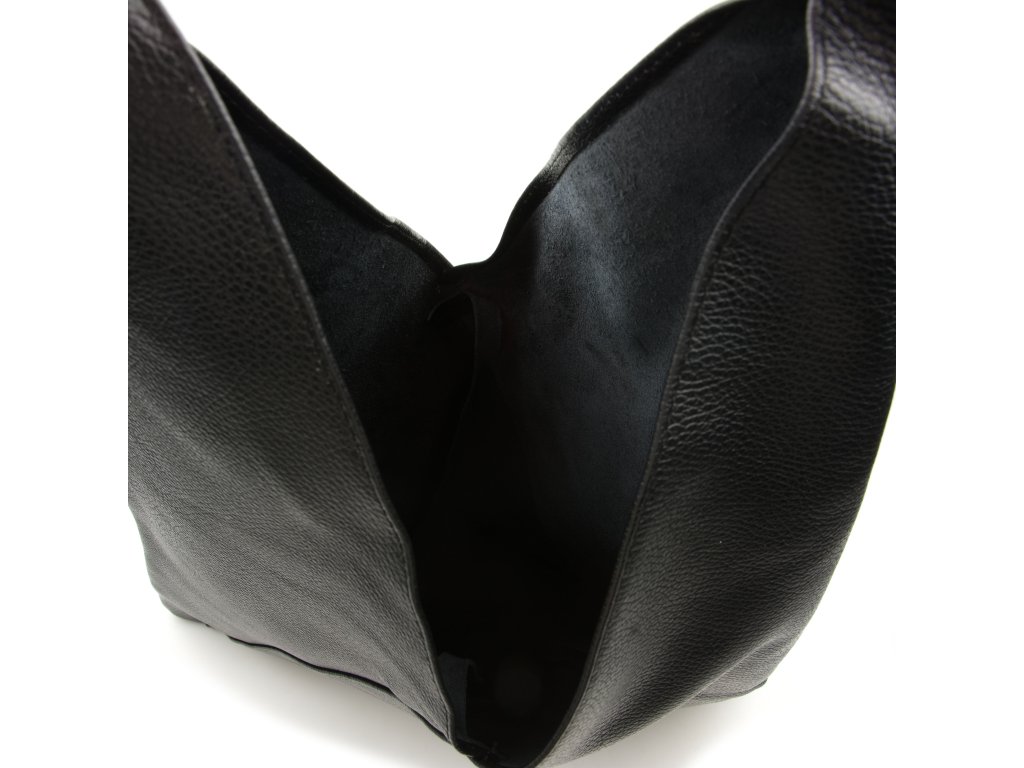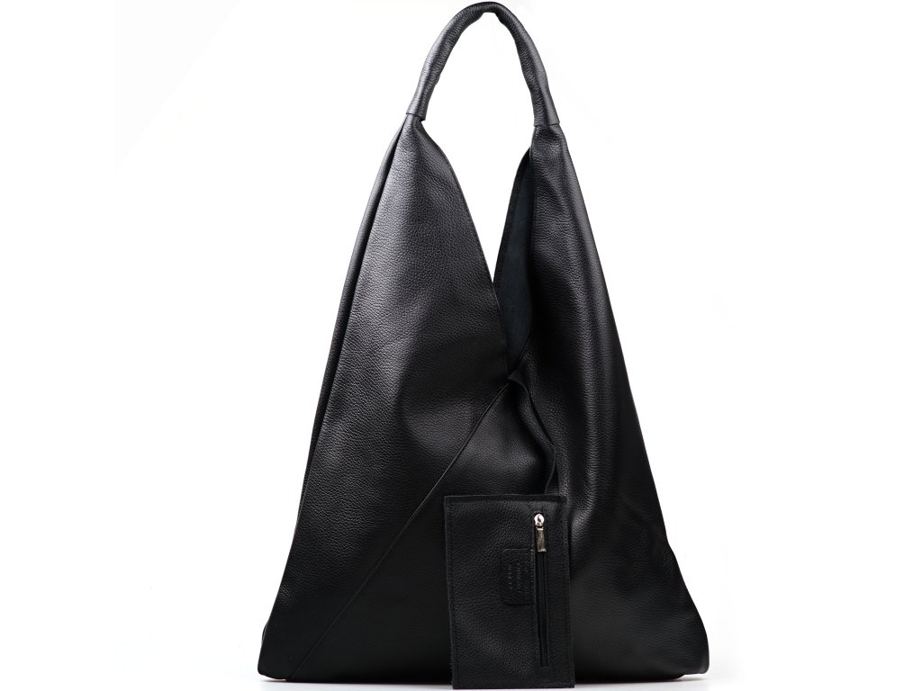 Kožená minimalistická maxi kabelka přes rameno v černé barvě je ideálním kouskem pro ty, kteří preferují jednoduchost a styl. Její unikátní geometrický trojúhelníkový tvar přitahuje pozornost a dodává vašemu outfitu moderní nádech. Uvnitř kabelky najdete prostornou hlavní kapsu, která pojme všechny vaše nezbytnosti, a menší kapsičku, ideální pro drobnosti jako jsou klíče nebo rtěnka. Kabelka se uzavírá originálním způsobem a to svázáním kožených šňůrek.