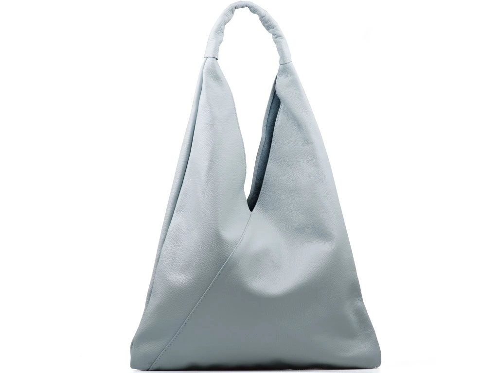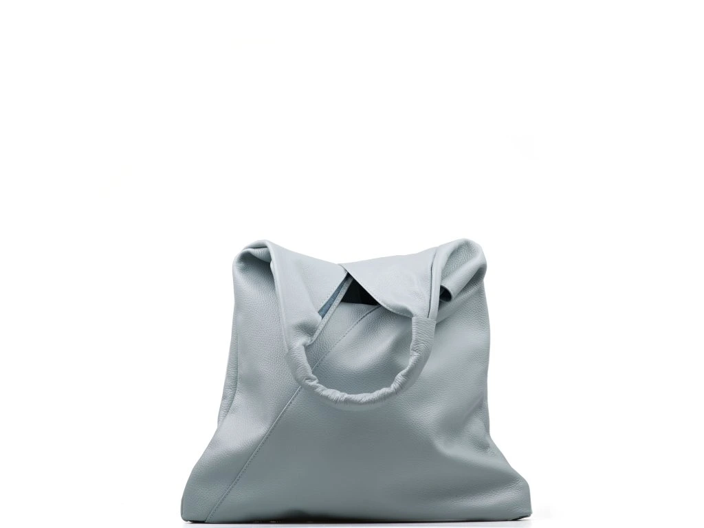 Kožená minimalistická maxi kabelka přes rameno ve světle modré barvě je ideálním kouskem pro ty, kteří preferují jednoduchost a styl. Její unikátní geometrický trojúhelníkový tvar přitahuje pozornost a dodává vašemu outfitu moderní nádech. Uvnitř kabelky najdete prostornou hlavní kapsu, která pojme všechny vaše nezbytnosti, a menší kapsičku, ideální pro drobnosti jako jsou klíče nebo rtěnka. Kabelka se uzavírá originálním způsobem a to svázáním kožených šňůrek.