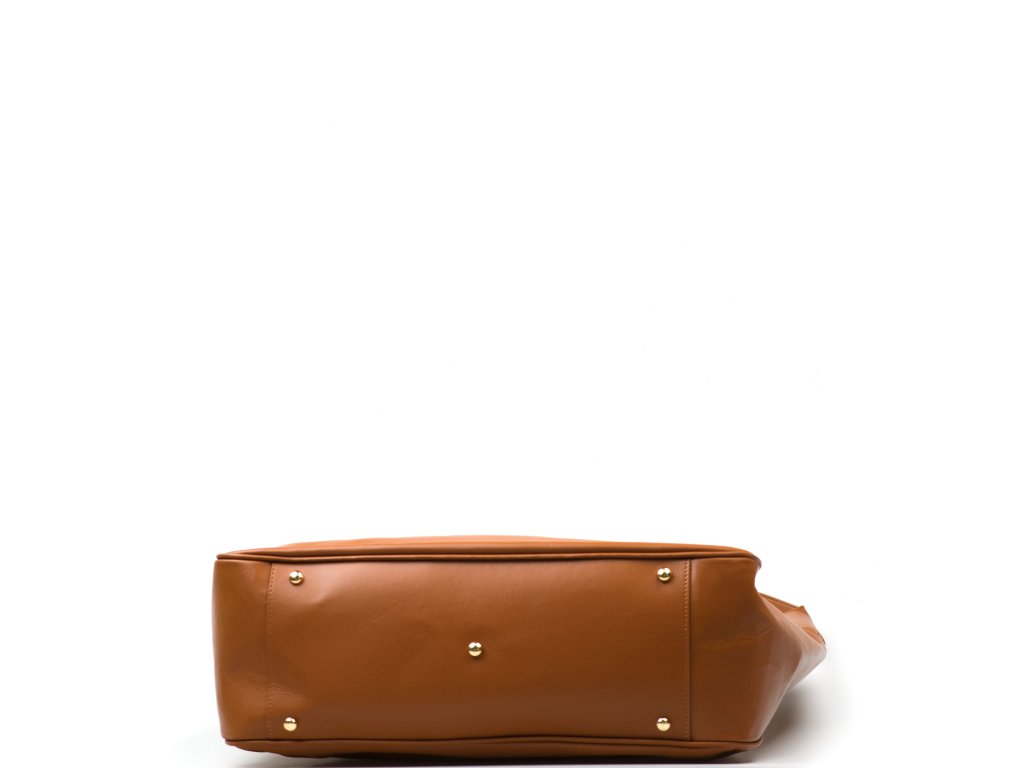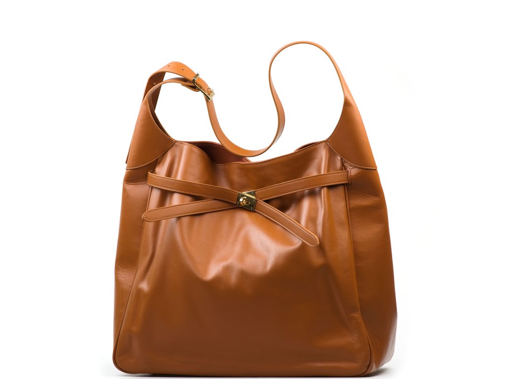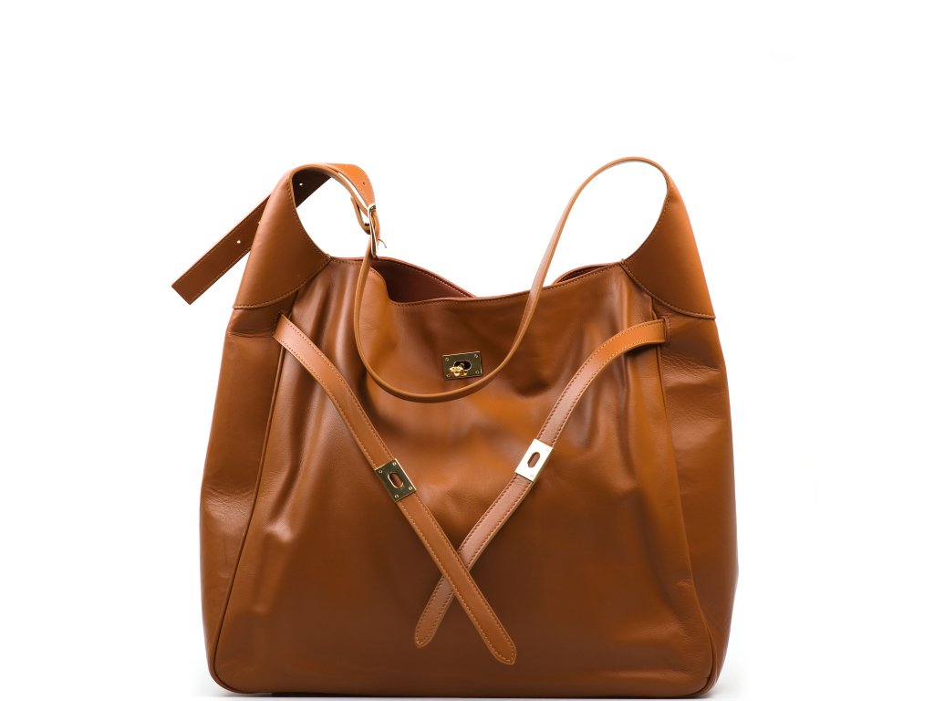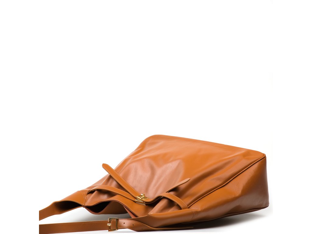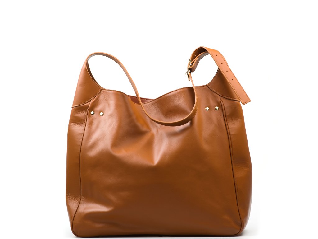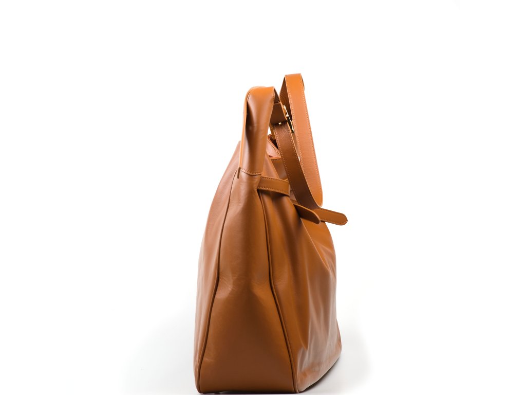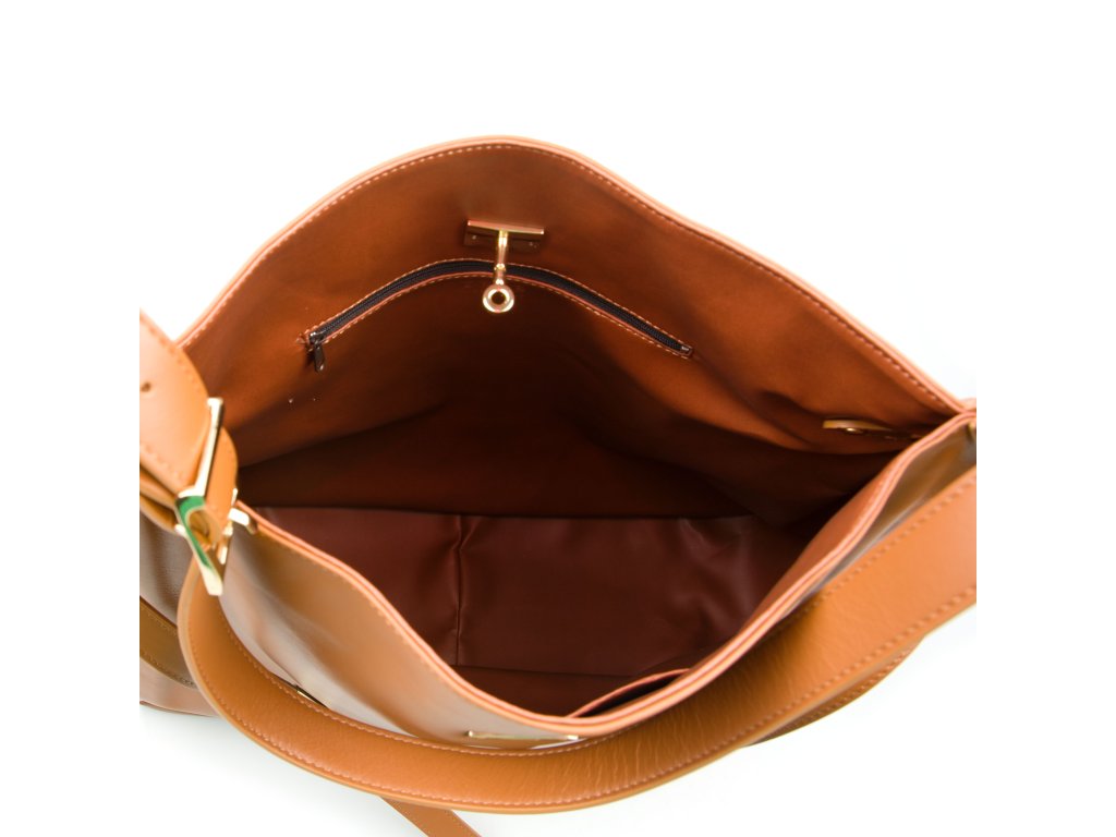 Velká kožená kabelka přes rameno v koňakově hnědé barvě. Interiér kabelky má k dispozici jednu úložnou kapsu a jednu malou boční na drobné věci, která se uzavírá zipem. Kabelka se uzavírá ozdobným klipem.