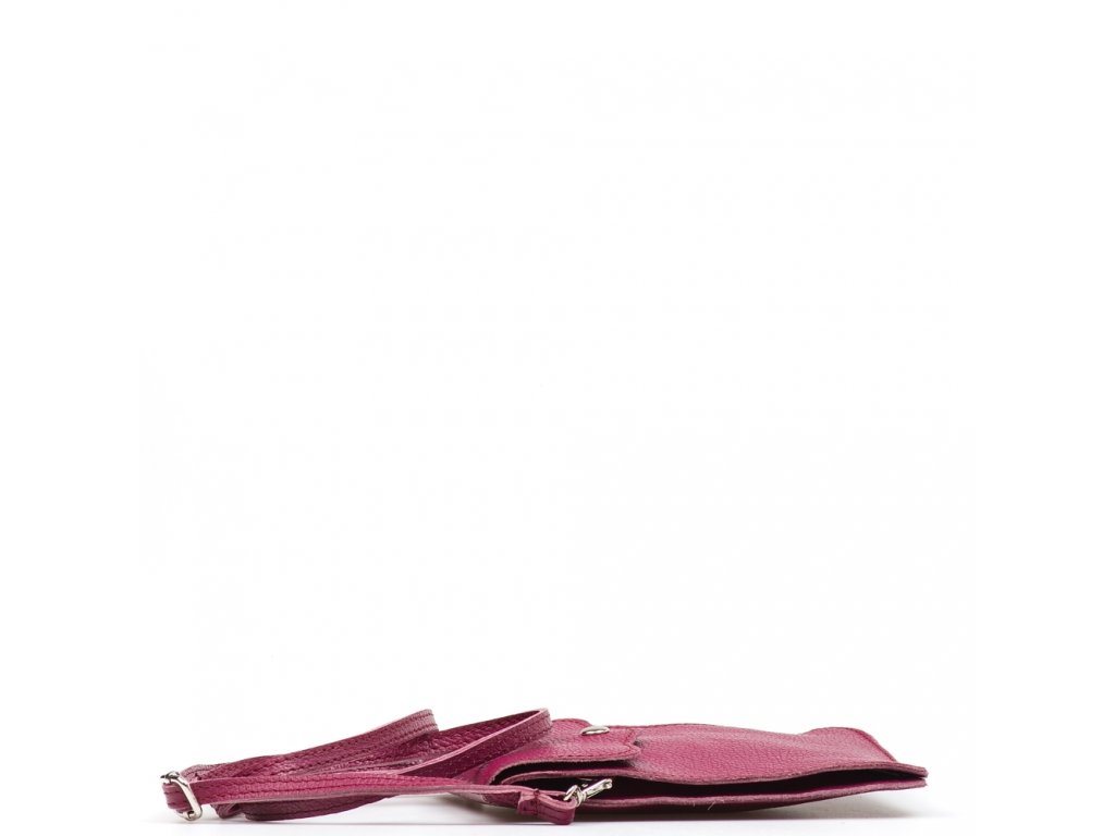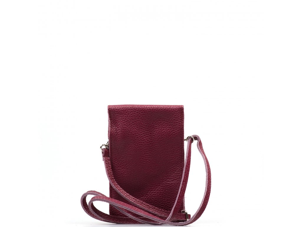 Kožená mini kabelka na telefon a drobnosti v bordó barvě. Součástí kabelky je přídavný popruh s karabinami. Interiér kabelky má dvě kapsy. Kabelka se uzavírá klopou na cvoček.