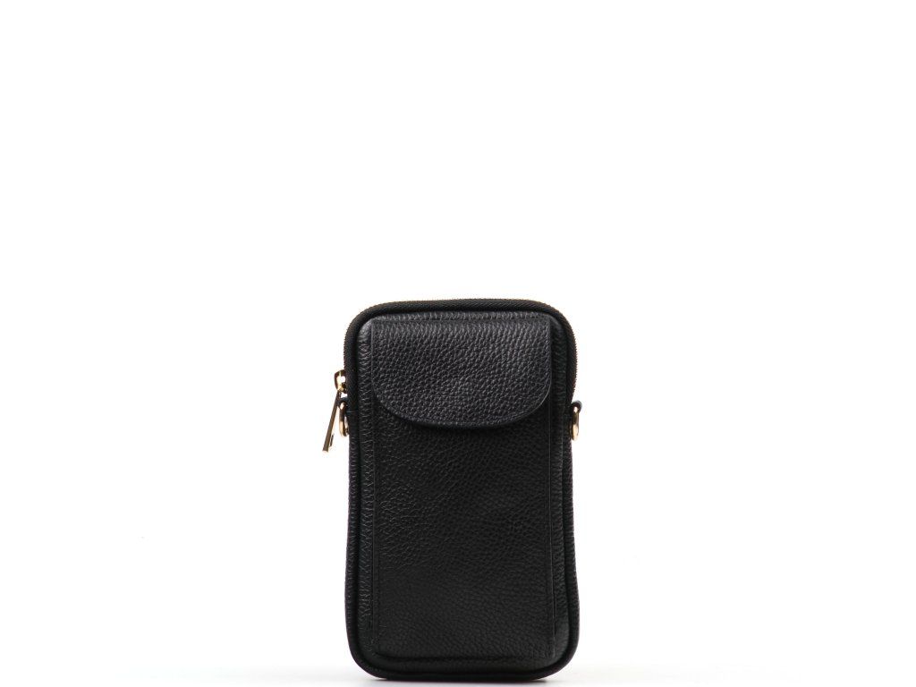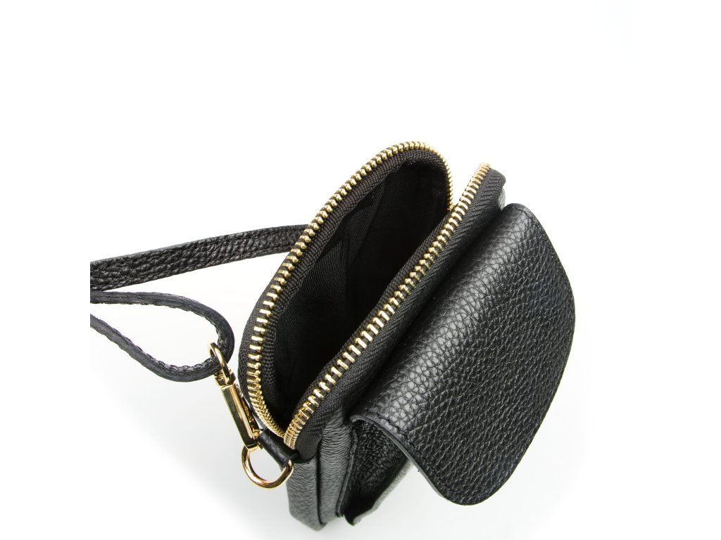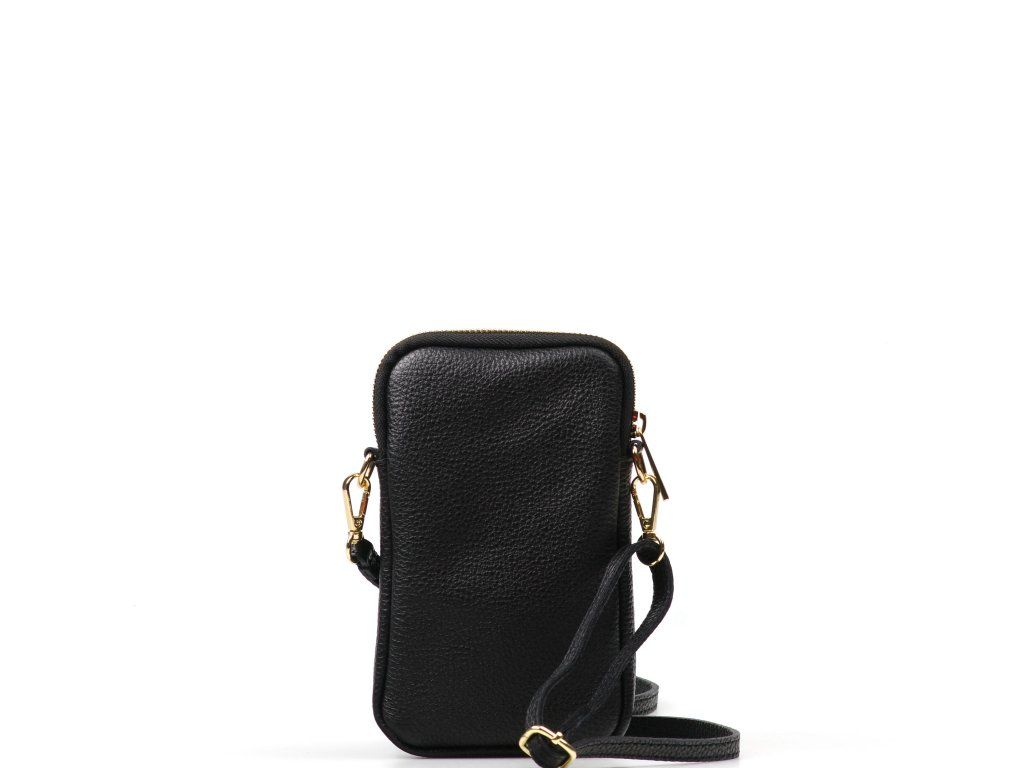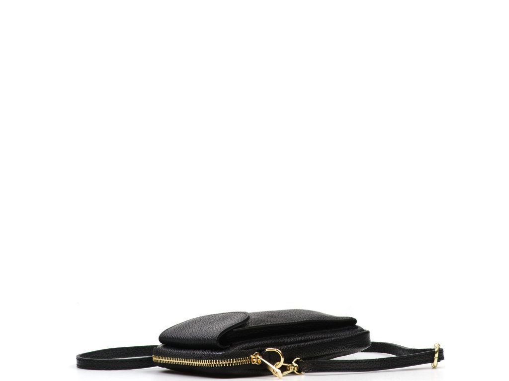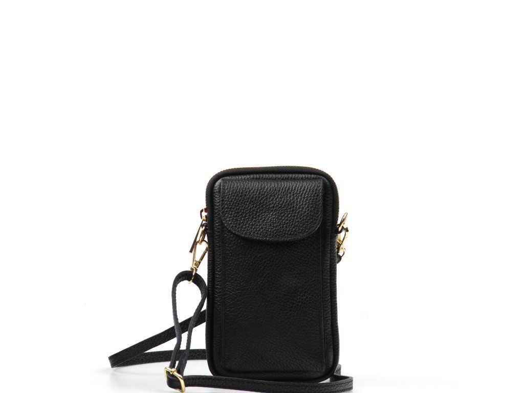 Kožená mini kabelka na telefon a drobnosti v černé barvě. Součástí kabelky je přídavný popruh s karabinami. Interiér kabelky má jednu kapsu. Na přední straně kabelky je jedna funkční kapsa, která se uzavírá klopou na cvoček. Kabelka se uzavírá zipem.