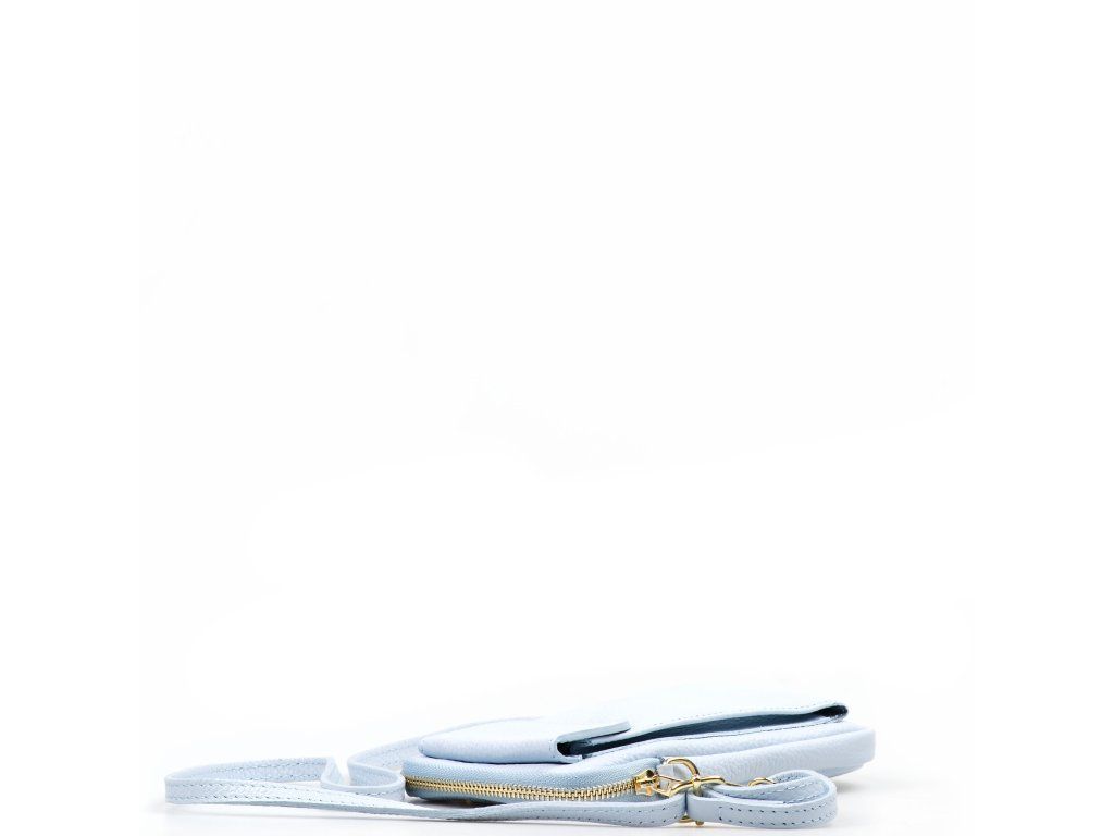 Kožená mini kabelka na telefon a drobnosti ve světle modré barvě. Součástí kabelky je přídavný popruh s karabinami. Interiér kabelky má jednu kapsu. Na přední straně kabelky je jedna funkční kapsa, která se uzavírá klopou na cvoček. Kabelka se uzavírá zipem.