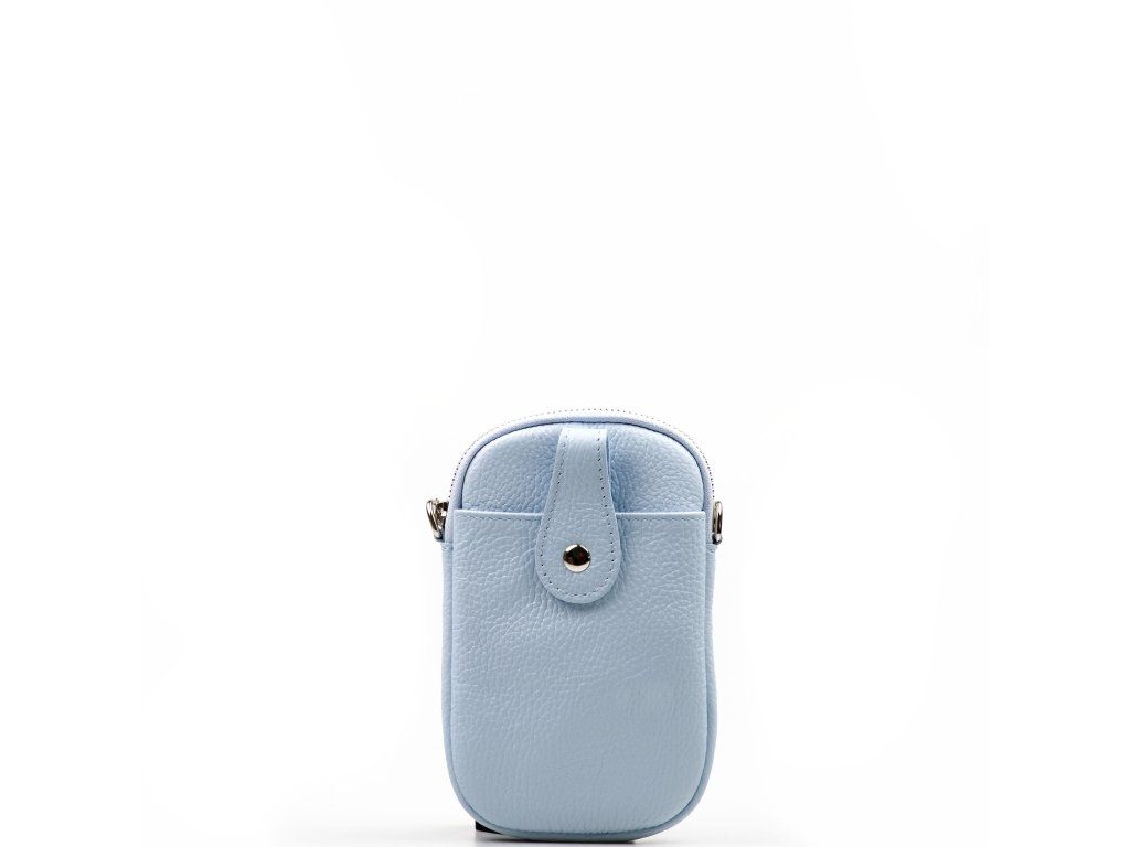 Kožená mini kabelka na telefon a drobnosti ve světle modré barvě. Součástí kabelky je přídavný popruh s karabinami. Interiér kabelky má jednu kapsu. Na přední straně kabelky je jedna funkční kapsa, která se uzavírá klopou na cvoček. Kabelka se uzavírá zipem.