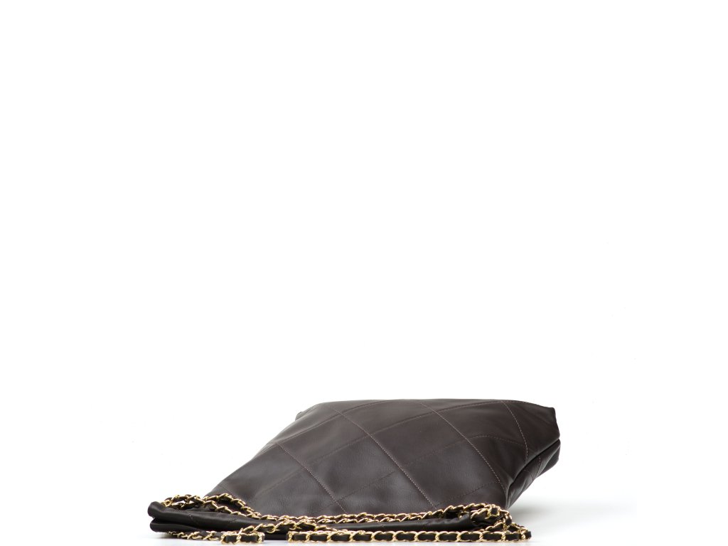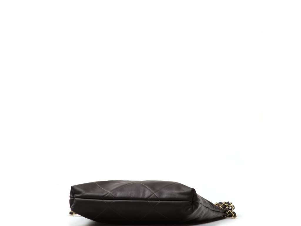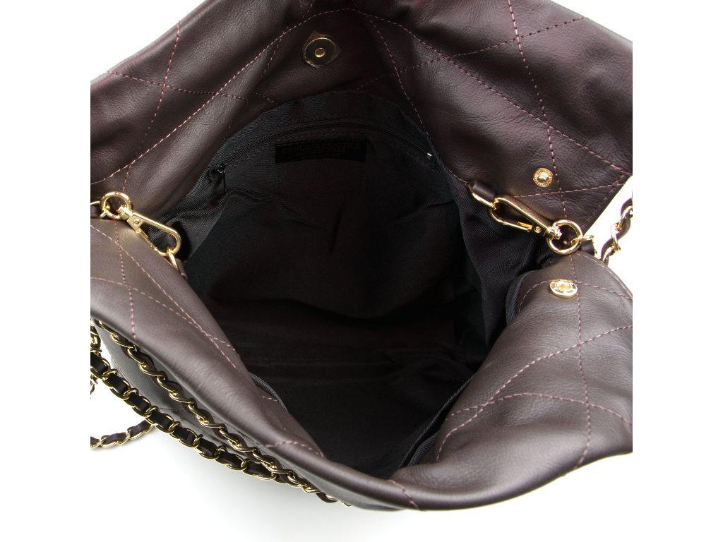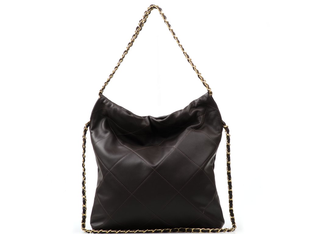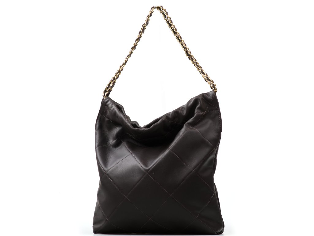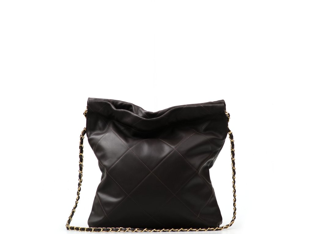 Prošívaná kožená kabelka přes rameno pro volný čas v hnědé barvě s řetízkovými uchy. Součástí kabelky je přídavný řetízkový popruh pro nošení přes tělo. Interiér kabelky disponuje jednou úložnou kapsou a malou boční na zip. Kabelku zdobí její prošívaný vzhled. Kabelka se uzavírá zipem.