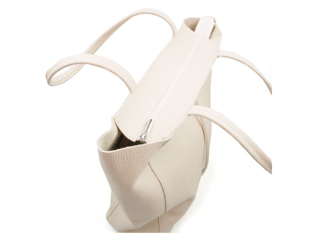 Velká kožená shopper kabelka v béžové barvě. Minimalistická a prostorná taška ideální pro volný čas i každodenní nošení. Nabízí jednu hlavní úložnou kapsu a menší boční kapsu pro drobnosti. V horní části se uzavírá zipem a navíc se stahuje koženou šňůrkou, která dodává kabelce elegantní detail a zvyšuje bezpečnost uložení věcí.
