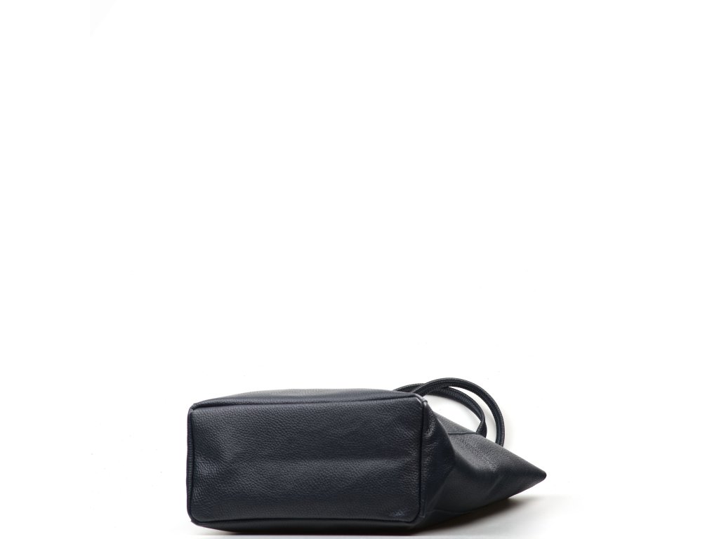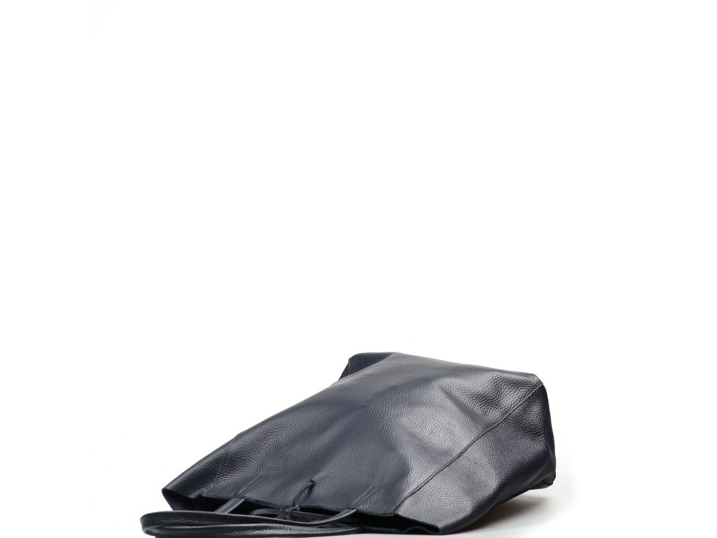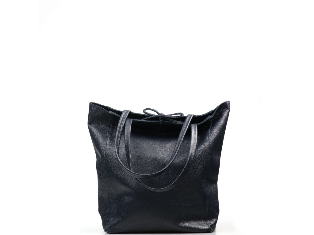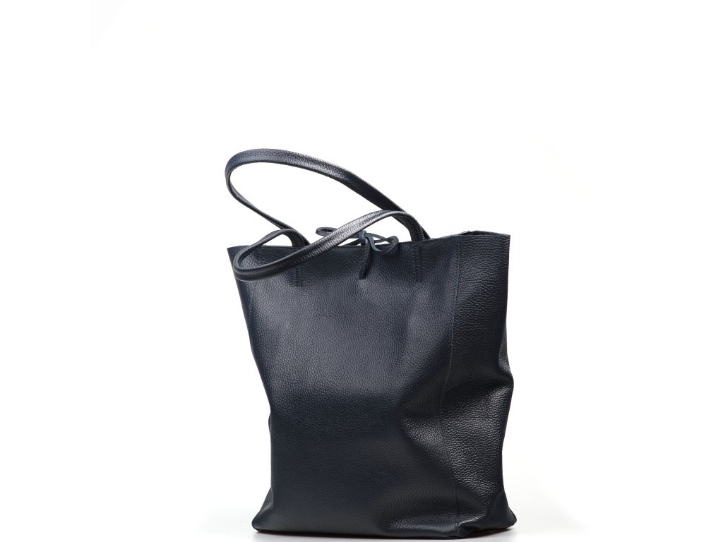 Velká kožená shopper kabelka v tmavě modré barvě. Minimalistická a prostorná taška ideální pro volný čas i každodenní nošení. Nabízí jednu hlavní úložnou kapsu a menší boční kapsu pro drobnosti. V horní části se uzavírá zipem a navíc se stahuje koženou šňůrkou, která dodává kabelce elegantní detail a zvyšuje bezpečnost uložení věcí.