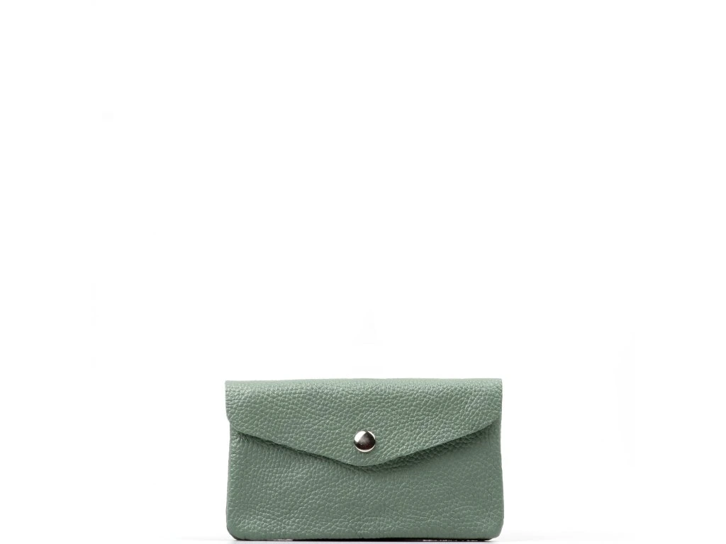 Dámské kožené pouzdro v mentolové barvě. Pouzdro má k dispozici tři kapsy, přičemž jedna je určena na mince či drobnosti a je uzavíratelná zipem. Pouzdro je uzavíratelné cvokem.