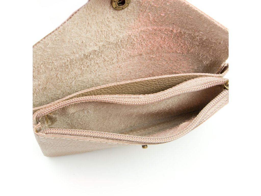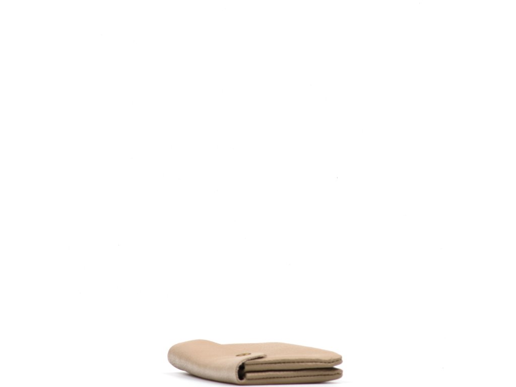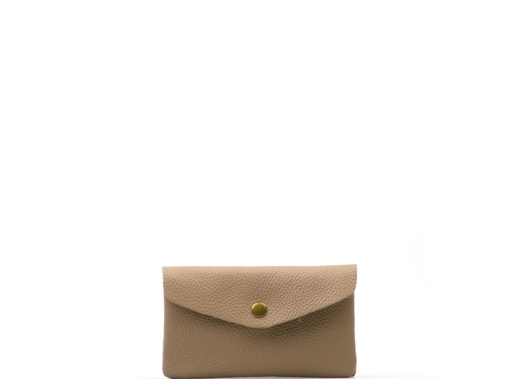 Dámské kožené pouzdro v taupe barvě. Pouzdro má k dispozici tři kapsy, přičemž jedna je určena na mince či drobnosti a je uzavíratelná zipem. Pouzdro je uzavíratelné cvokem.