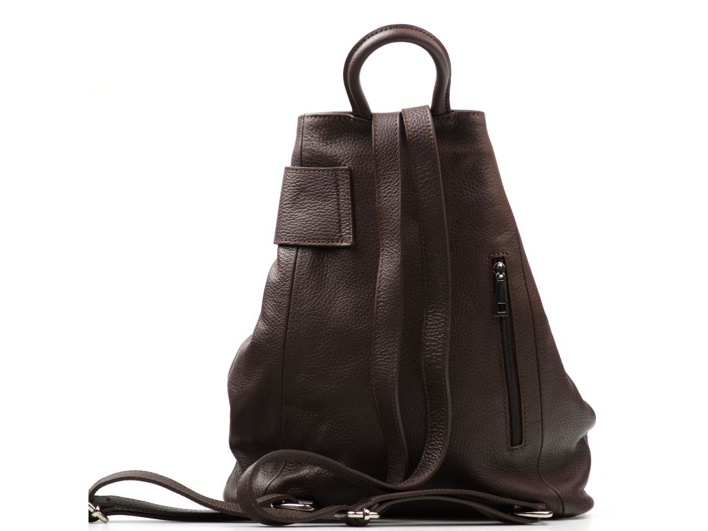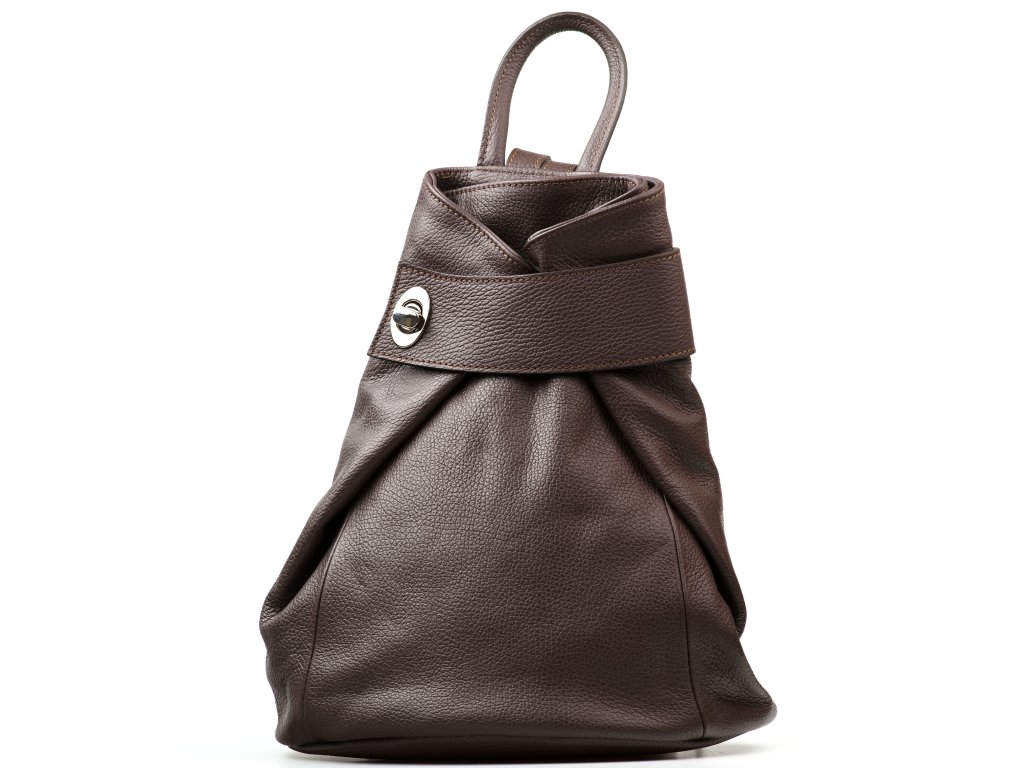 Dámský kožený batůžek v hnědé barvě. Zadní strana kabelky je vybavena funkční kapsou na zip. Kování je stříbrné. Horní část batůžku se překládá a zavírá sponou. Interiér kabelky disponuje jednou úložnou kapsou a malými po vnitřních bocích. Batůžek se zavírá zipem.