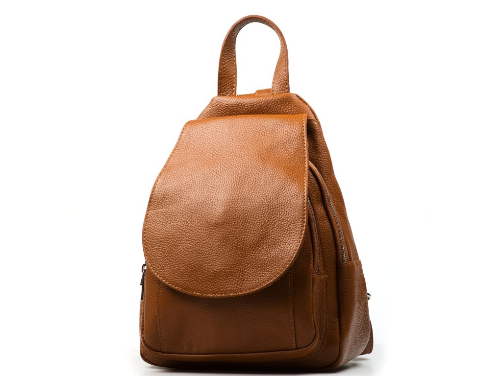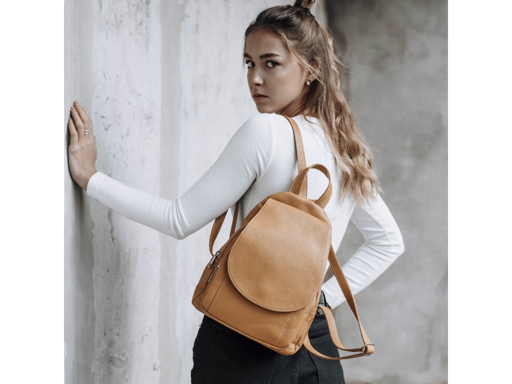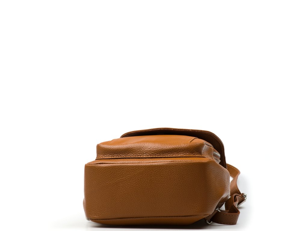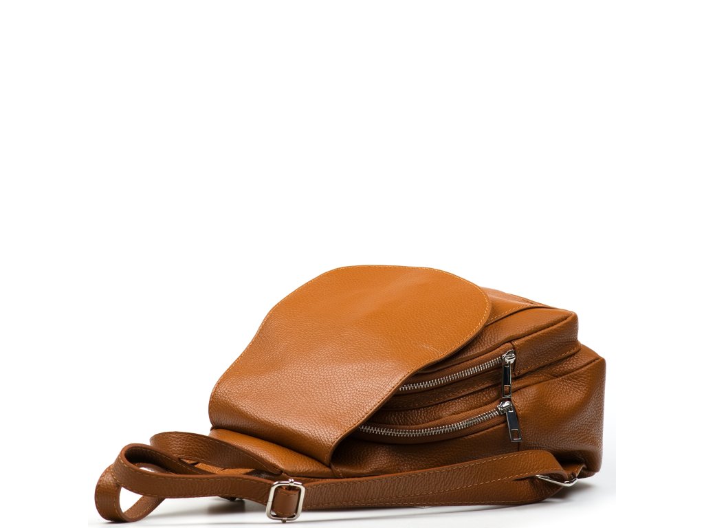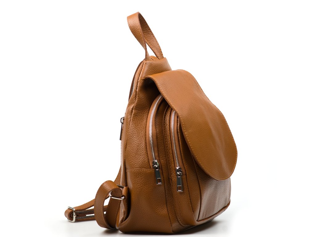 Dámský kožený městský batůžek v koňakově hnědé barvě. Praktický a elegantní batůžek s dostatkem úložného prostoru. Batůžek má dvě úložné kapsy se samostatným vstupem s uzávěrem na zipy. Zadní strana batůžku disponuje malou úložnou kapsou na zip. Batůžek se uzavírá klopou na cvoček.