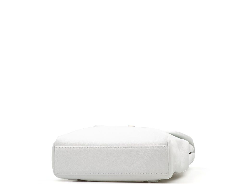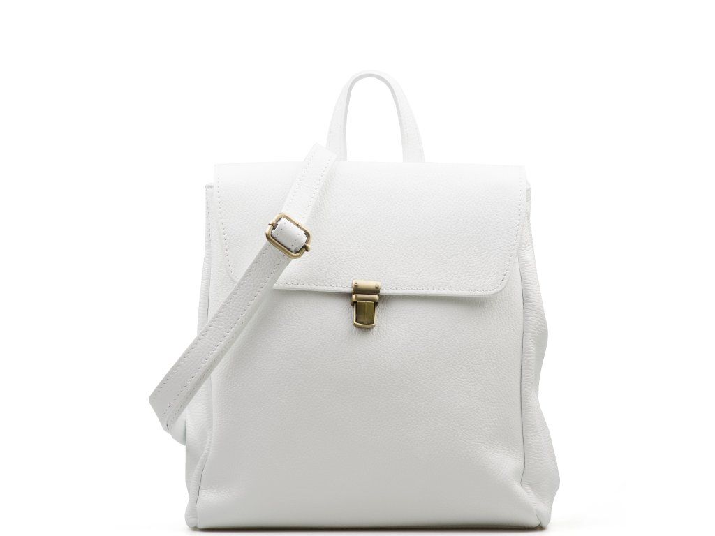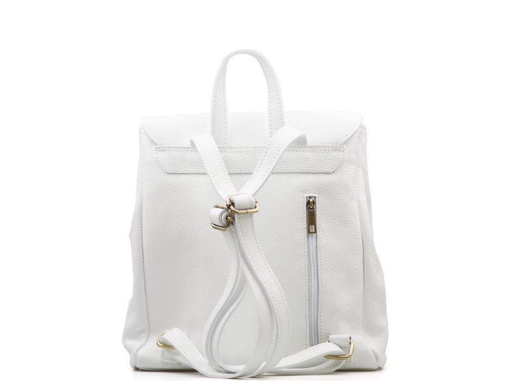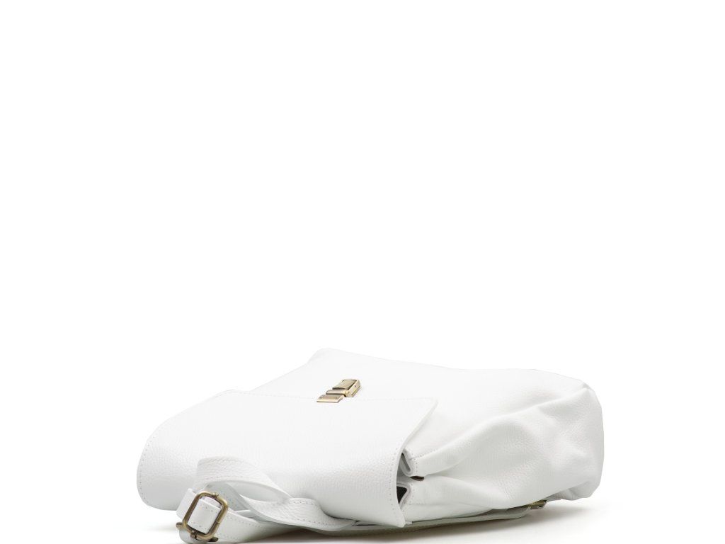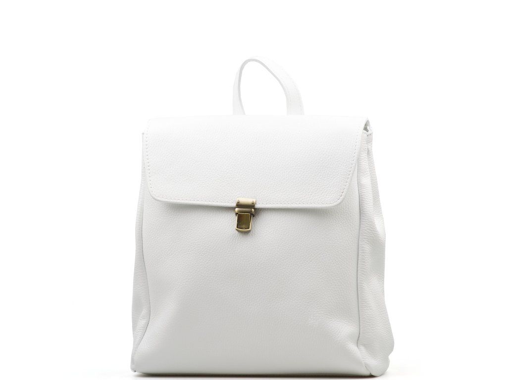 Kožený městský batůžek v bílé barvě. Ozdobou batůžku je kovové zapínání v přední části. Interiér batůžku má k dispozici jednu hlavní úložnou kapsu a malé po bocích. Batůžek má malou kapsičku ze zadní strany na drobné věci. Batůžek se uzavírá zipem a kovovým uzávěrem.
