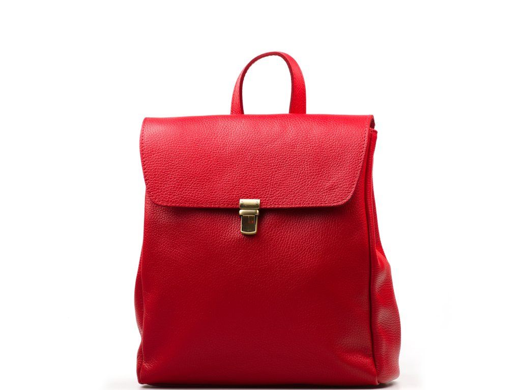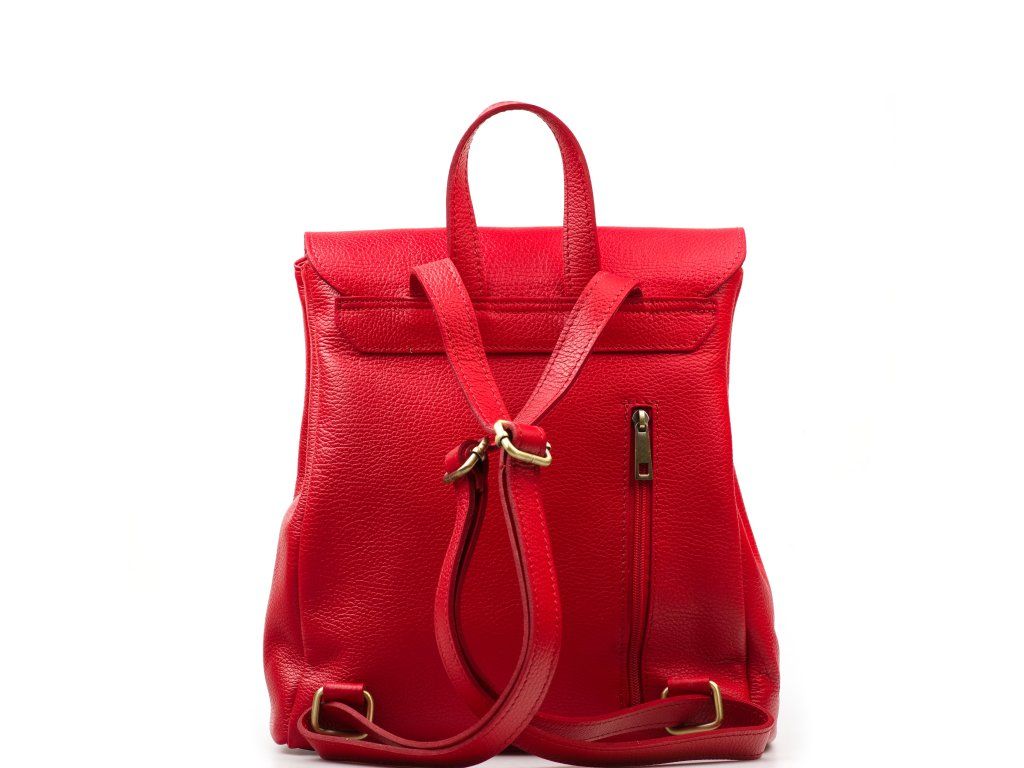 Kožený městský batůžek v červené barvě. Ozdobou batůžku je kovové zapínání v přední části. Interiér batůžku má k dispozici jednu hlavní úložnou kapsu a malé po bocích. Batůžek má malou kapsičku ze zadní strany na drobné věci. Batůžek se uzavírá zipem a kovovým uzávěrem.