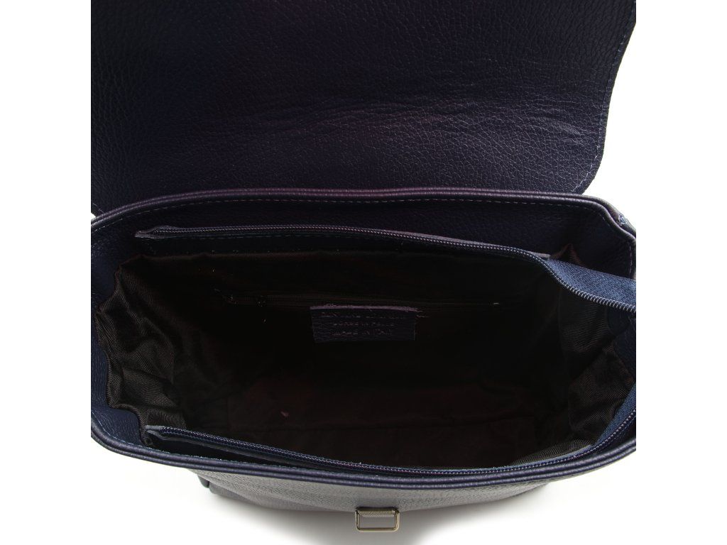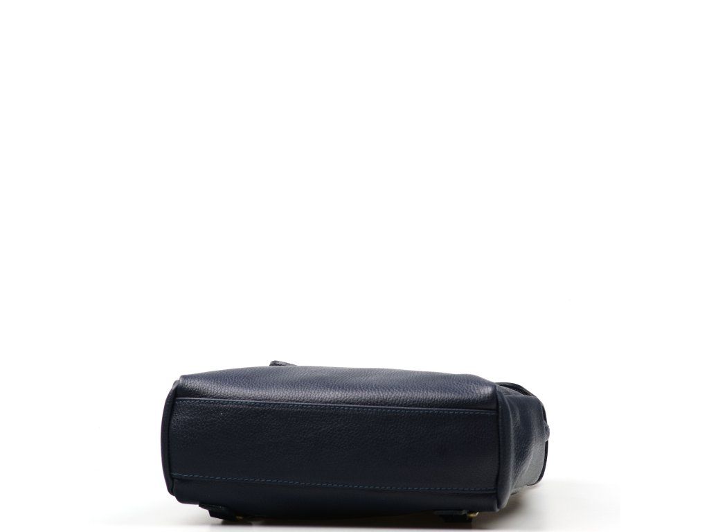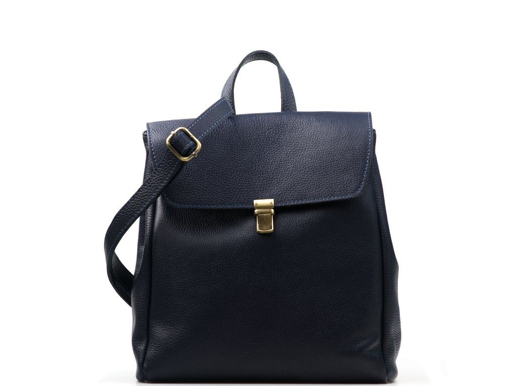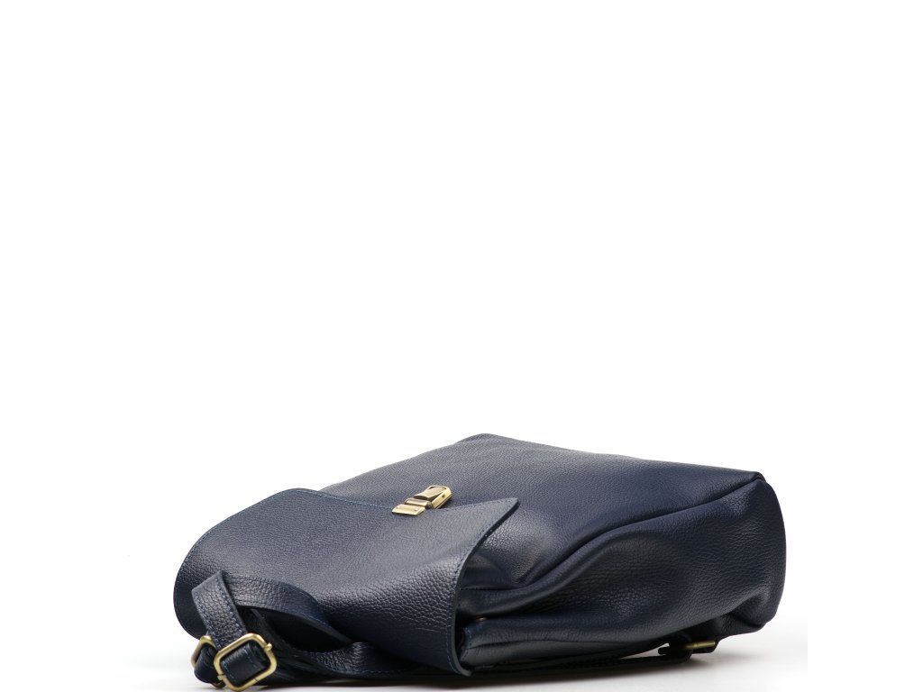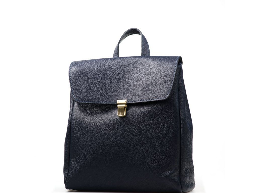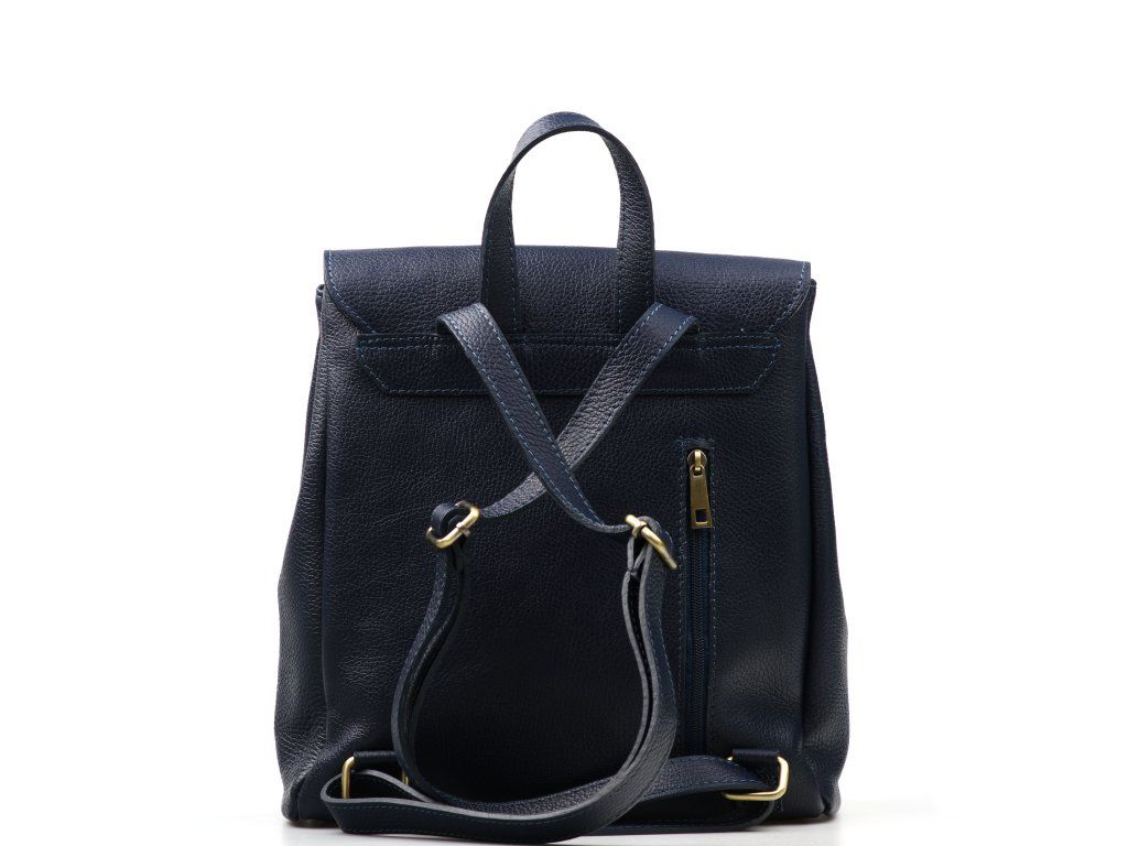 Kožený městský batůžek v modré barvě. Ozdobou batůžku je kovové zapínání v přední části. Interiér batůžku má k dispozici jednu hlavní úložnou kapsu a malé po bocích. Batůžek má malou kapsičku ze zadní strany na drobné věci. Batůžek se uzavírá zipem a kovovým uzávěrem.