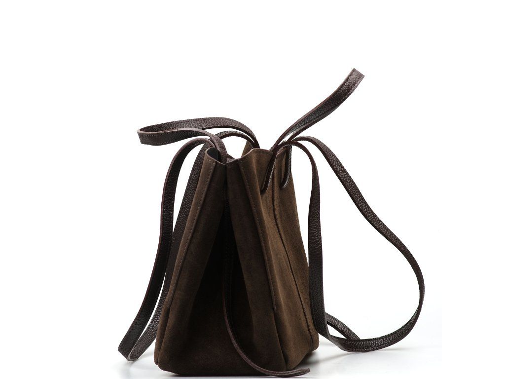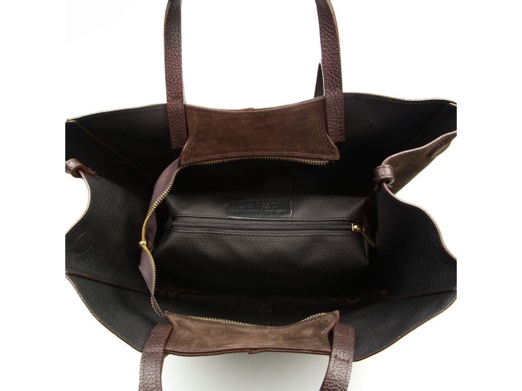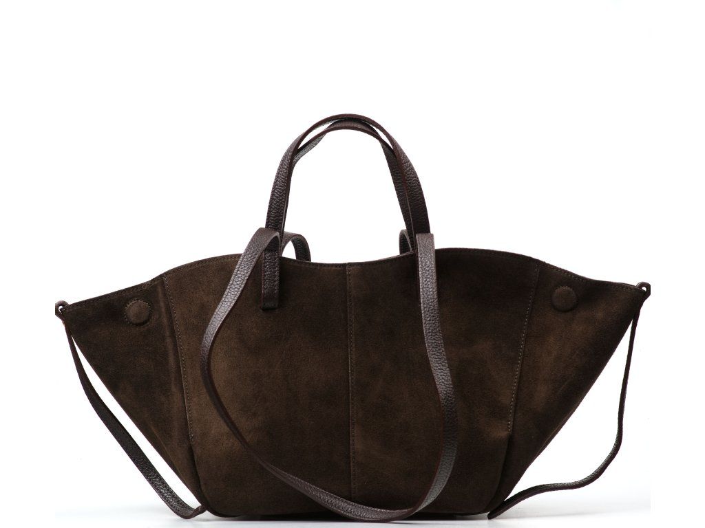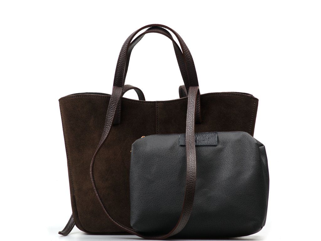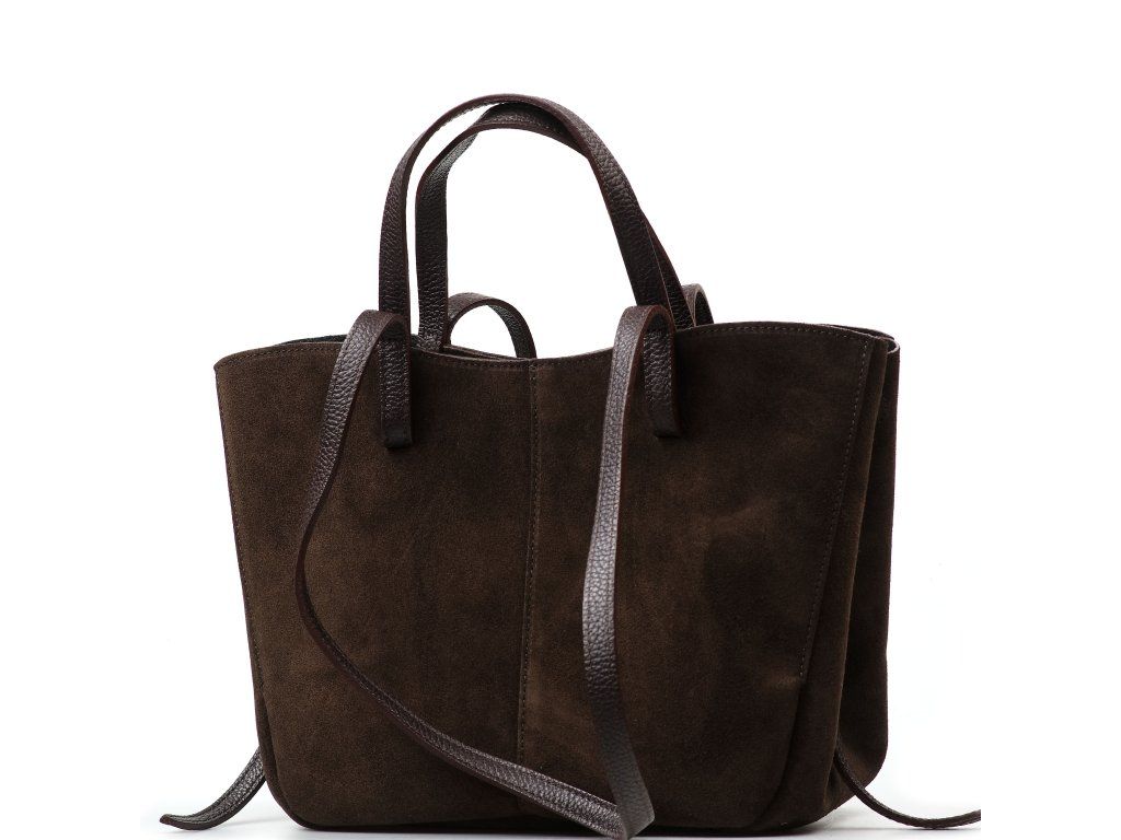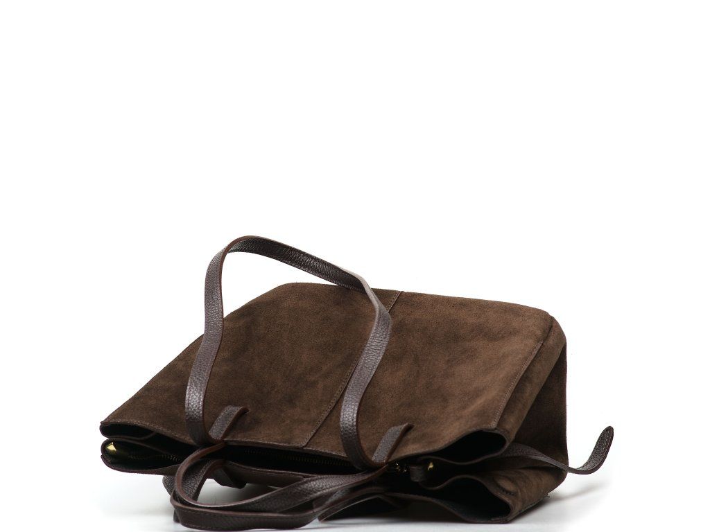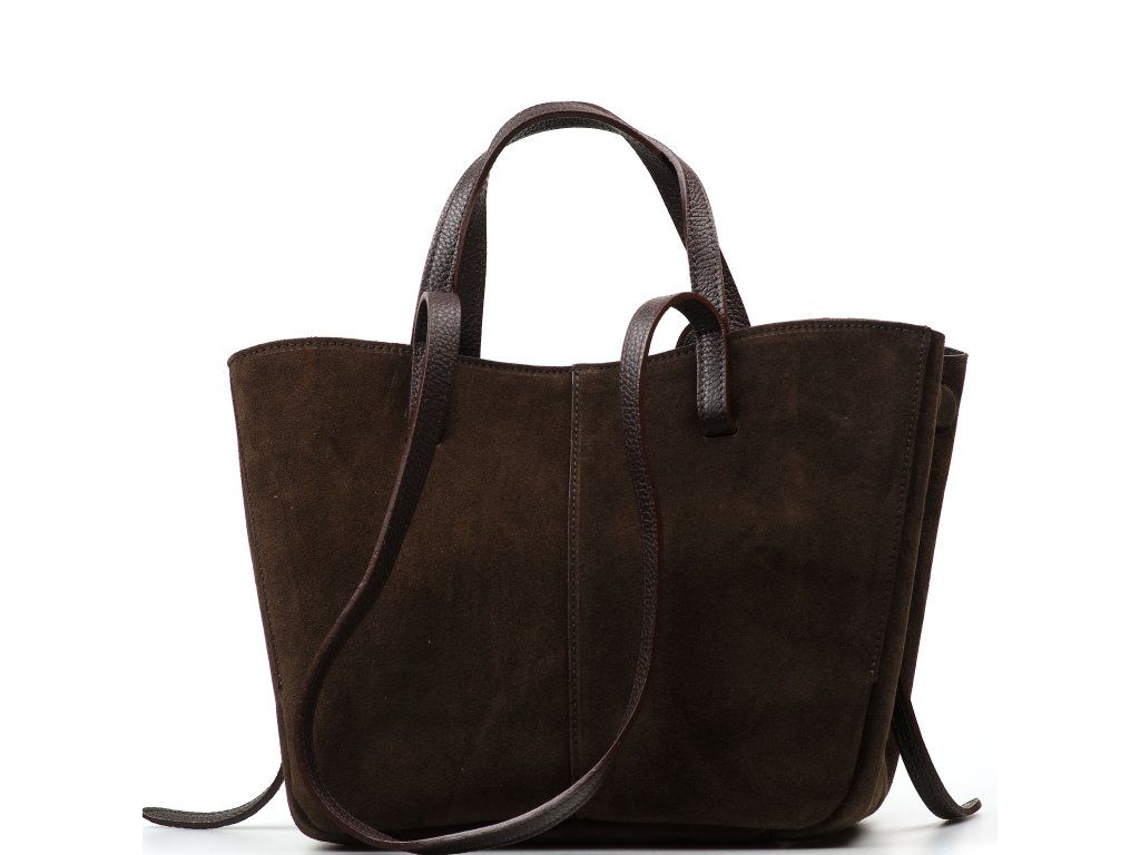 Elegantní kožená kabelka do ruky či přes rameno v hnědé barvě. Povrch kabelky má matnou semišovou úpravu, která podtrhuje její sofistikovaný vzhled. Kabelku lze nosit ve dvou tvarových variantách. Interiér disponuje jednou velkou úložnou kapsou a přídavnou volnou kapsou. Kabelka se uzavírá zipem.