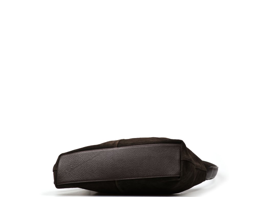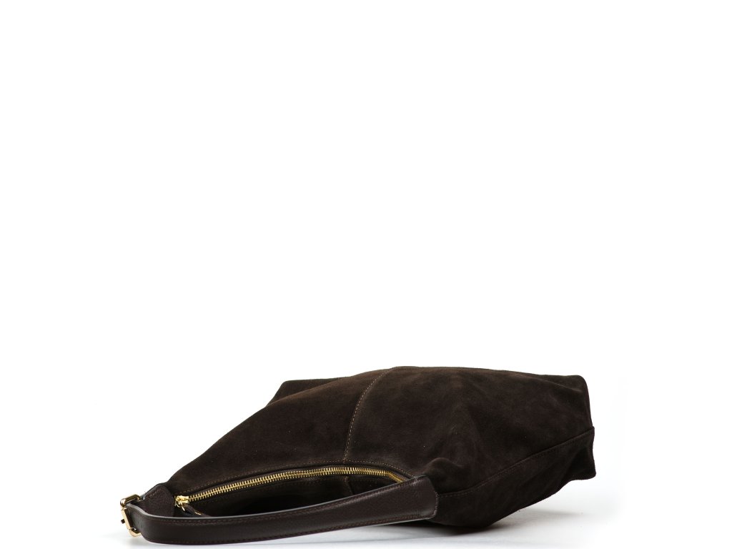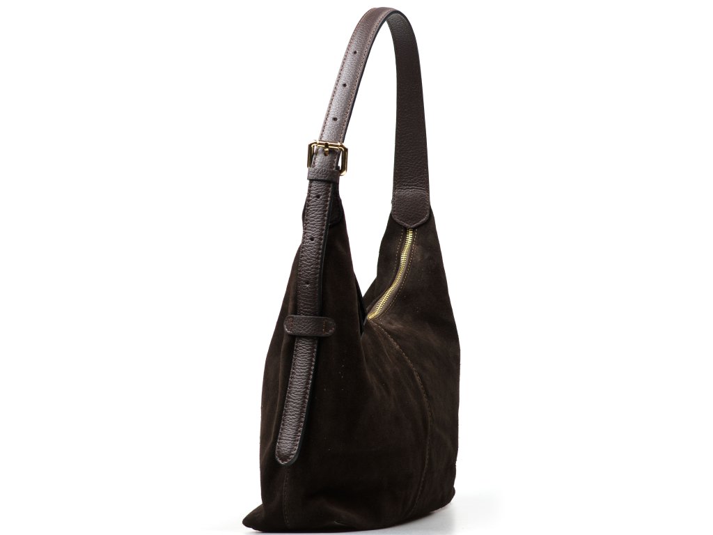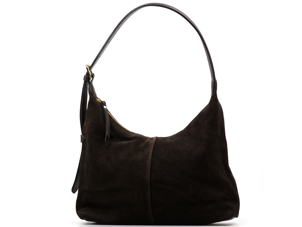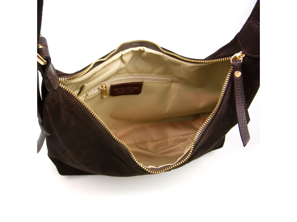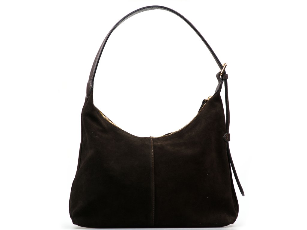 Minimalistická kožená kabelka přes rameno v tmavě hnědé barvě. Interiér kabelky má k dispozici jednu úložnou kapsu a jednu malou boční na drobné věci, která se uzavírá zipem. Kabelka se uzavírá zipem.