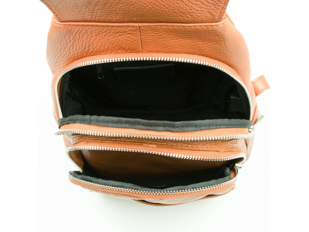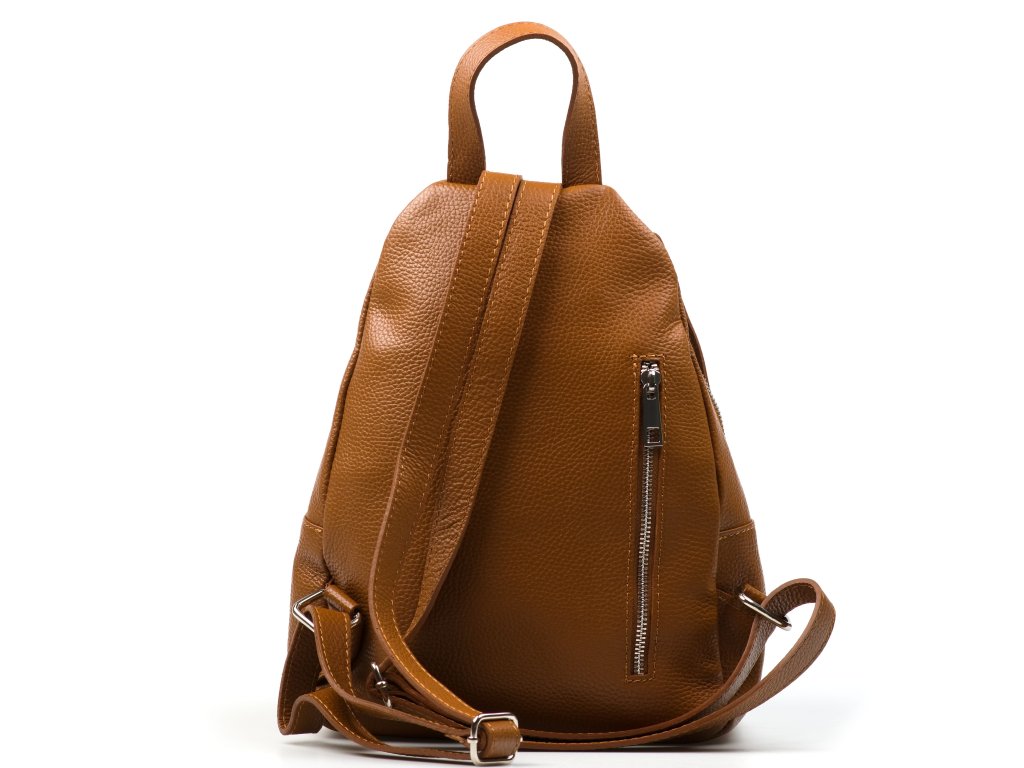 Dámský kožený městský batůžek v koňakově hnědé barvě. Praktický a elegantní batůžek s dostatkem úložného prostoru. Batůžek má dvě úložné kapsy se samostatným vstupem s uzávěrem na zipy. Zadní strana batůžku disponuje malou úložnou kapsou na zip. Batůžek se uzavírá klopou na cvoček.